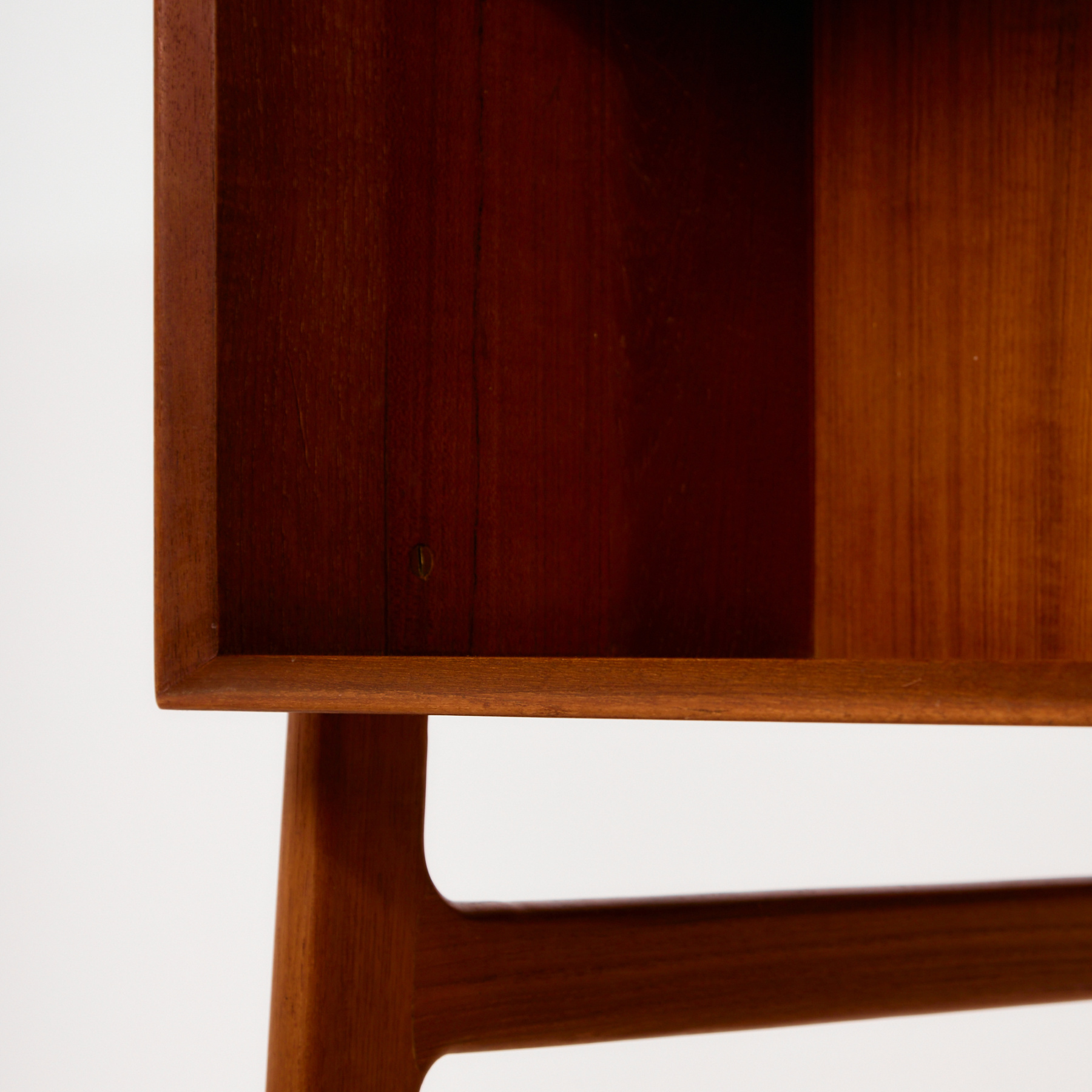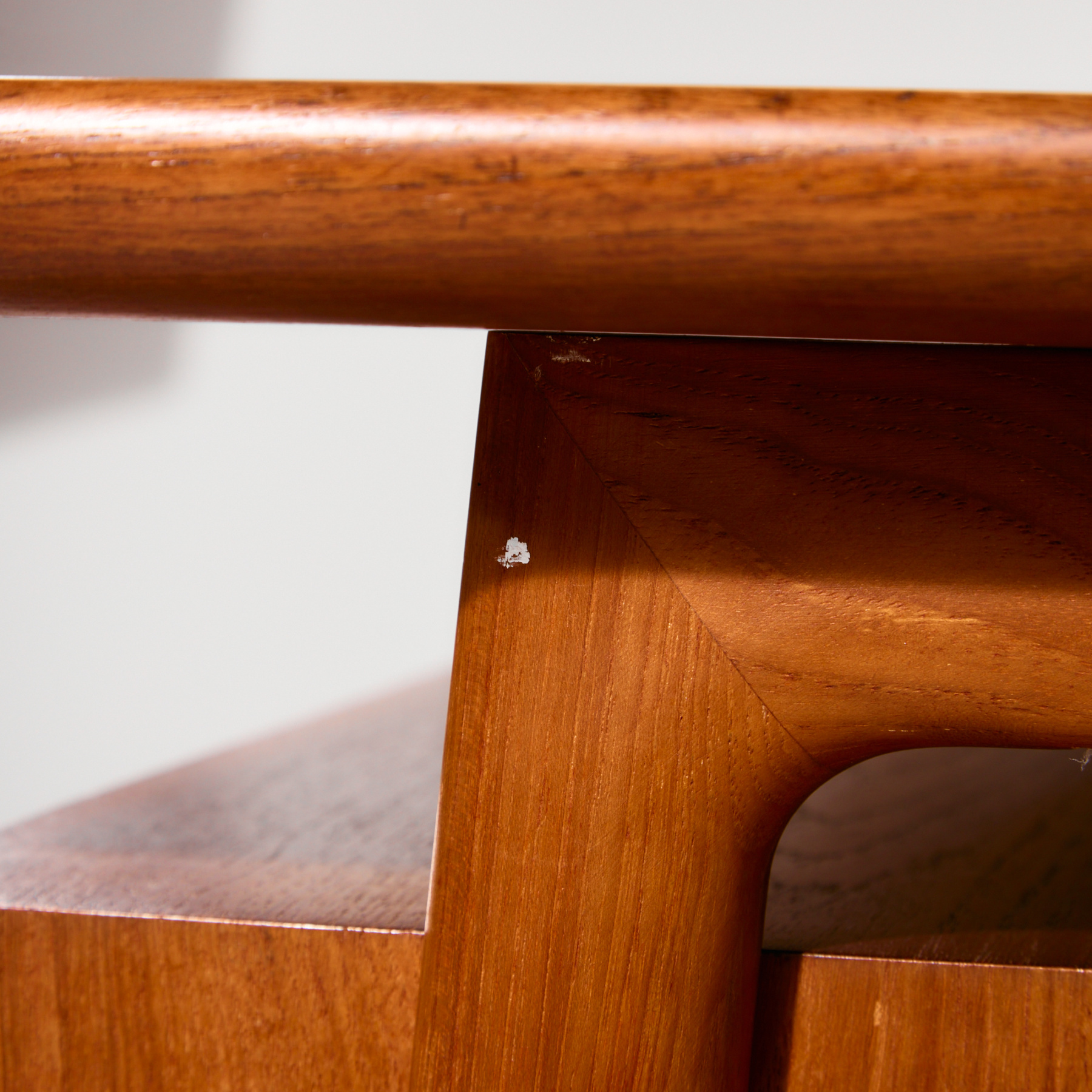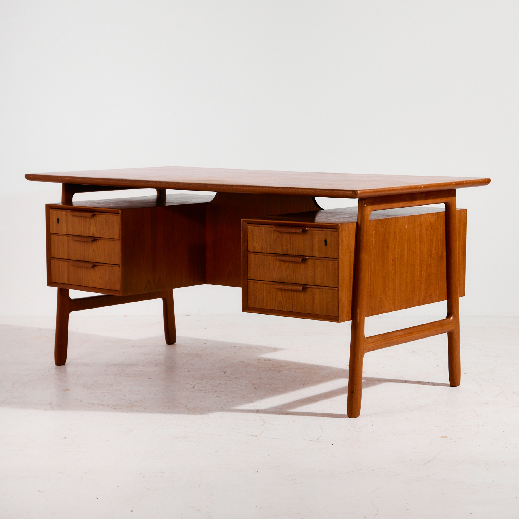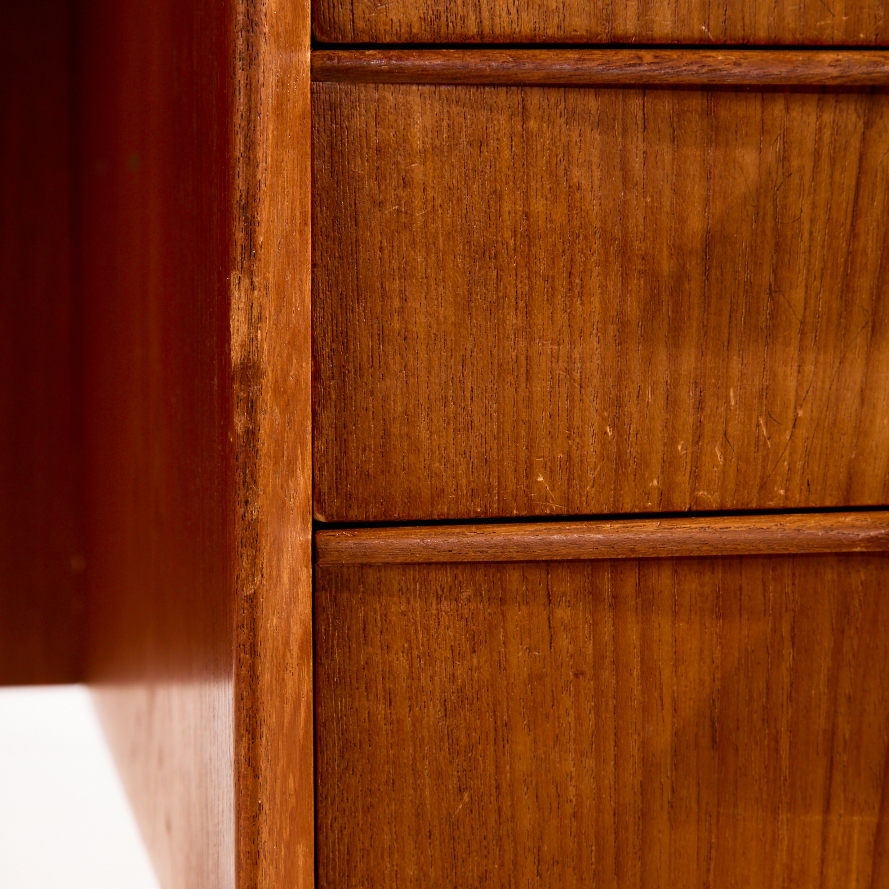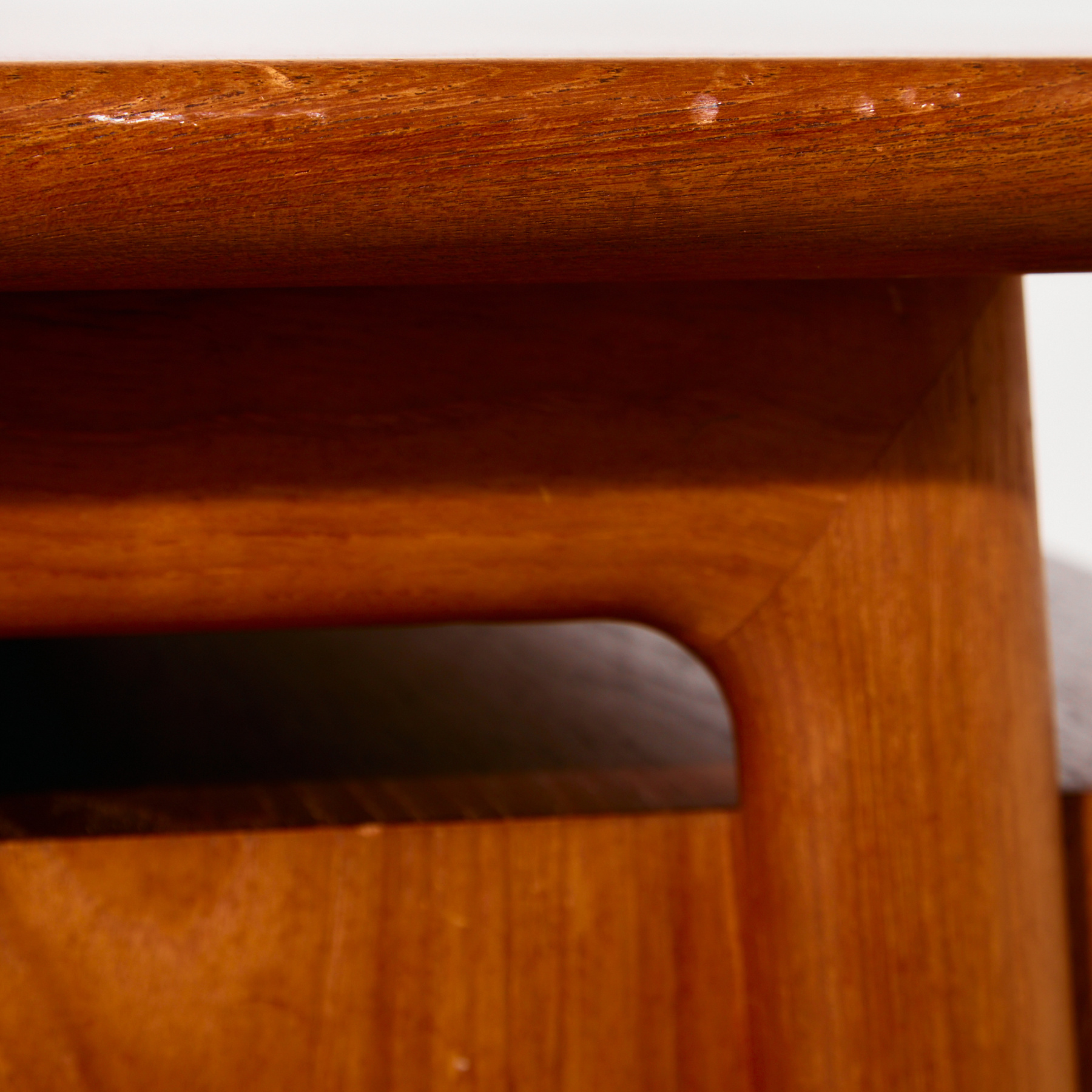 Gunni Omann által az Omann Jun Møbelfabrik számára tervezett ‘Modell 75’ teak íróasztal az 1960-as évekből. Az asztal hat fiókkal, hátán kettő nyitott polccal ellátott. A bútor formai kialakításának és anyaghasználatának köszönhetően egyszerre elegáns és időtlen darab. Felületén helyenként karcokkal, foltokkal és kopásokkal.