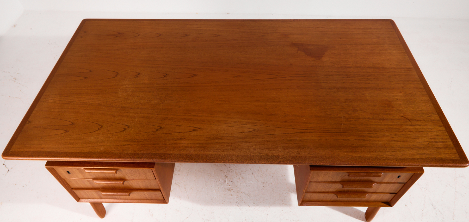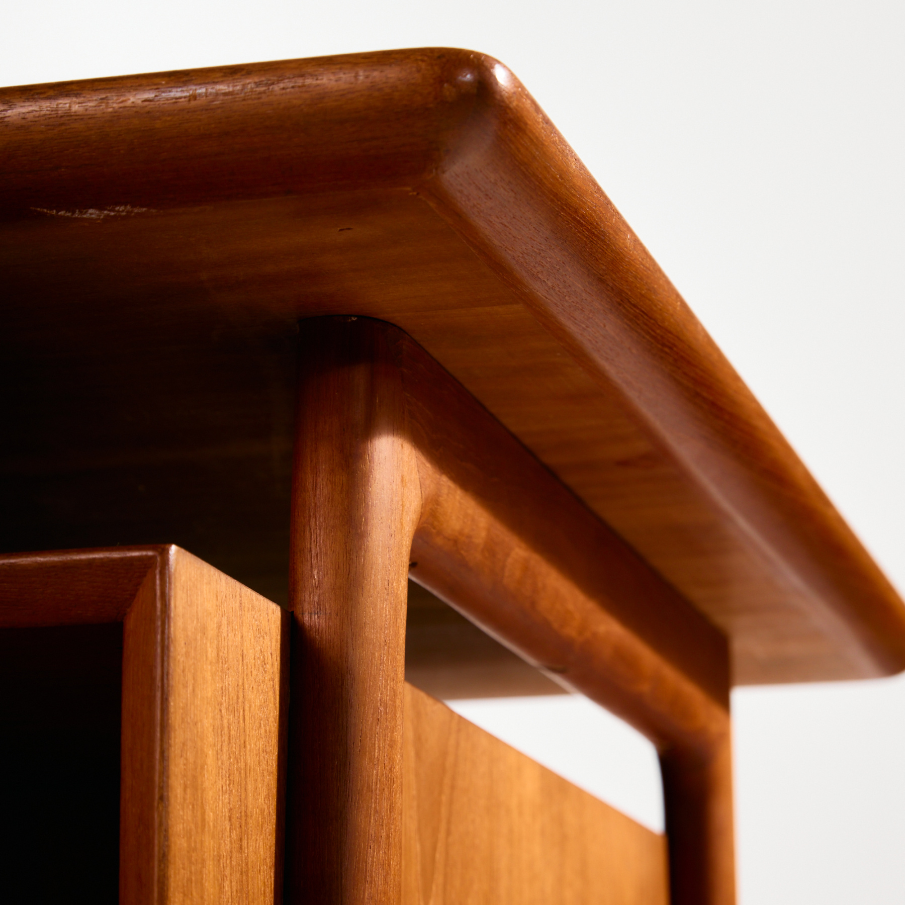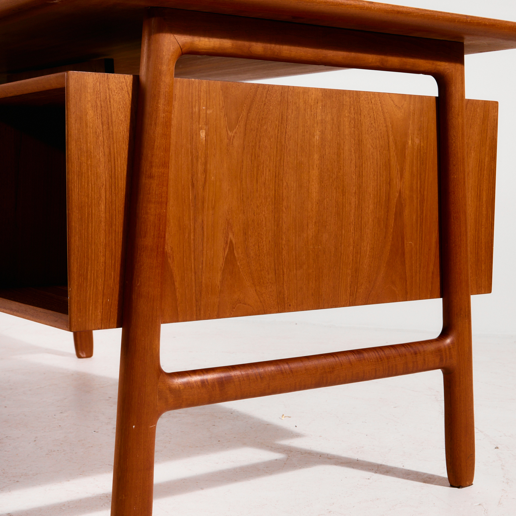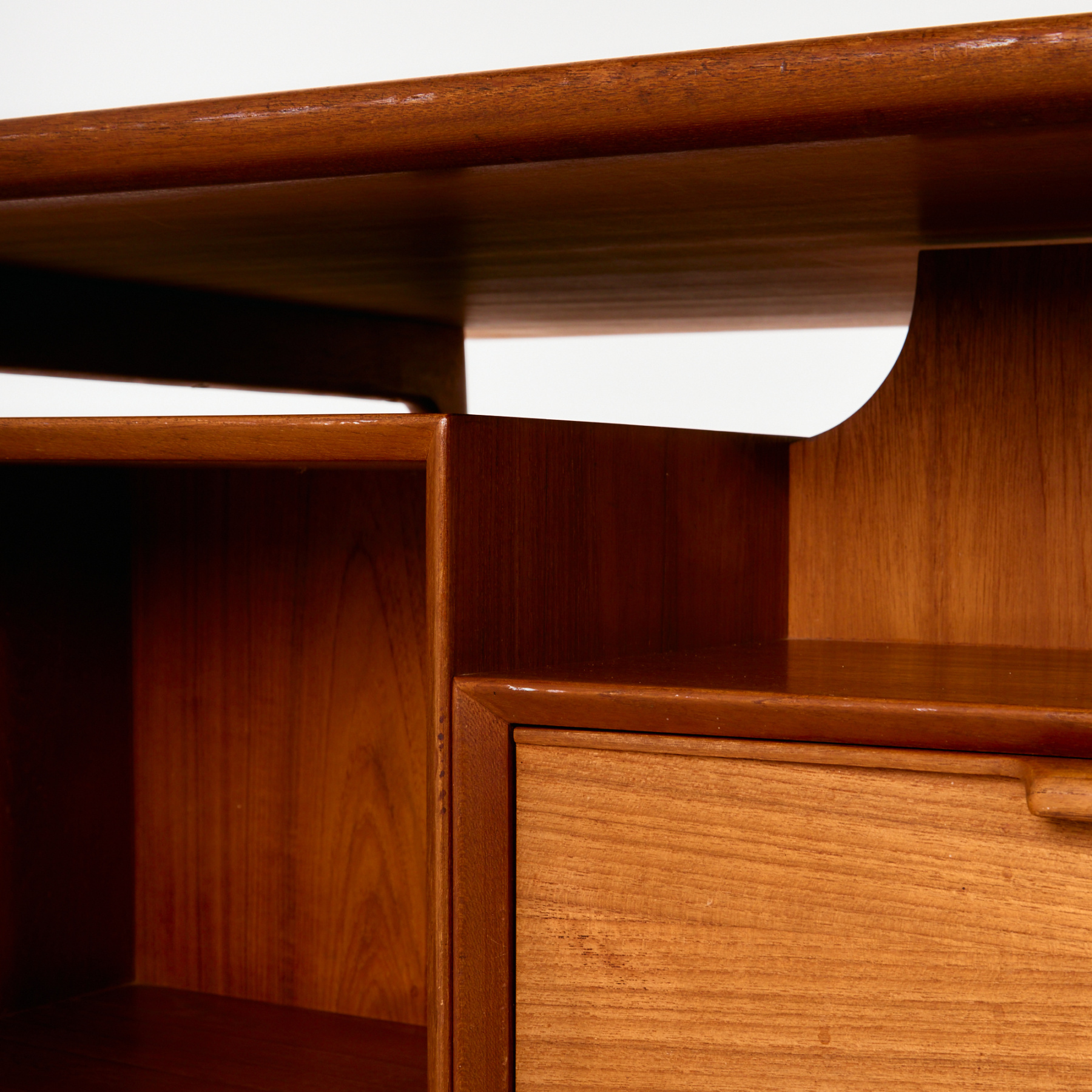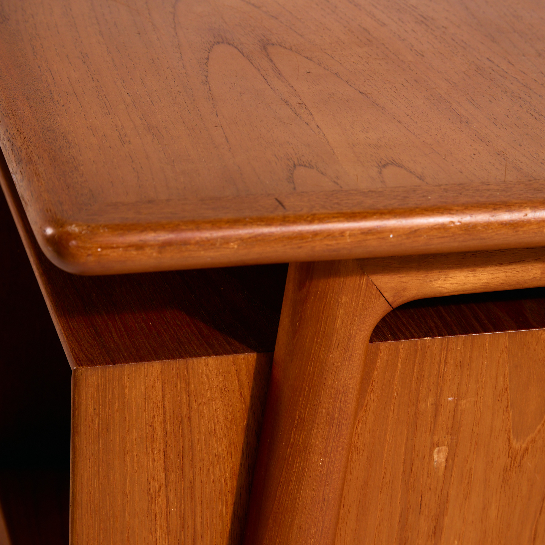 Gunni Omann által az Omann Jun Møbelfabrik számára tervezett ‘Modell 75’ teak íróasztal az 1960-as évekből. Az asztal hat fiókkal, hátán kettő nyitott polccal ellátott. A bútor formai kialakításának és anyaghasználatának köszönhetően egyszerre elegáns és időtlen darab. Felületén helyenként karcokkal, foltokkal és kopásokkal.