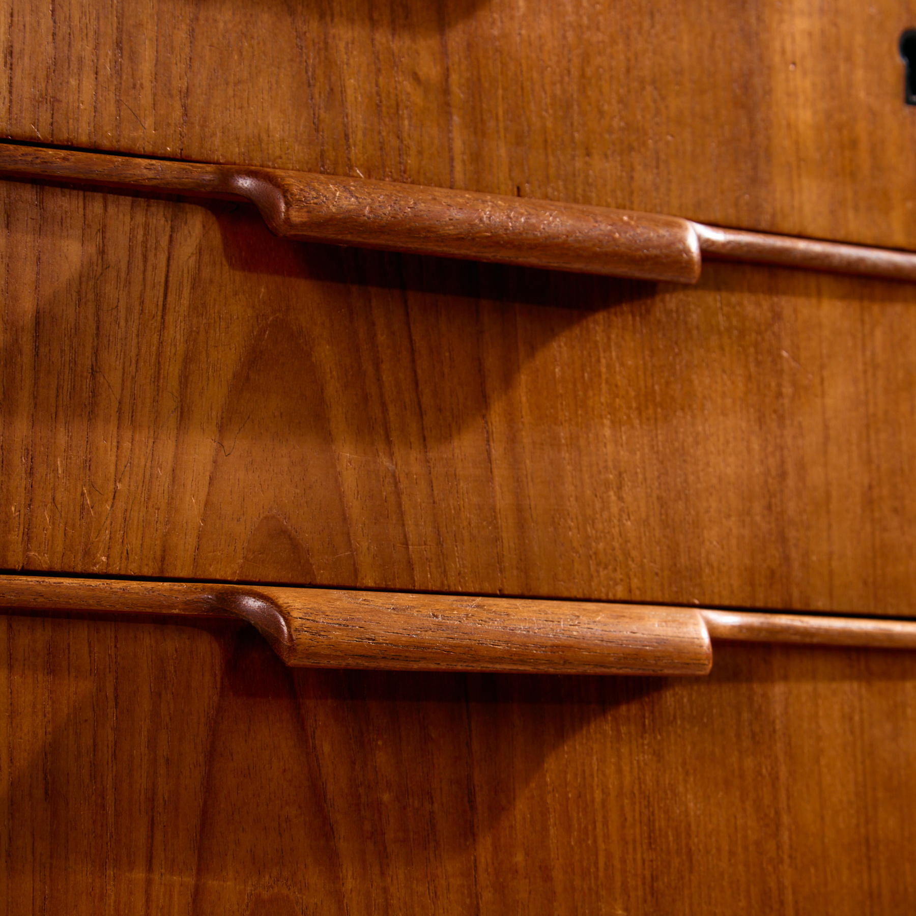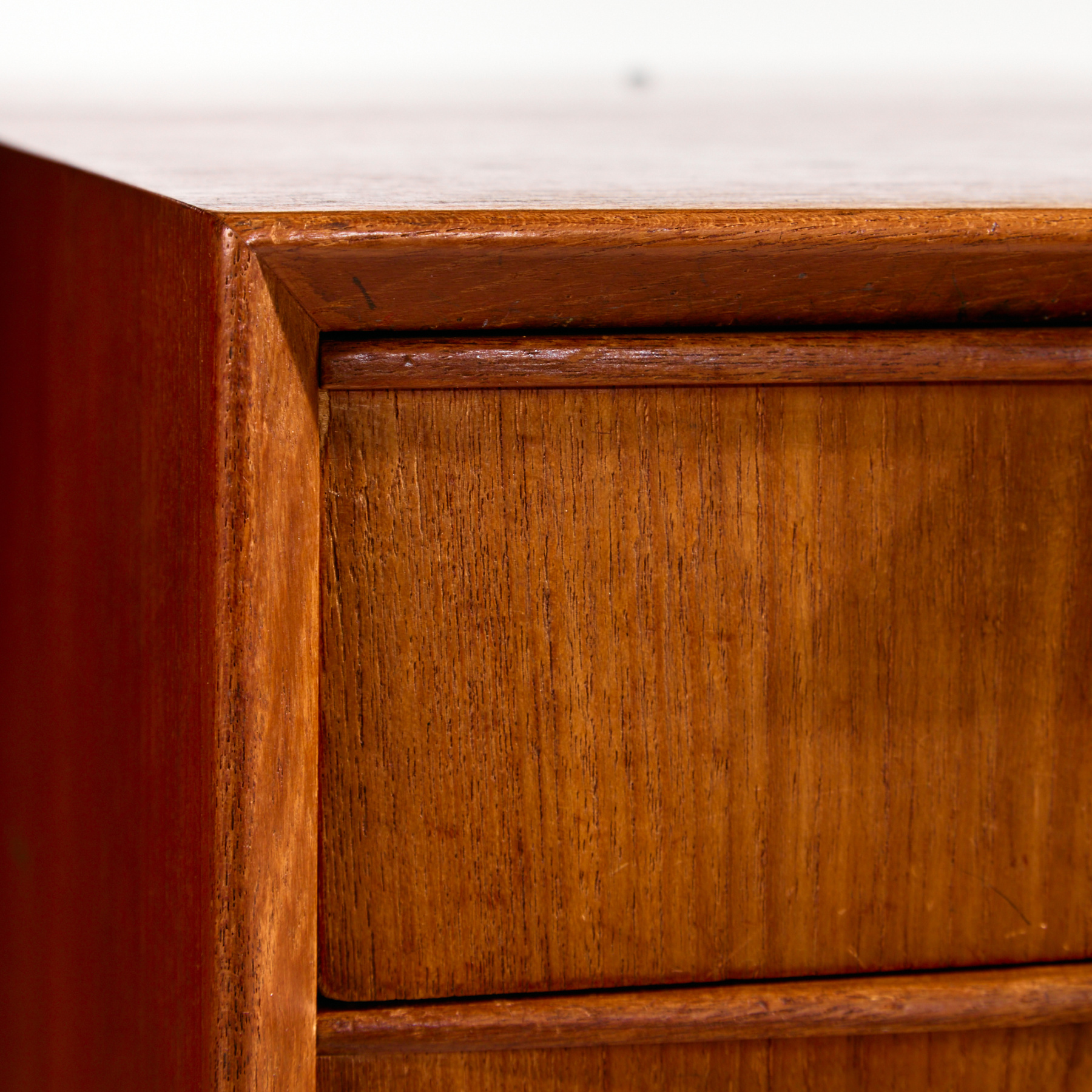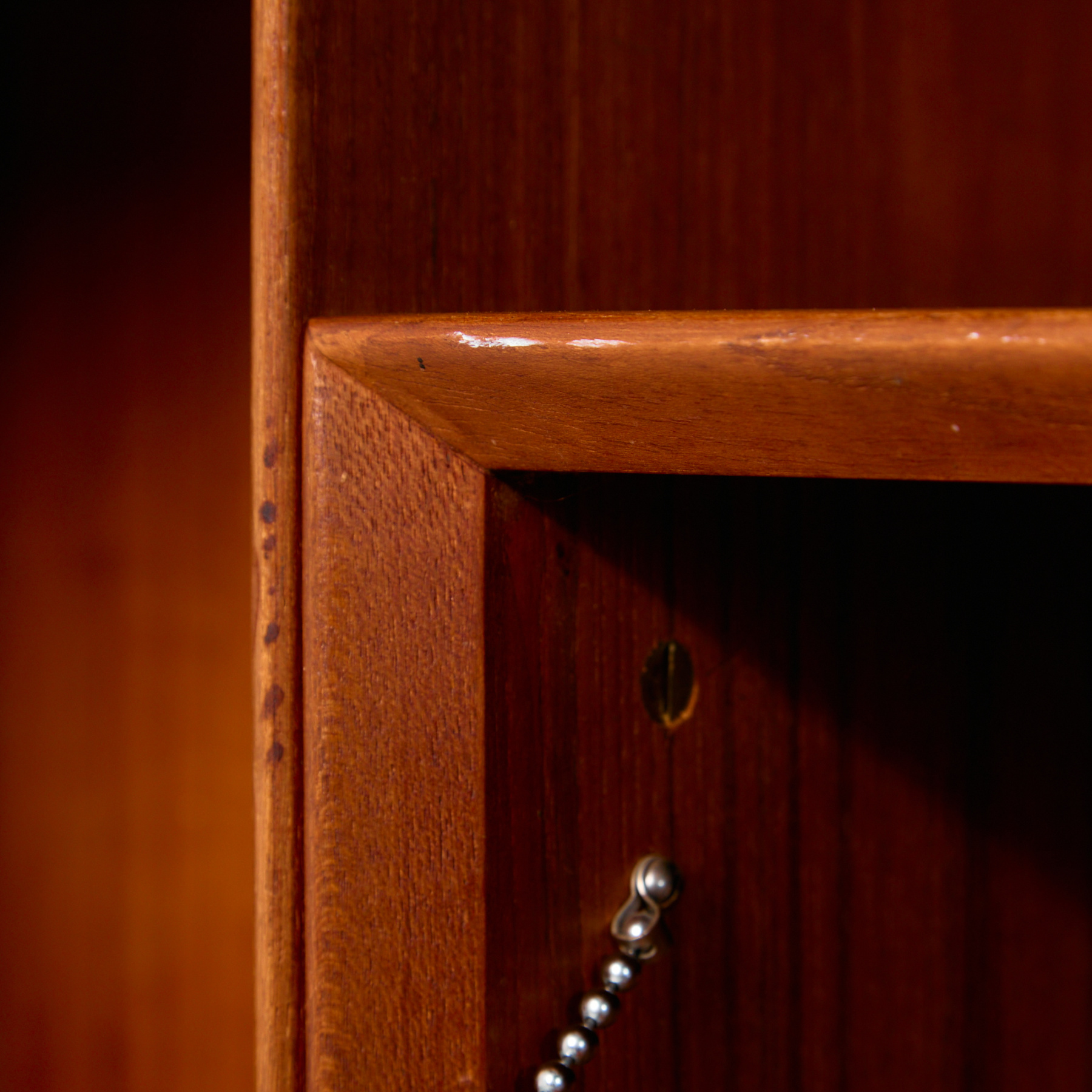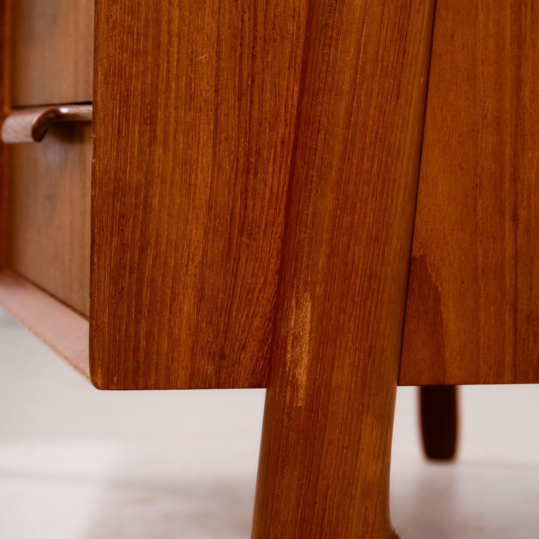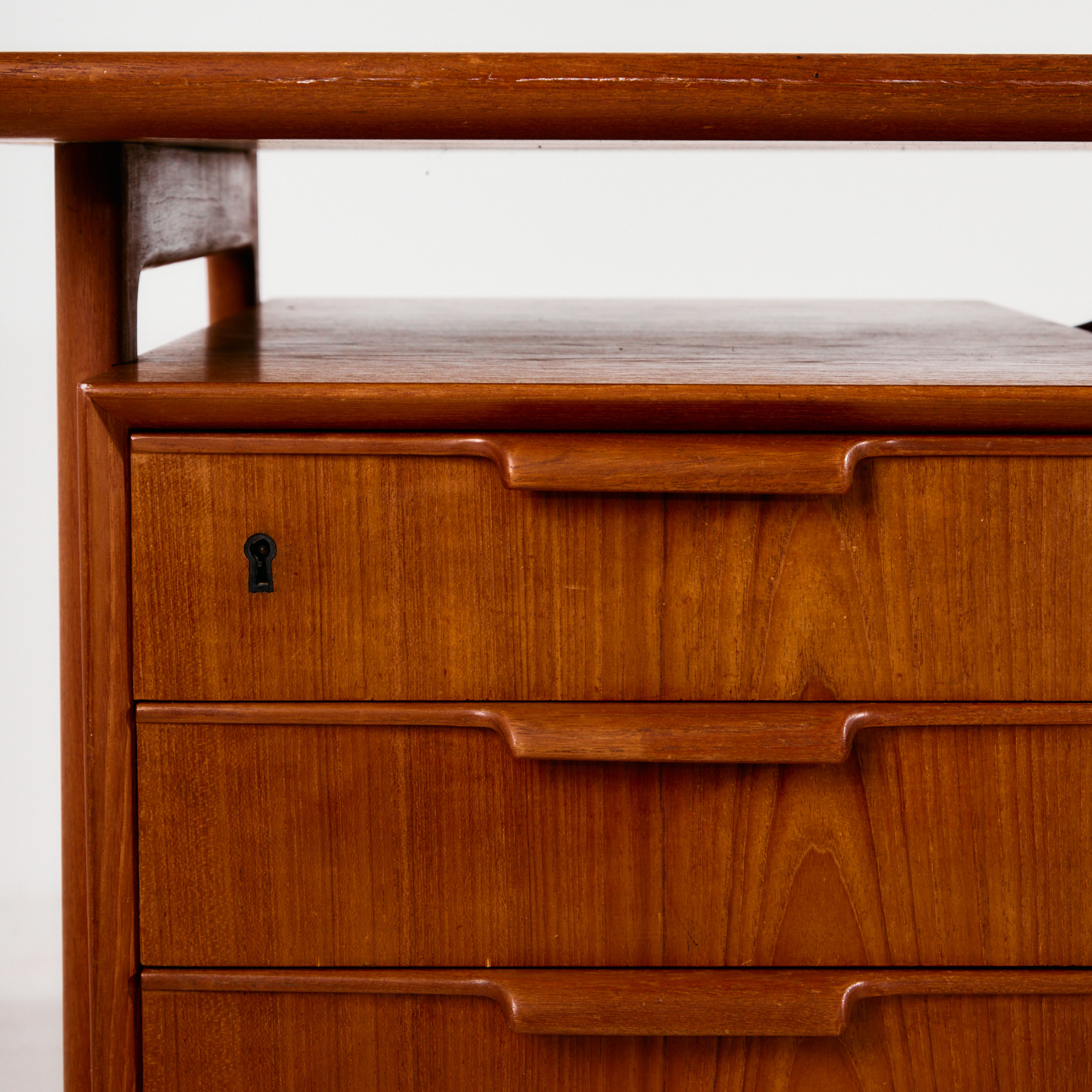 Gunni Omann által az Omann Jun Møbelfabrik számára tervezett ‘Modell 75’ teak íróasztal az 1960-as évekből. Az asztal hat fiókkal, hátán kettő nyitott polccal ellátott. A bútor formai kialakításának és anyaghasználatának köszönhetően egyszerre elegáns és időtlen darab. Felületén helyenként karcokkal, foltokkal és kopásokkal.