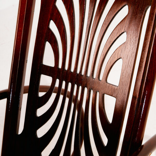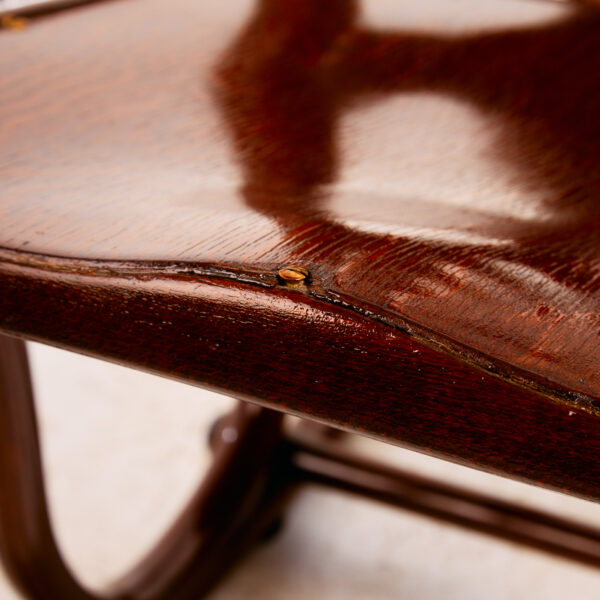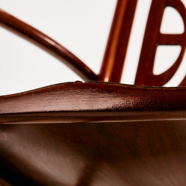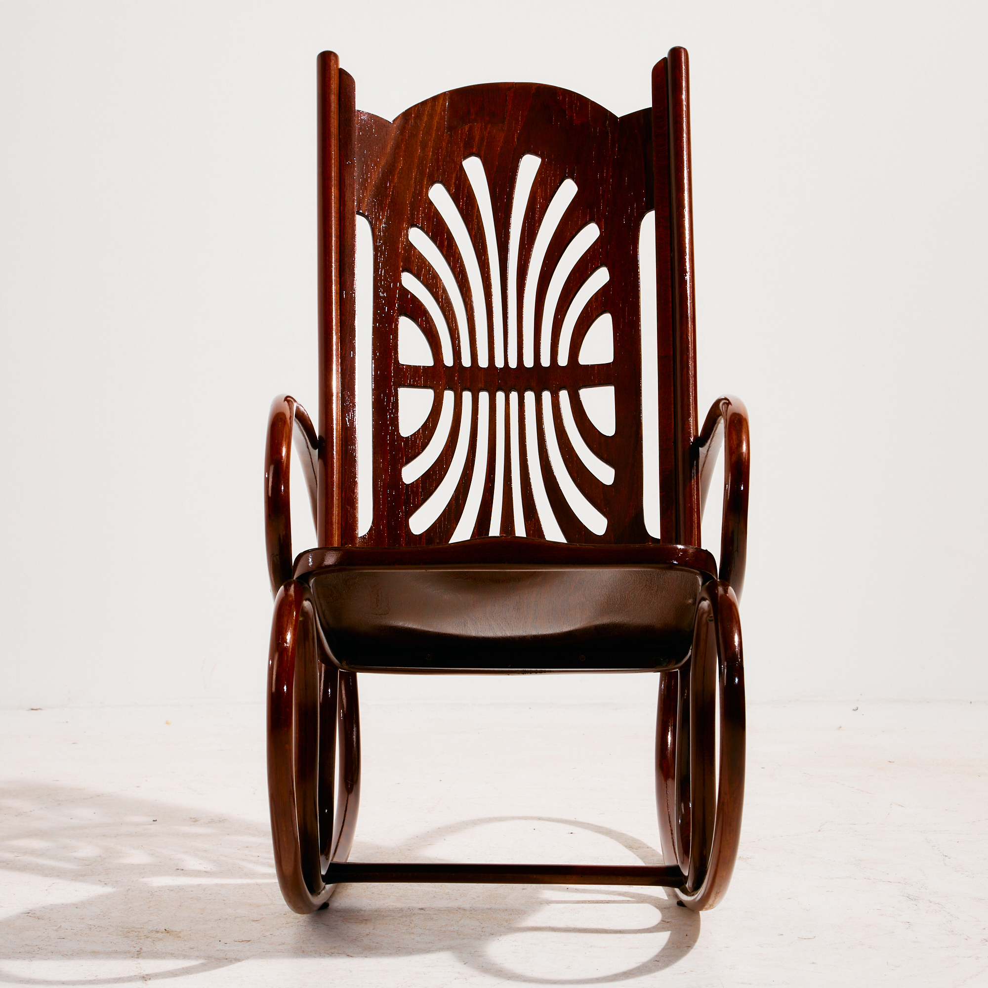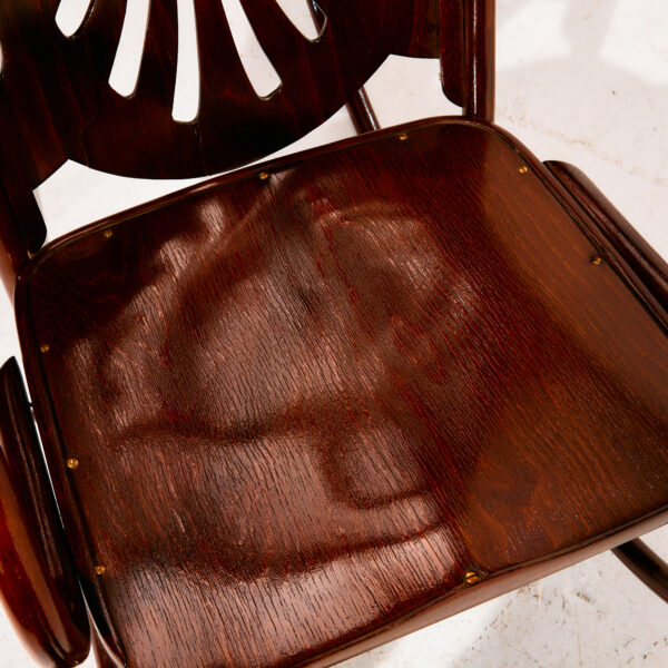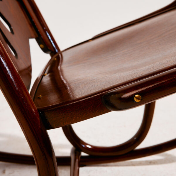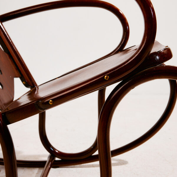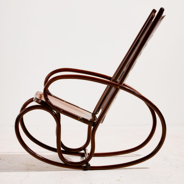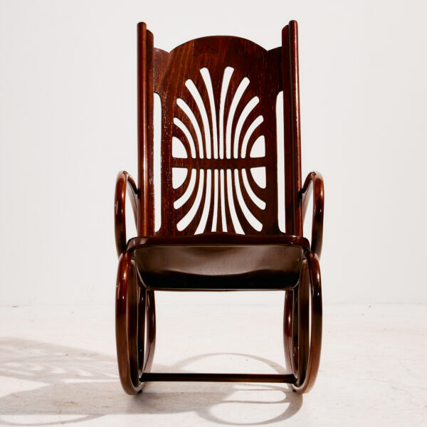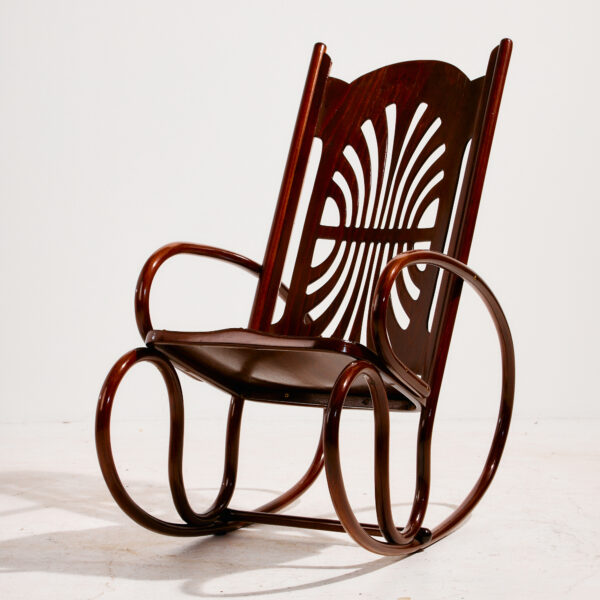 Gustav Siegel által a Jacob & Josef Kohn bútorgyár számára tervezett bükk hintaszék a 1890-es évekből. A bécsi bútorgyár 1868-ban alakult és a századfordulóra vezető szerepet töltött be a gőzhajlított bútorok gyártásában. A hintaszék teljes felújítást kapott, háttámláján több furnérpótlás is található.