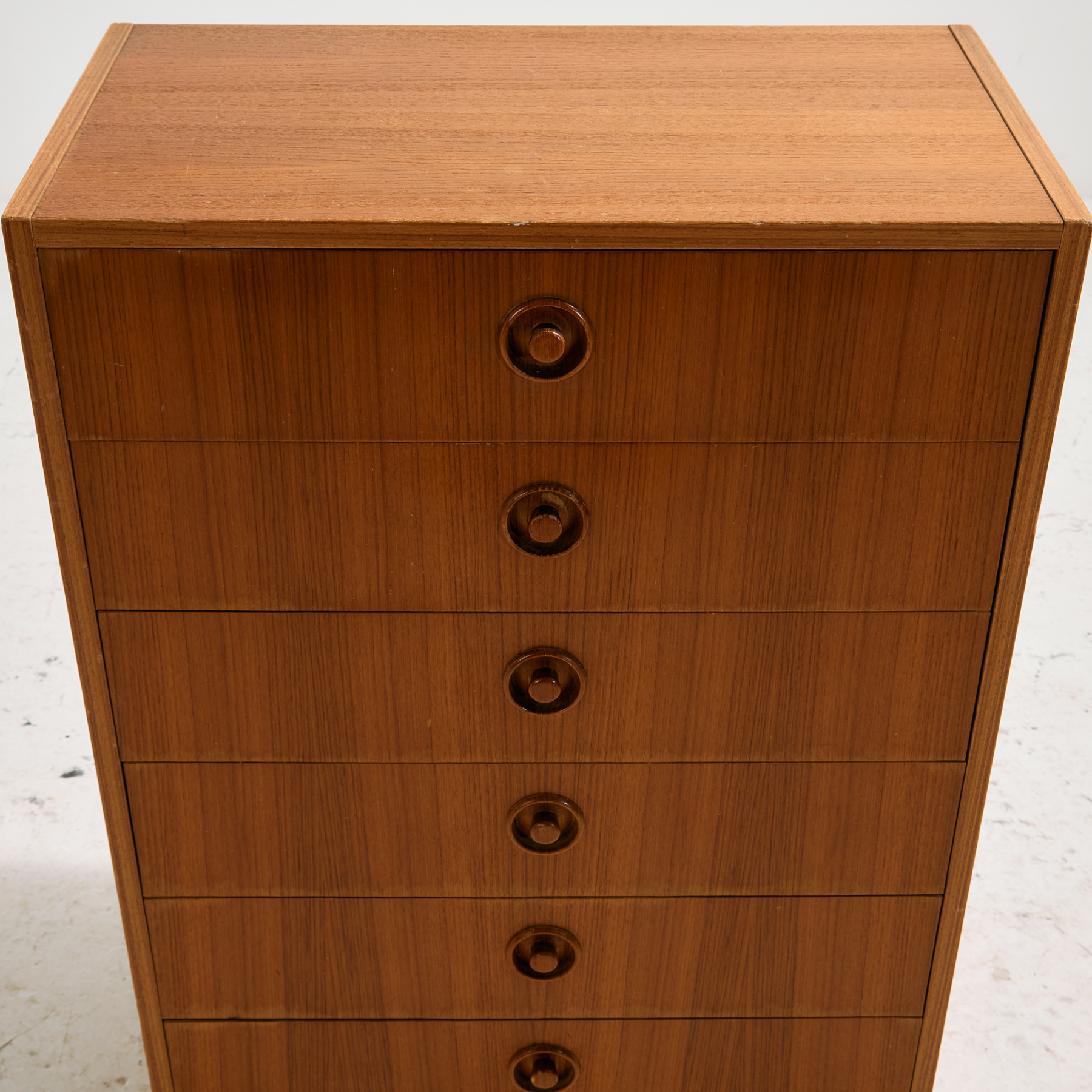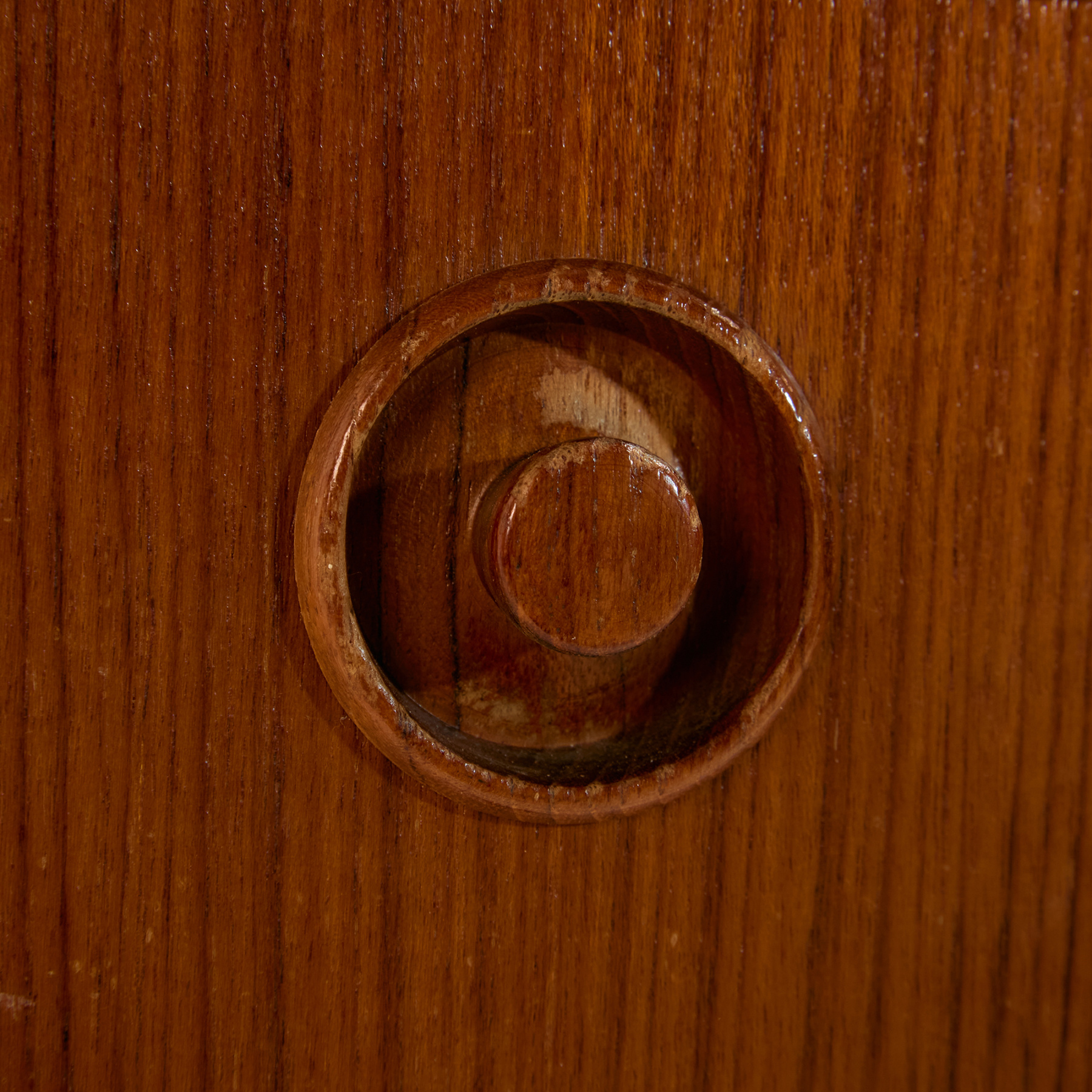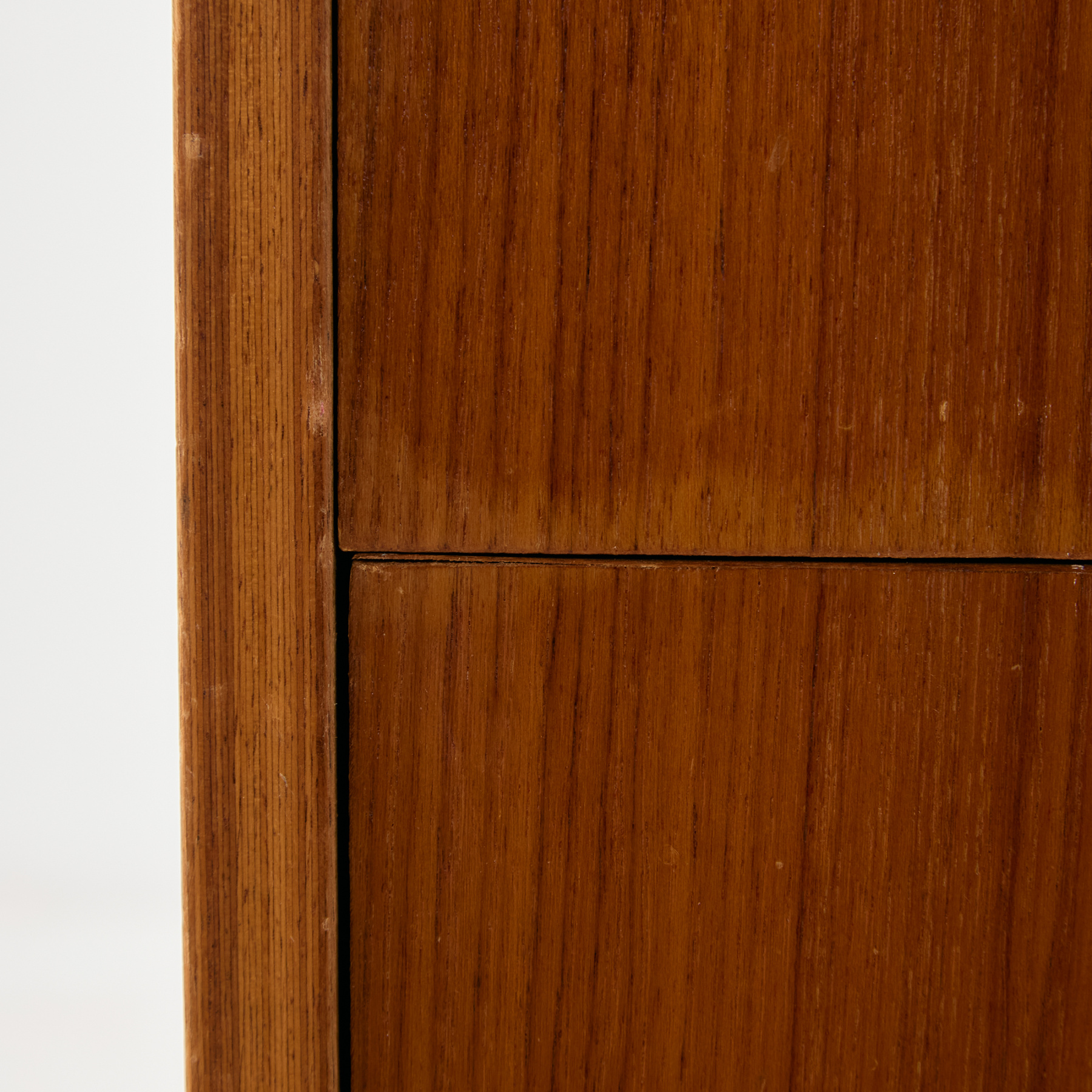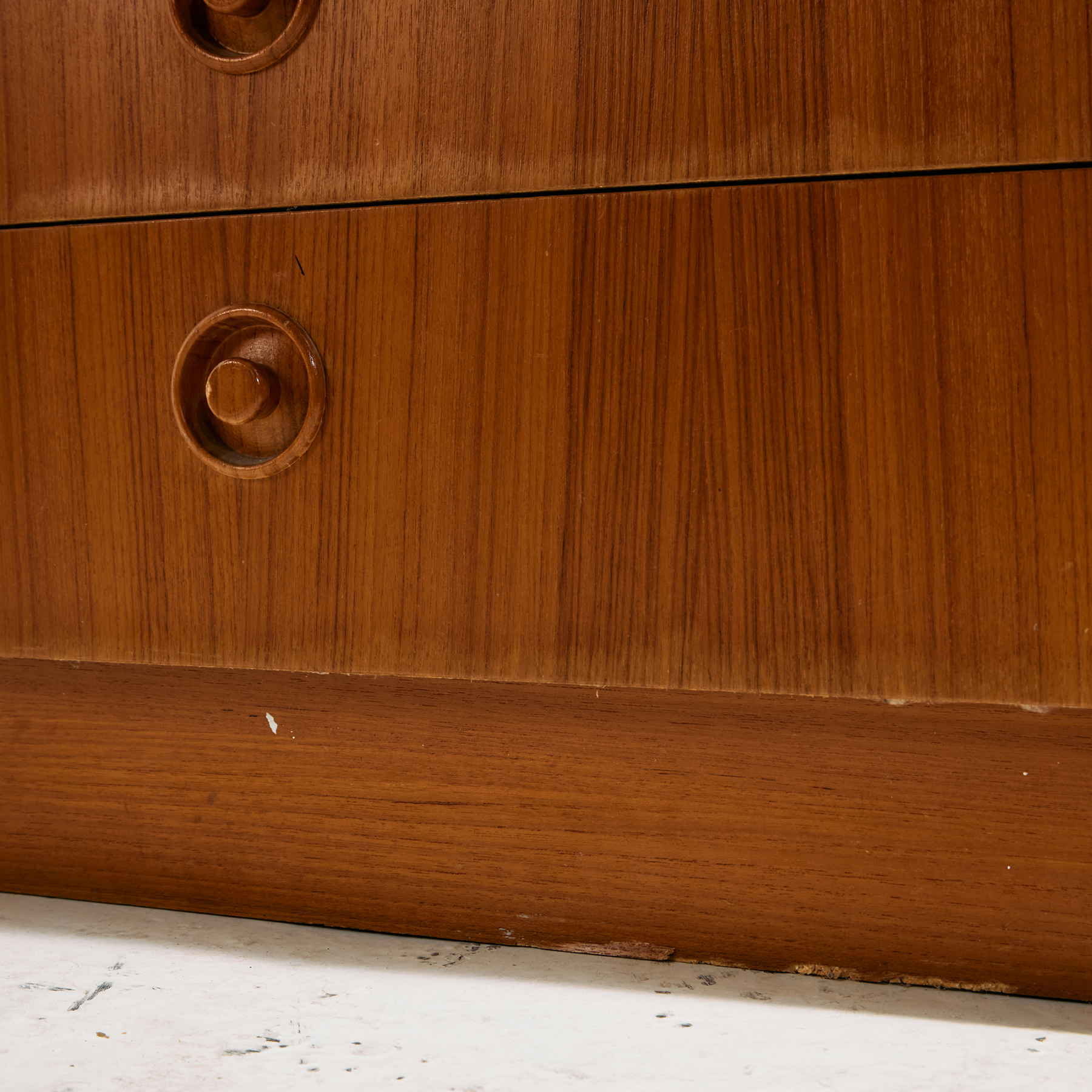 Alacsonyabb hat fiókos teak komód az 1970-es évek Dániájából. A bútor felületén helyenként karcokkal, foltokkal és kopásokkal, némi használatból adódó nyomokkal.