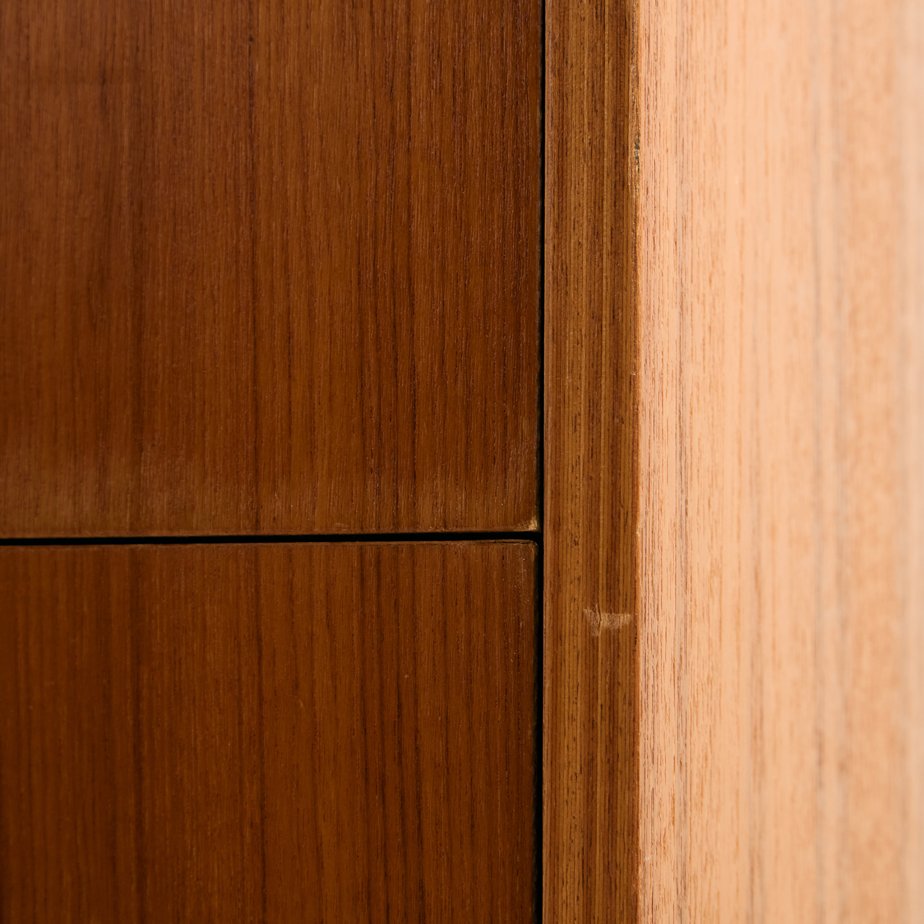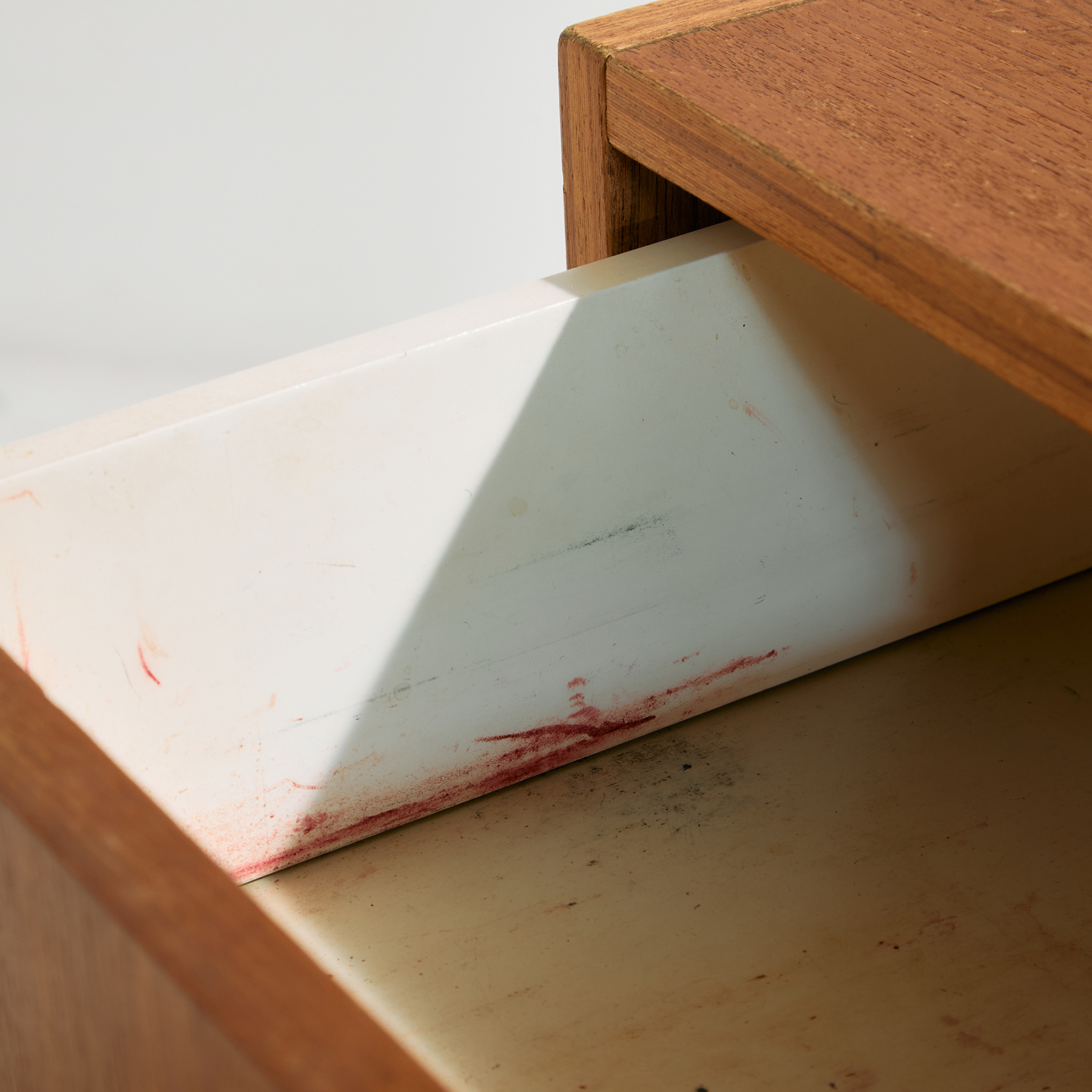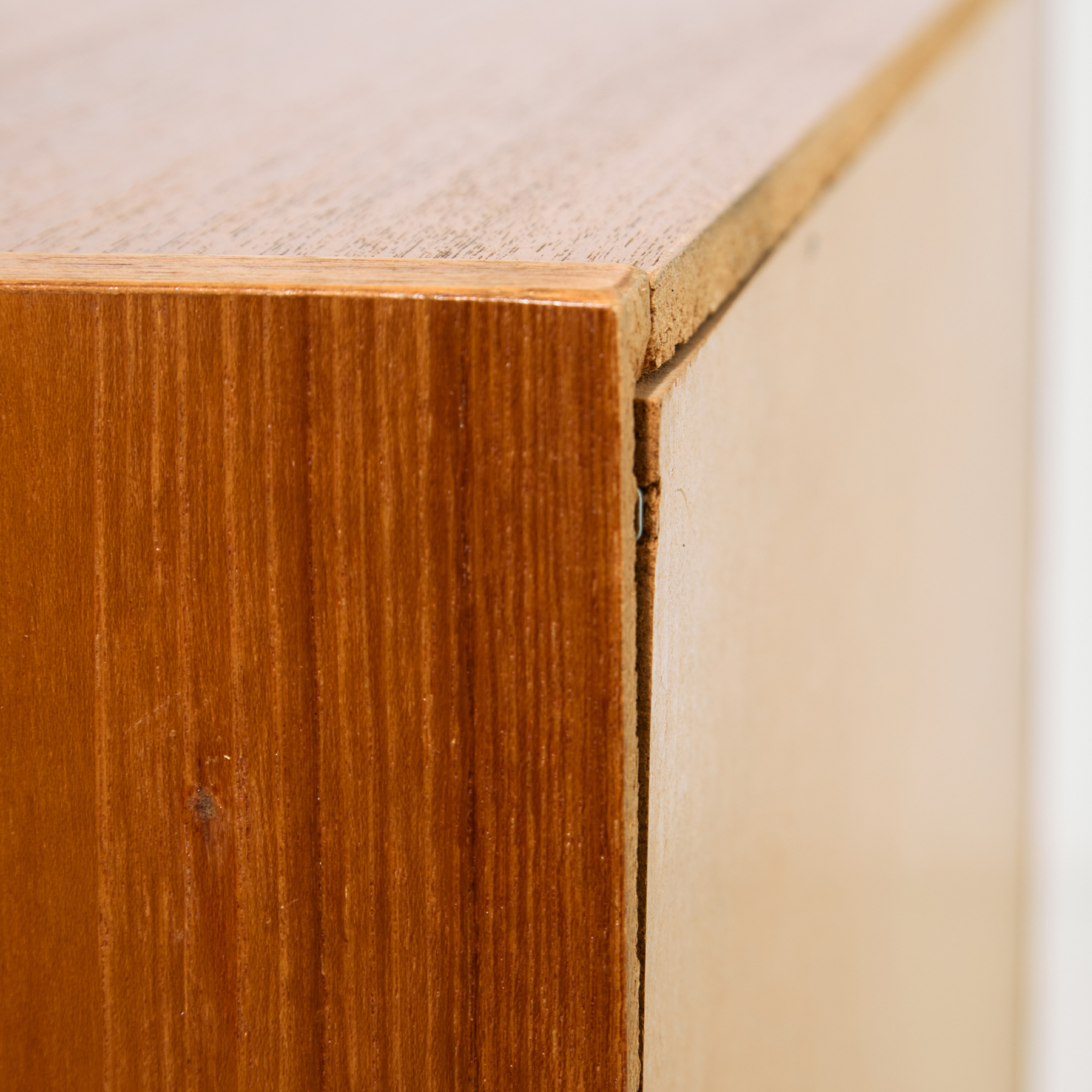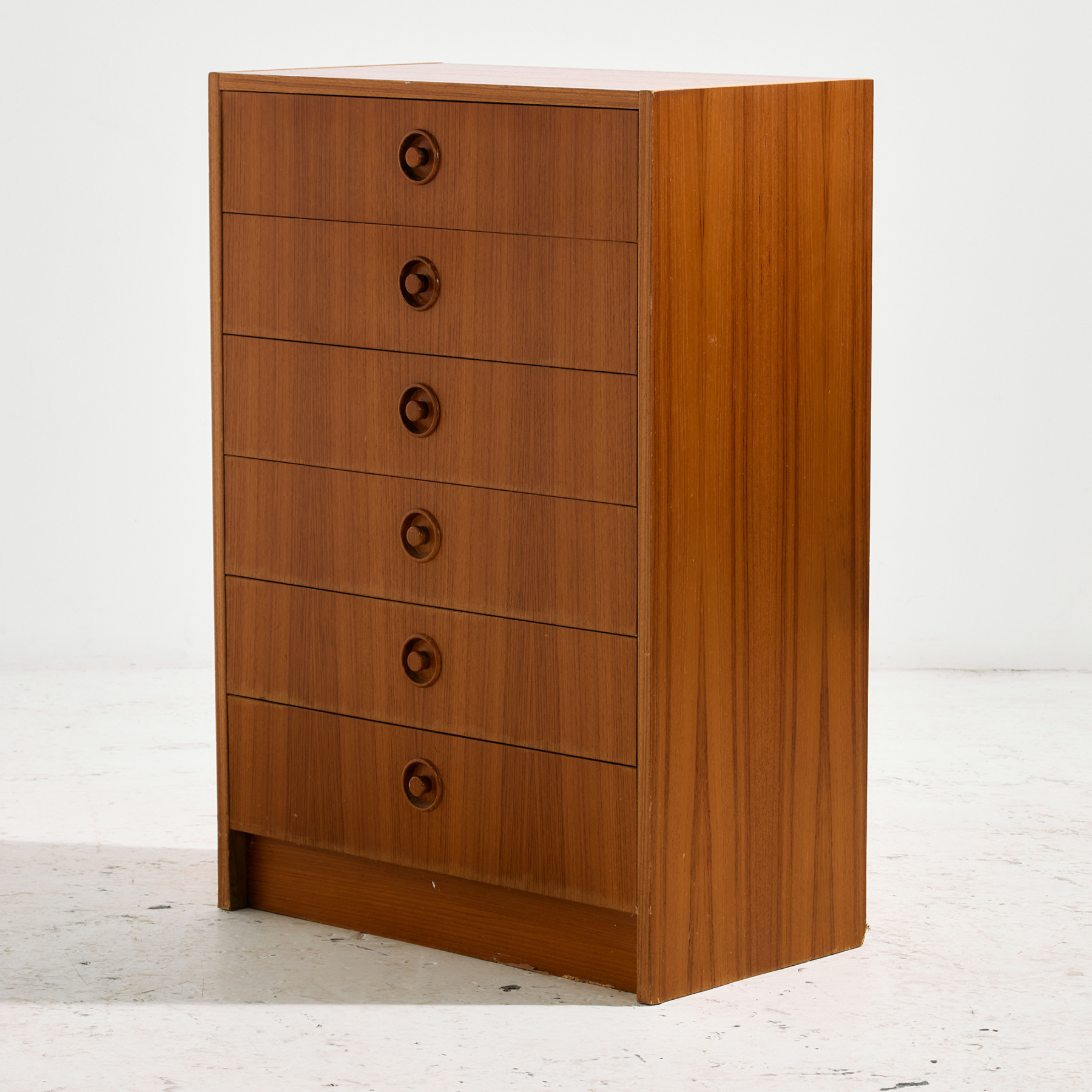 Alacsonyabb hat fiókos teak komód az 1970-es évek Dániájából. A bútor felületén helyenként karcokkal, foltokkal és kopásokkal, némi használatból adódó nyomokkal.