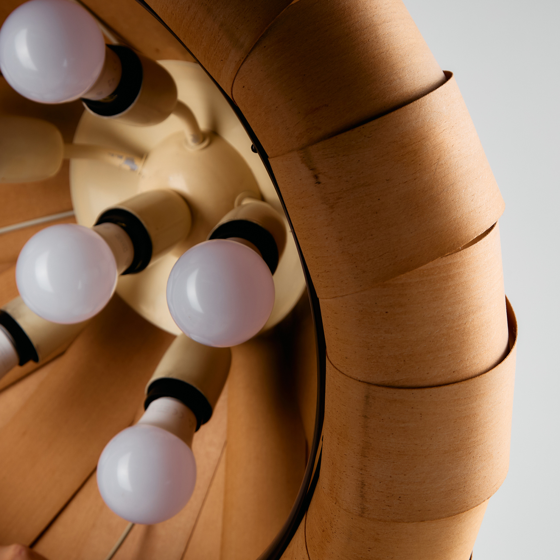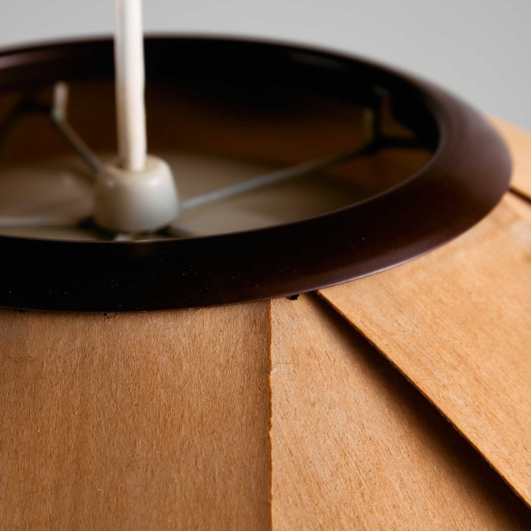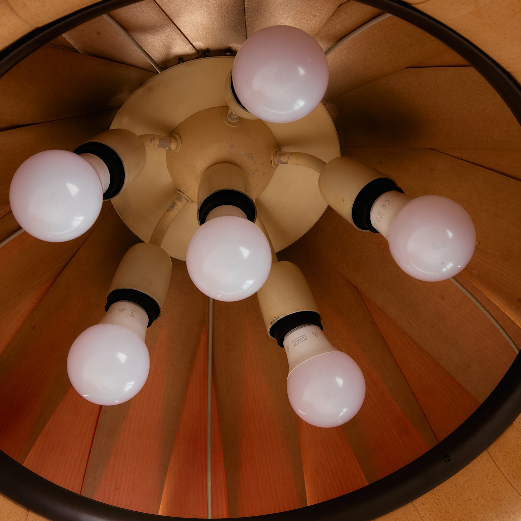 Az IDEA Iparművészeti Vállalat által készített és forgalmazott függeszték az 1980-as évekből. A lámpa búrája furnér szeletekből készült, belsejében hat foglalat található. A függeszték felületén helyenként foltokkal és kisebb repedésekkel.