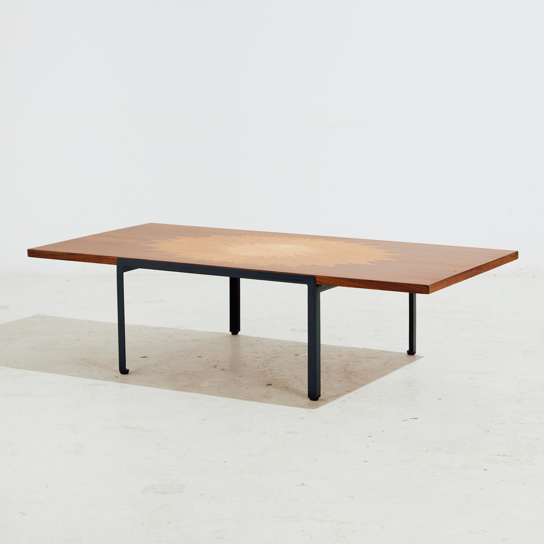 Intarzia berakással díszített rózsafa dohányzóasztal fém lábakon az 1970-es évekből. Az asztal fa és fém részei teljes felújítást kaptak.