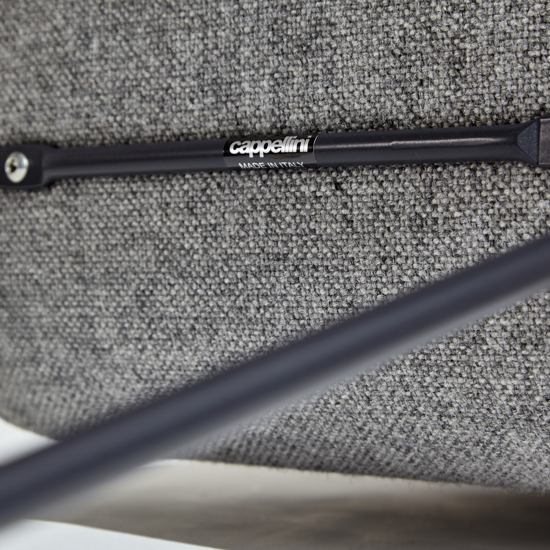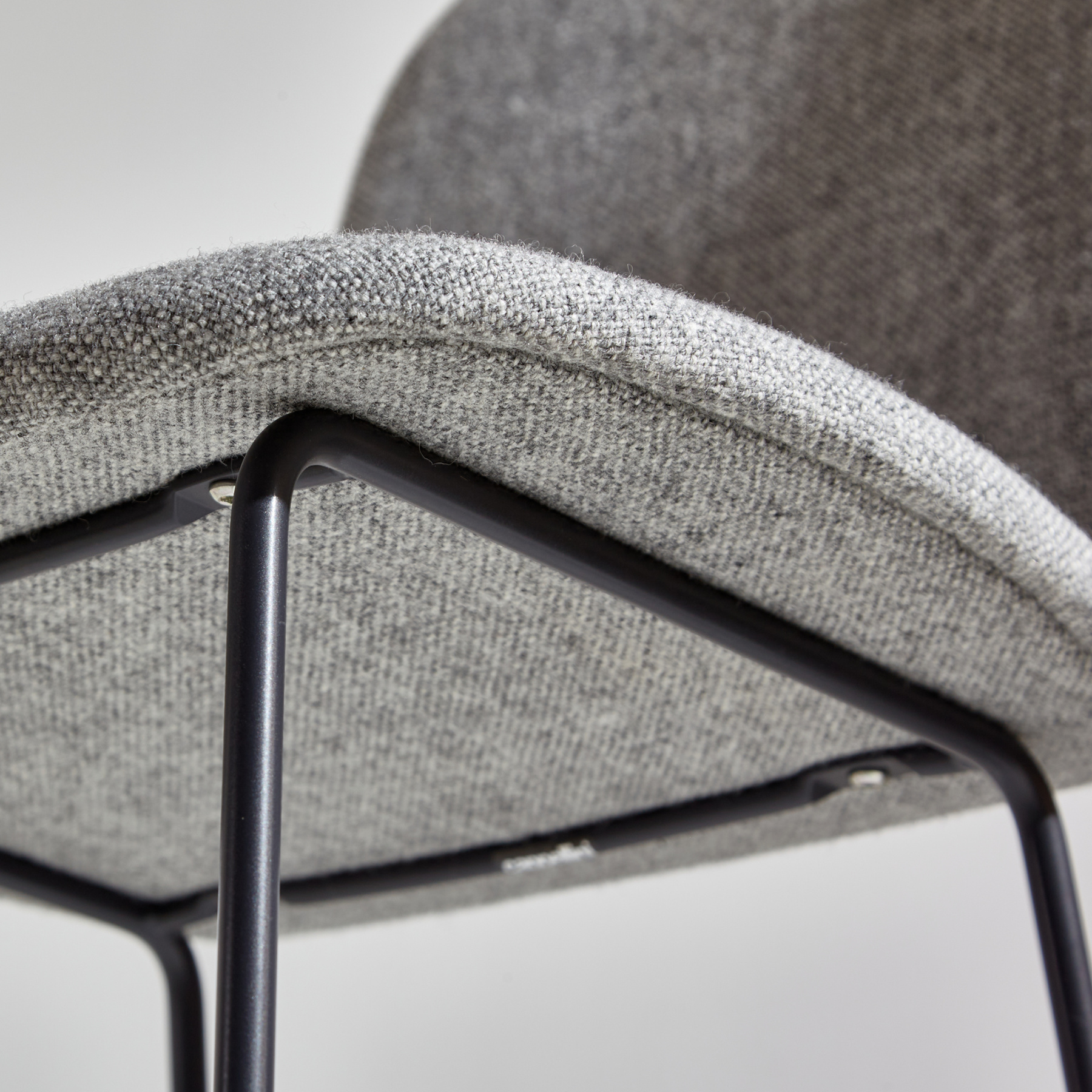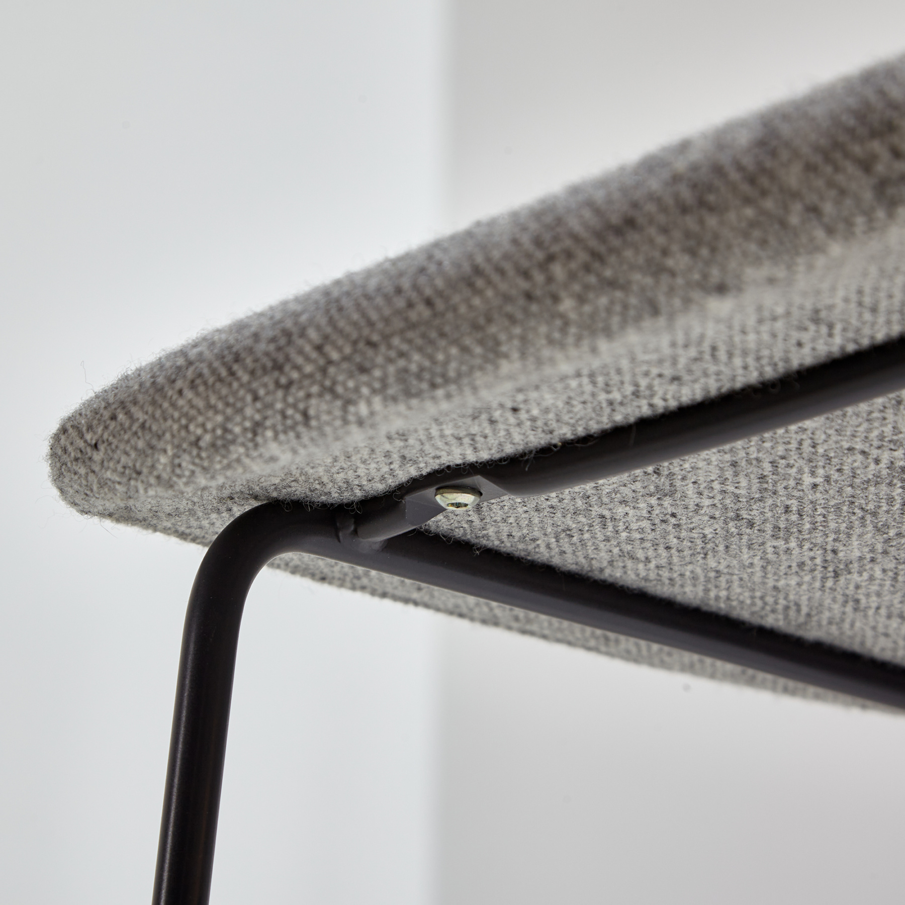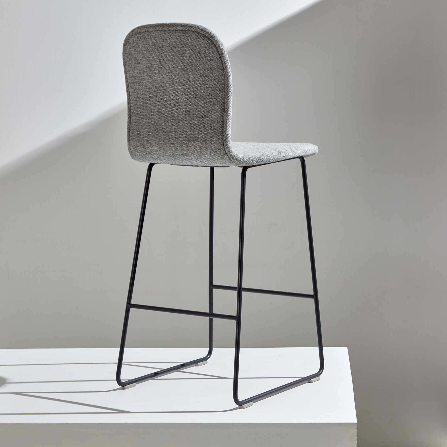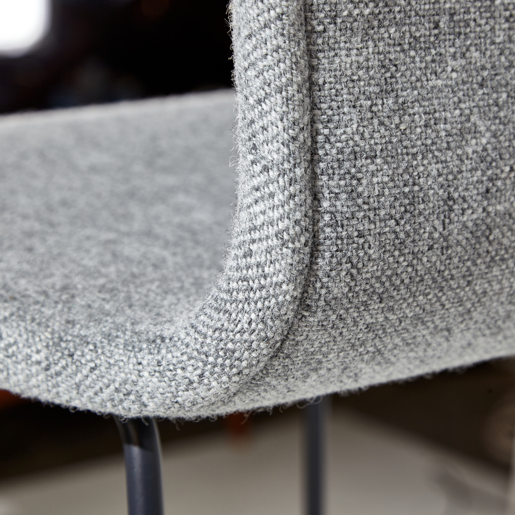 Jasper Morrison által tervezett kárpitozott ‘Tate Soft’ bárszék a Cappellini-től. Az ülőbútor szerkezete lakkozott acélból készült, ülő- és háttámla része textil kárpitozással borított. A bárszék lábazatán helyenként festék kopással, ám korának megfelelő szép állapotban.