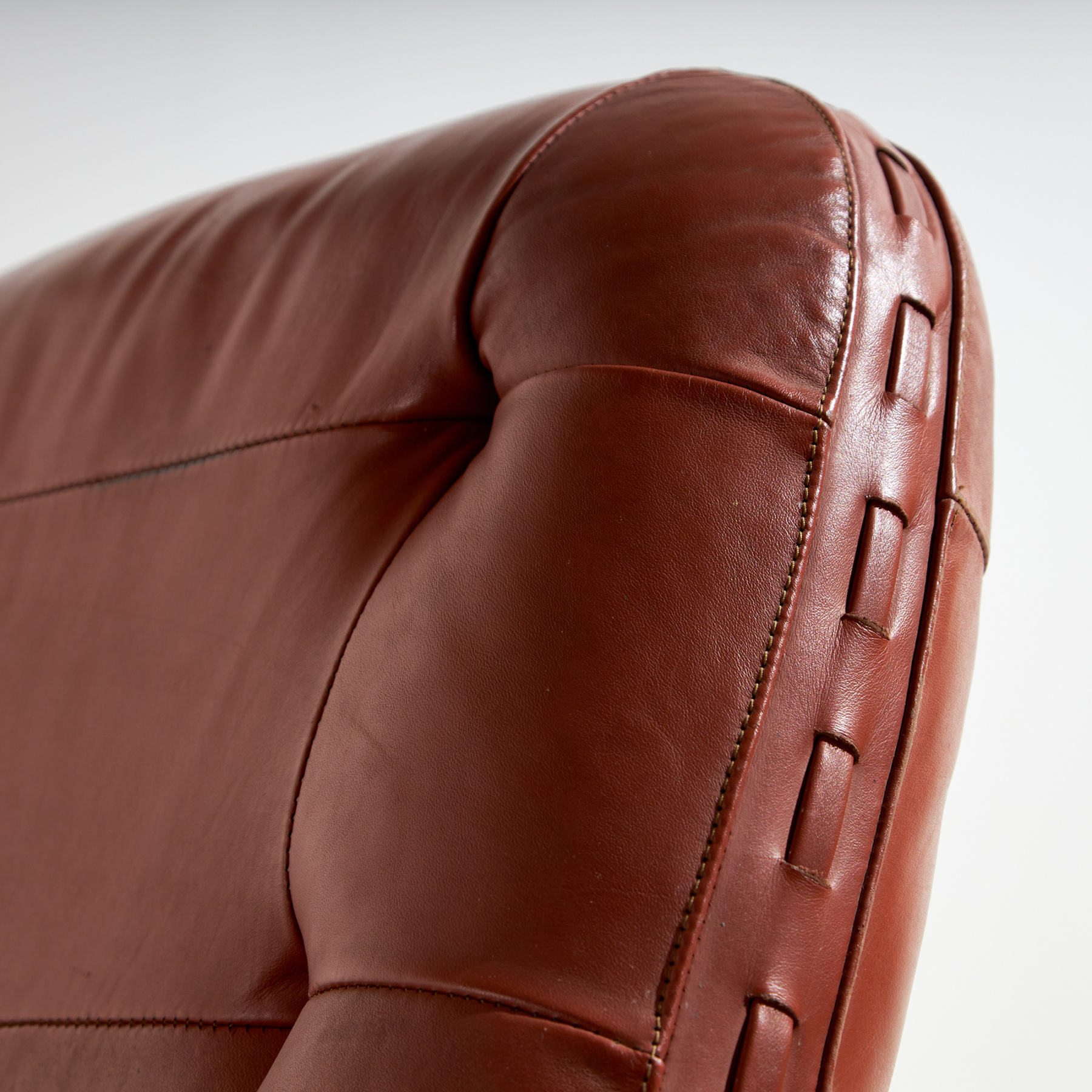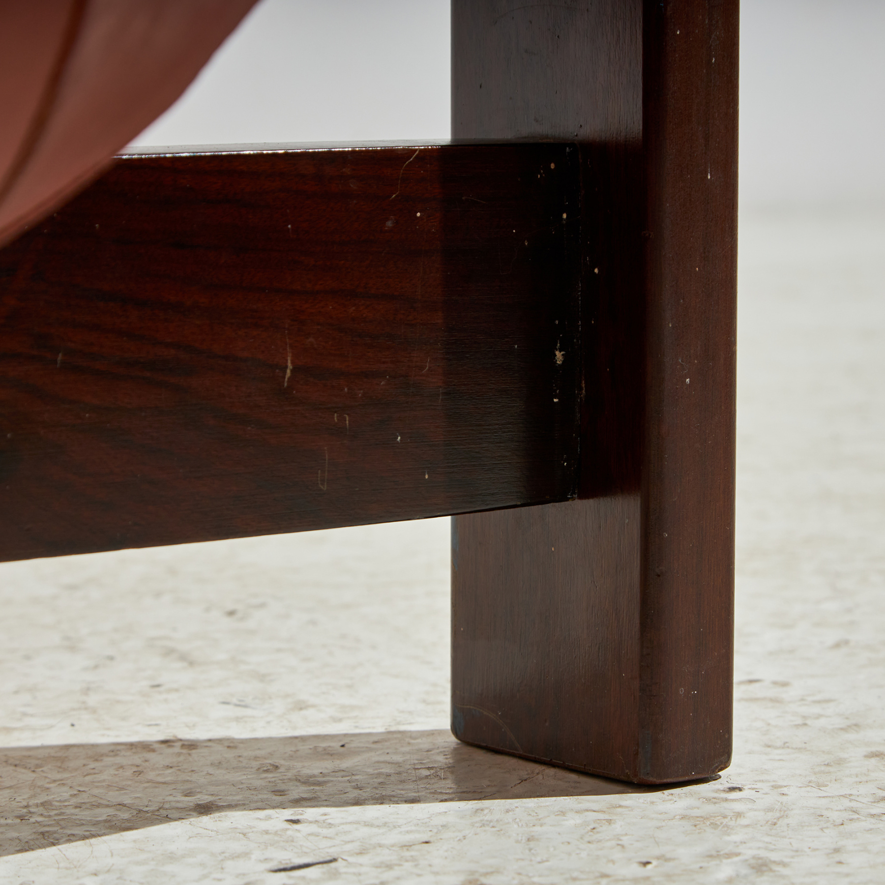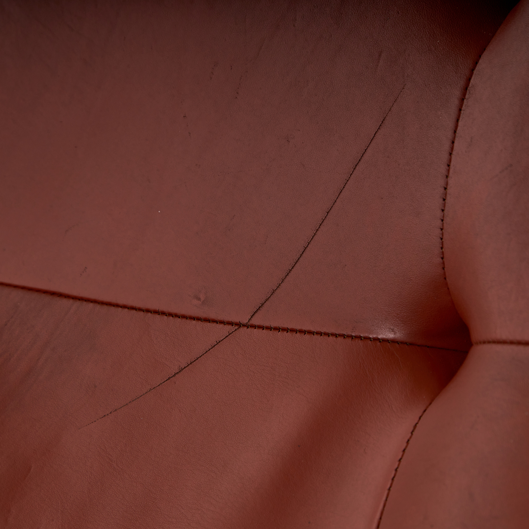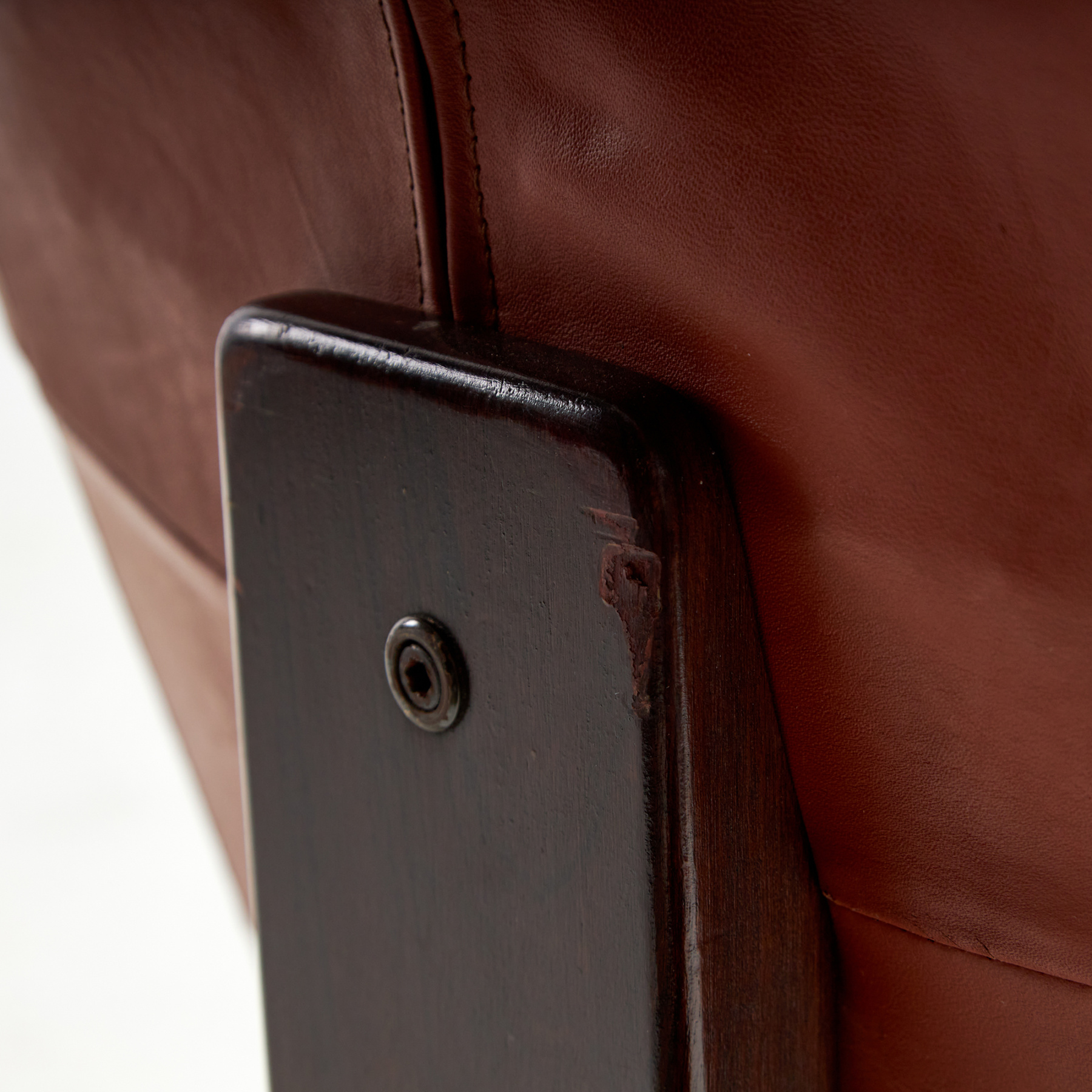 Jean Gillon által a Probel számára tervezett brazil bőr fotel az 1960-as évekből. Bőr felületén és dió vázas szerkezetén helyenként felületi karcokkal, foltokkal és kopásokkal. Az idő nyomot hagyott rajta, azonban igazán kényelmes választás lehet.