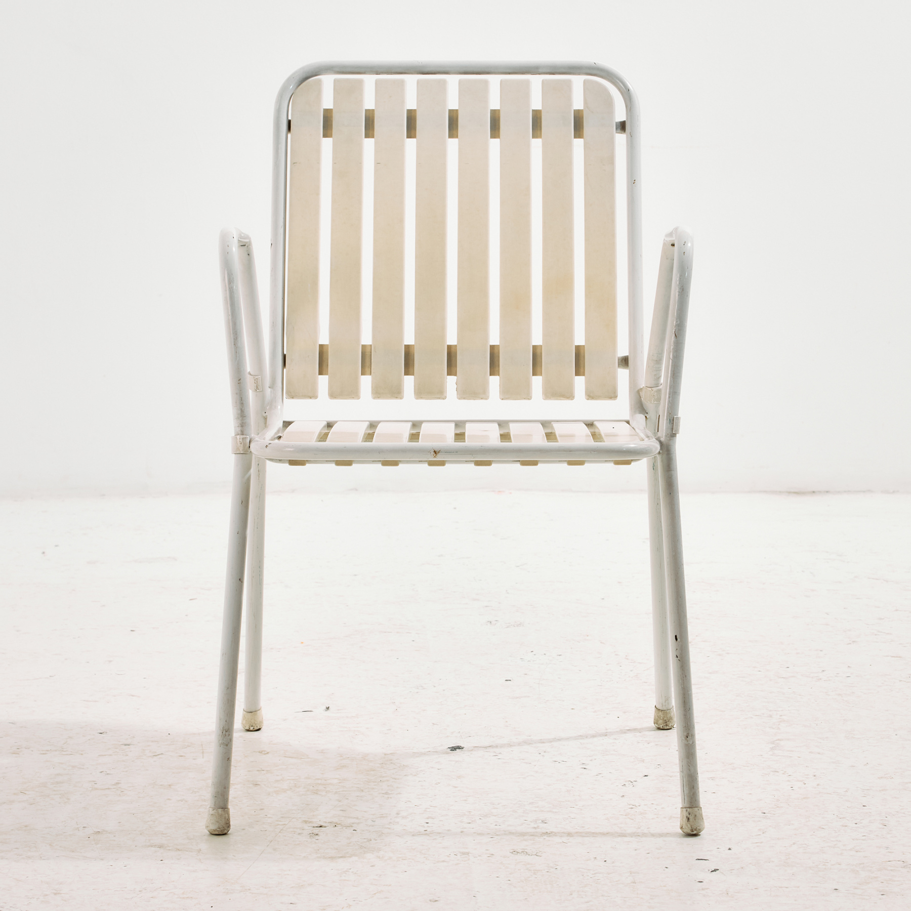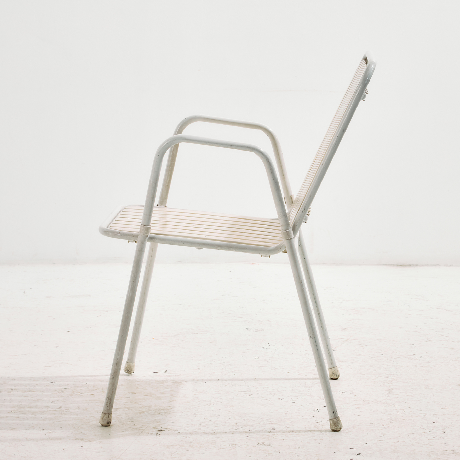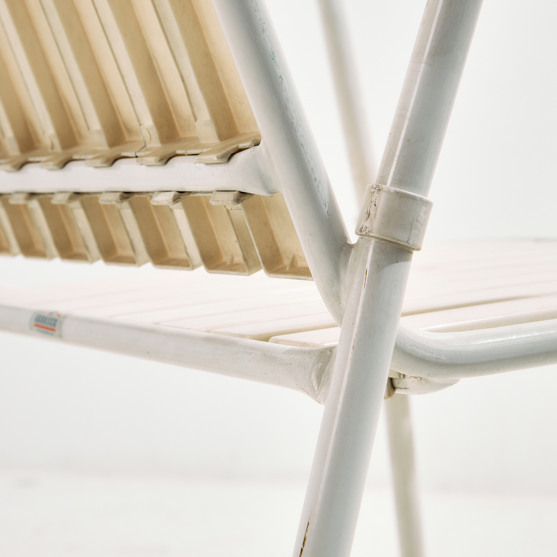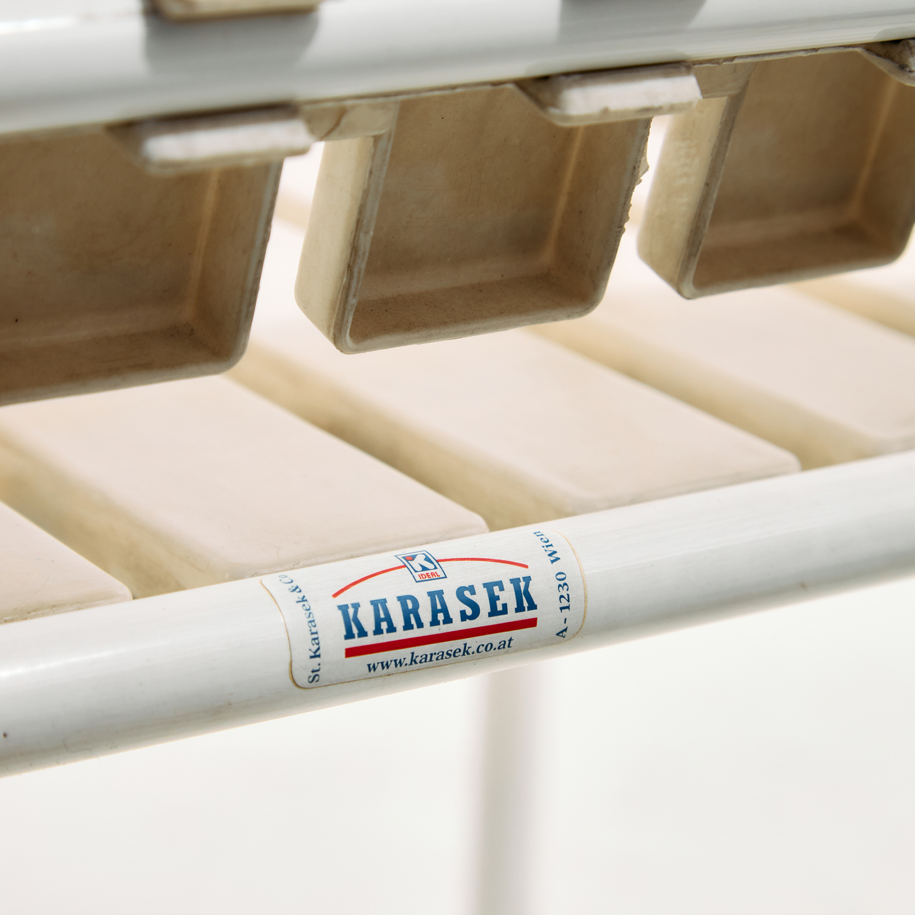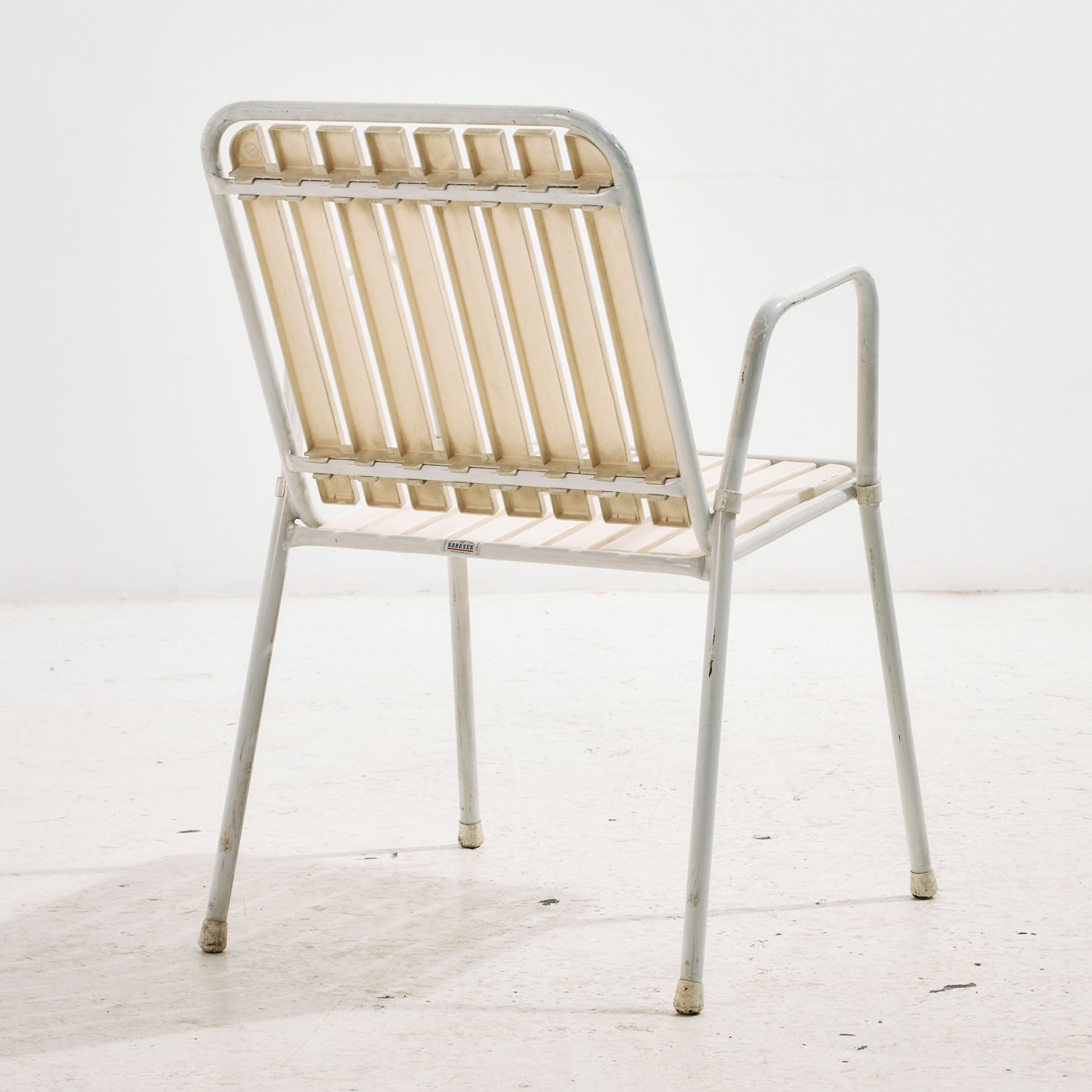 Osztrák Karasek kerti karosszék fém csővázas szerkezettel és műanyag ülő- és háttámla résszel az 1980-as évekből. A karosszék felületén helyenként karcokkal, foltokkal és kopásokkal. Kertek, teraszok vagy akár belső terek dekorálására is alkalmas lehet.