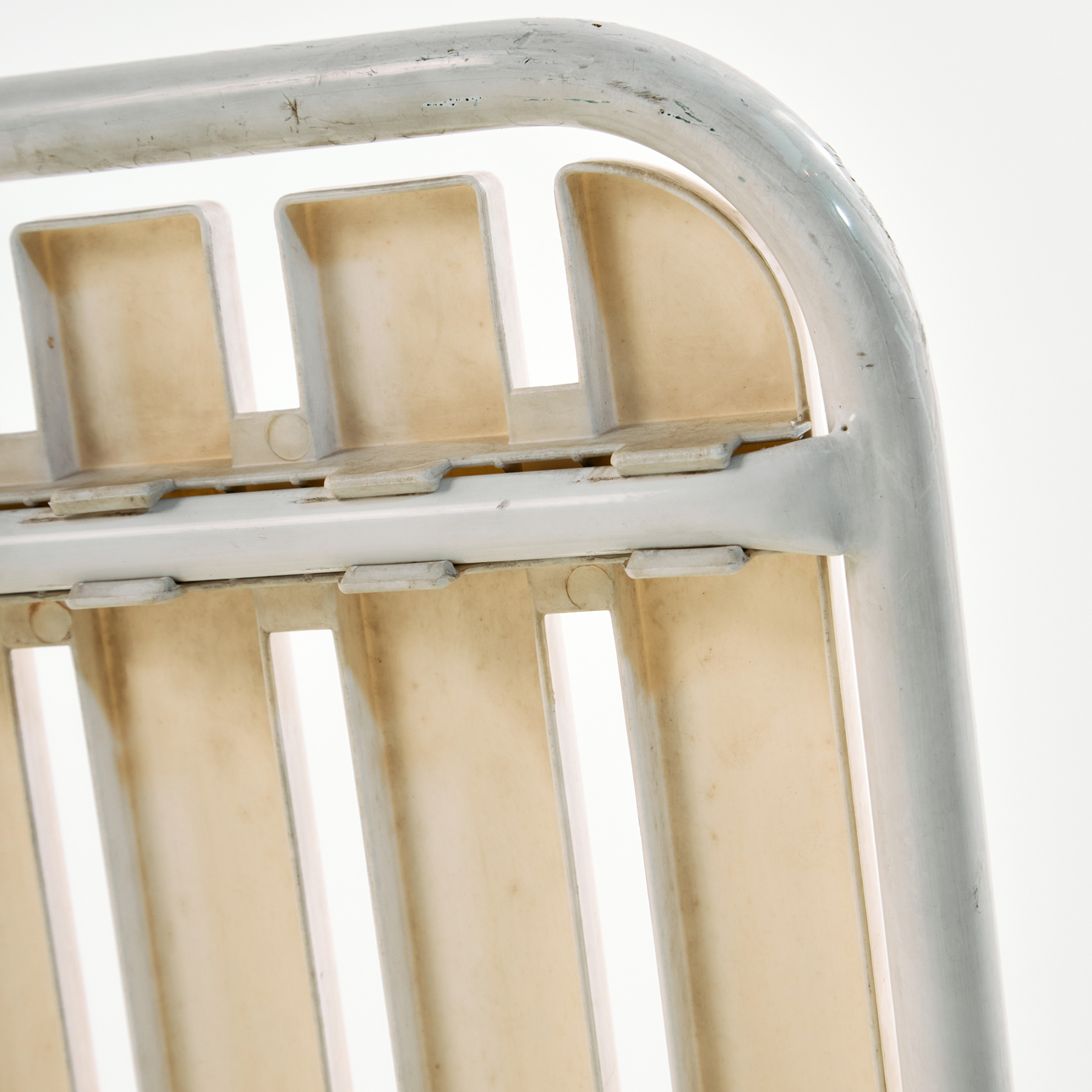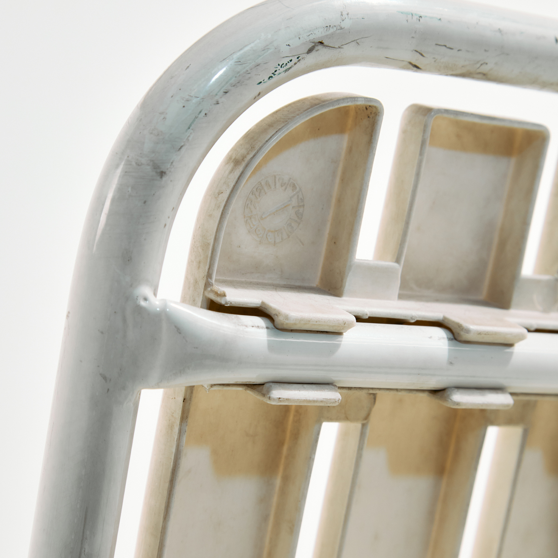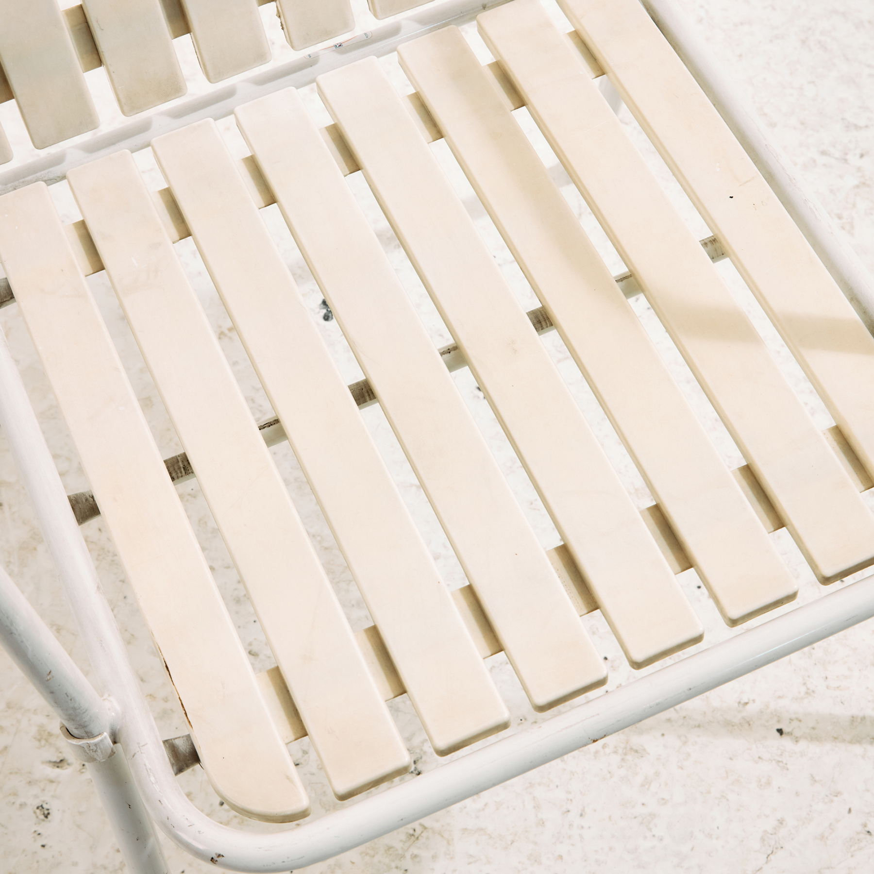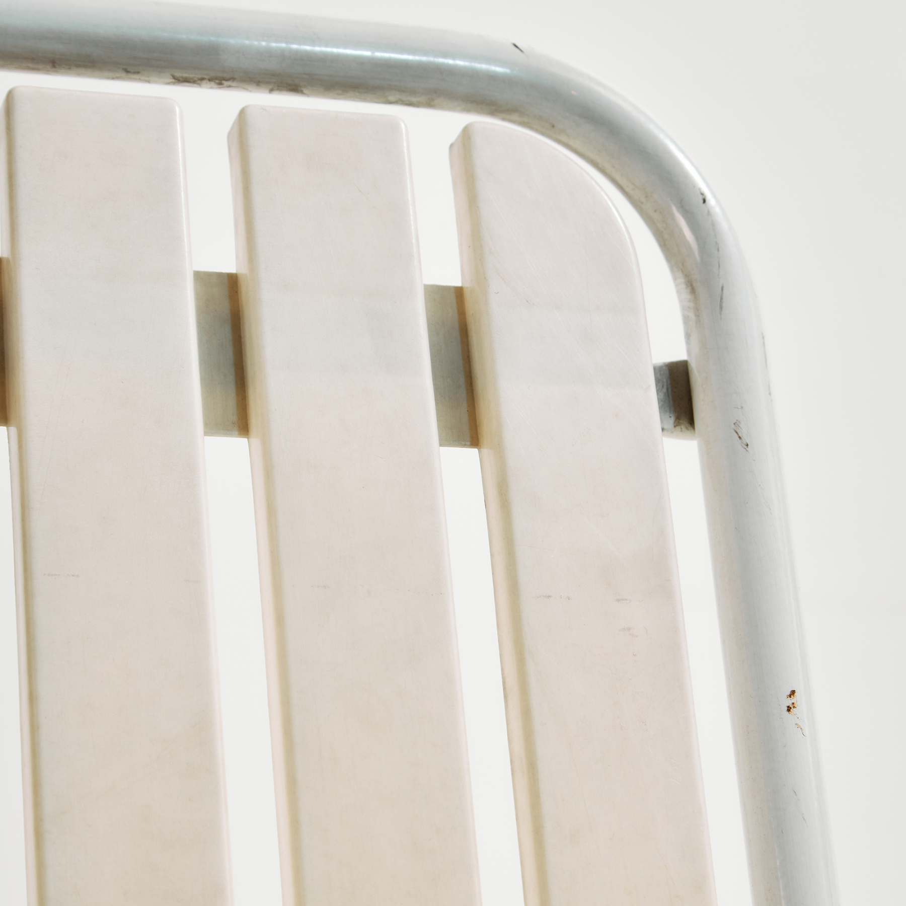 Osztrák Karasek kerti karosszék fém csővázas szerkezettel és műanyag ülő- és háttámla résszel az 1980-as évekből. A karosszék felületén helyenként karcokkal, foltokkal és kopásokkal. Kertek, teraszok vagy akár belső terek dekorálására is alkalmas lehet.