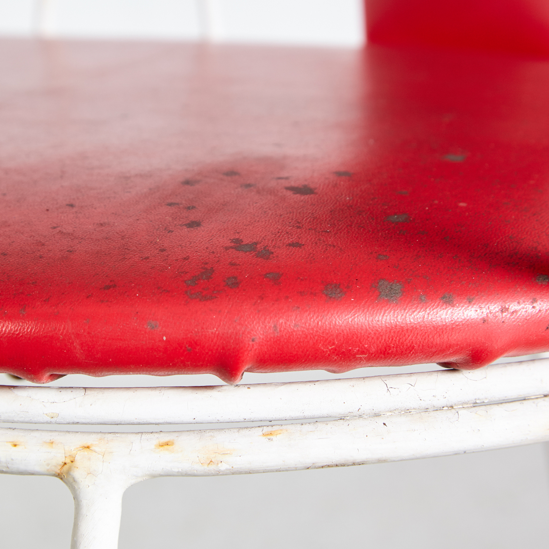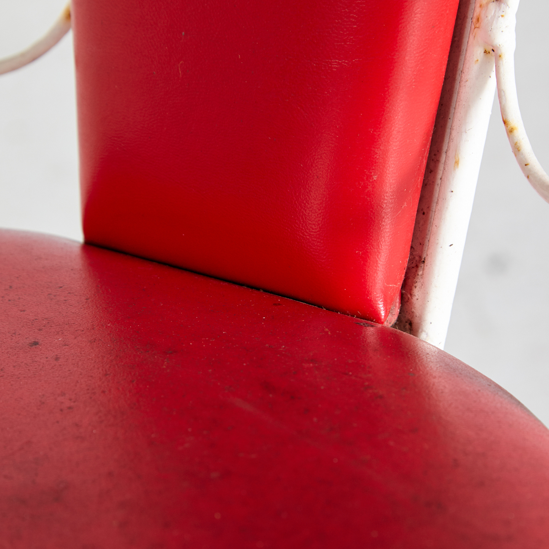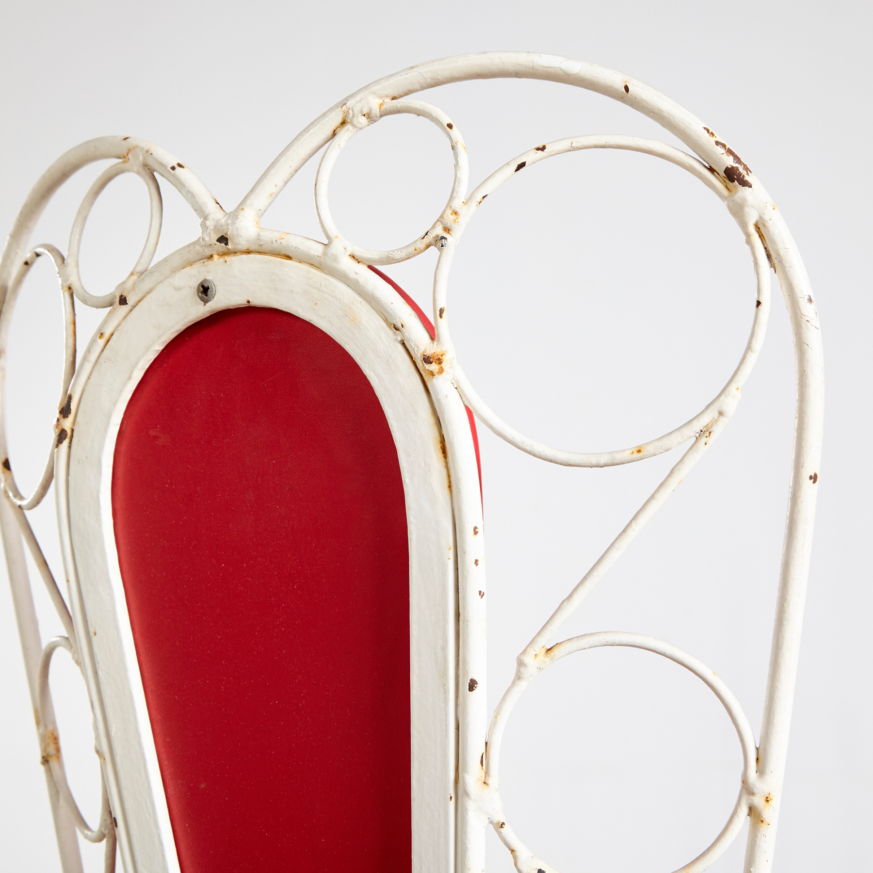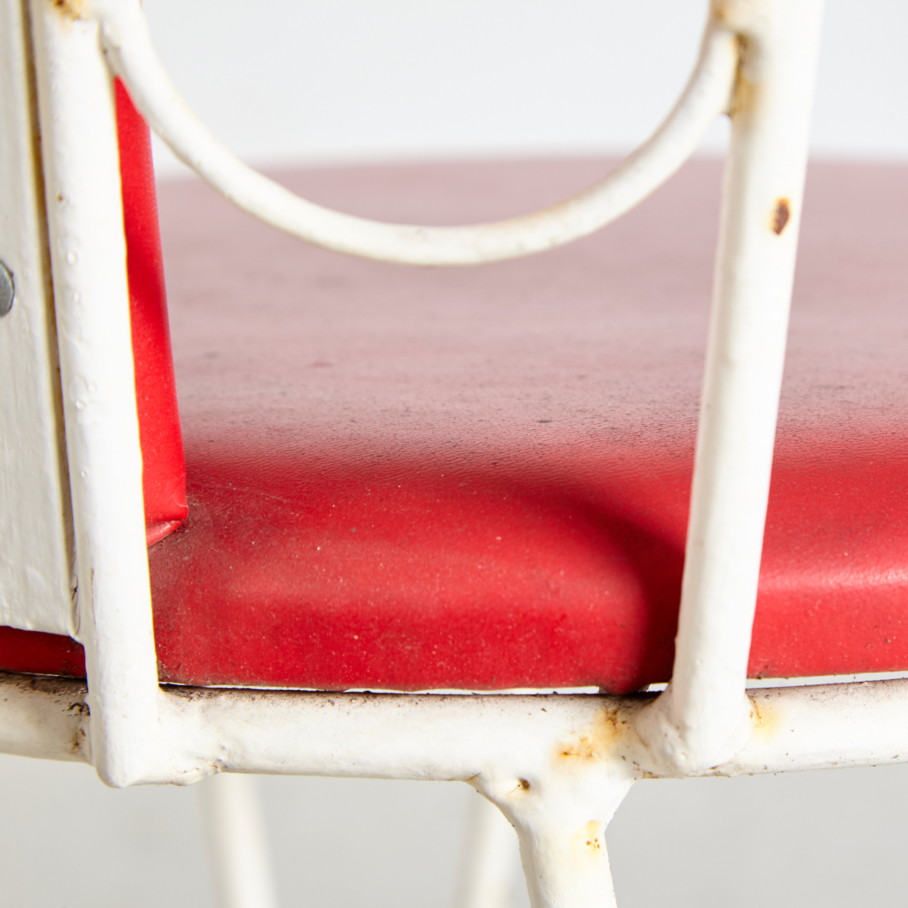 Fehérre festett kovácsoltvas kerti székek és pad. Piros műbőr ülőpárnával és párnázott hátrésszel szép vintage állapotban