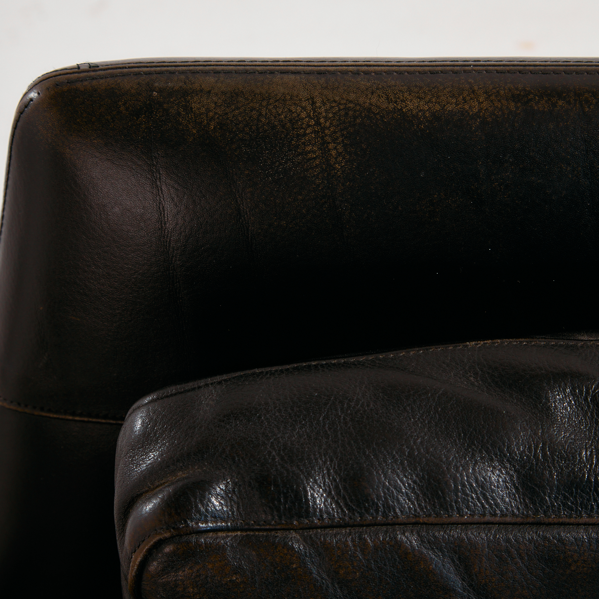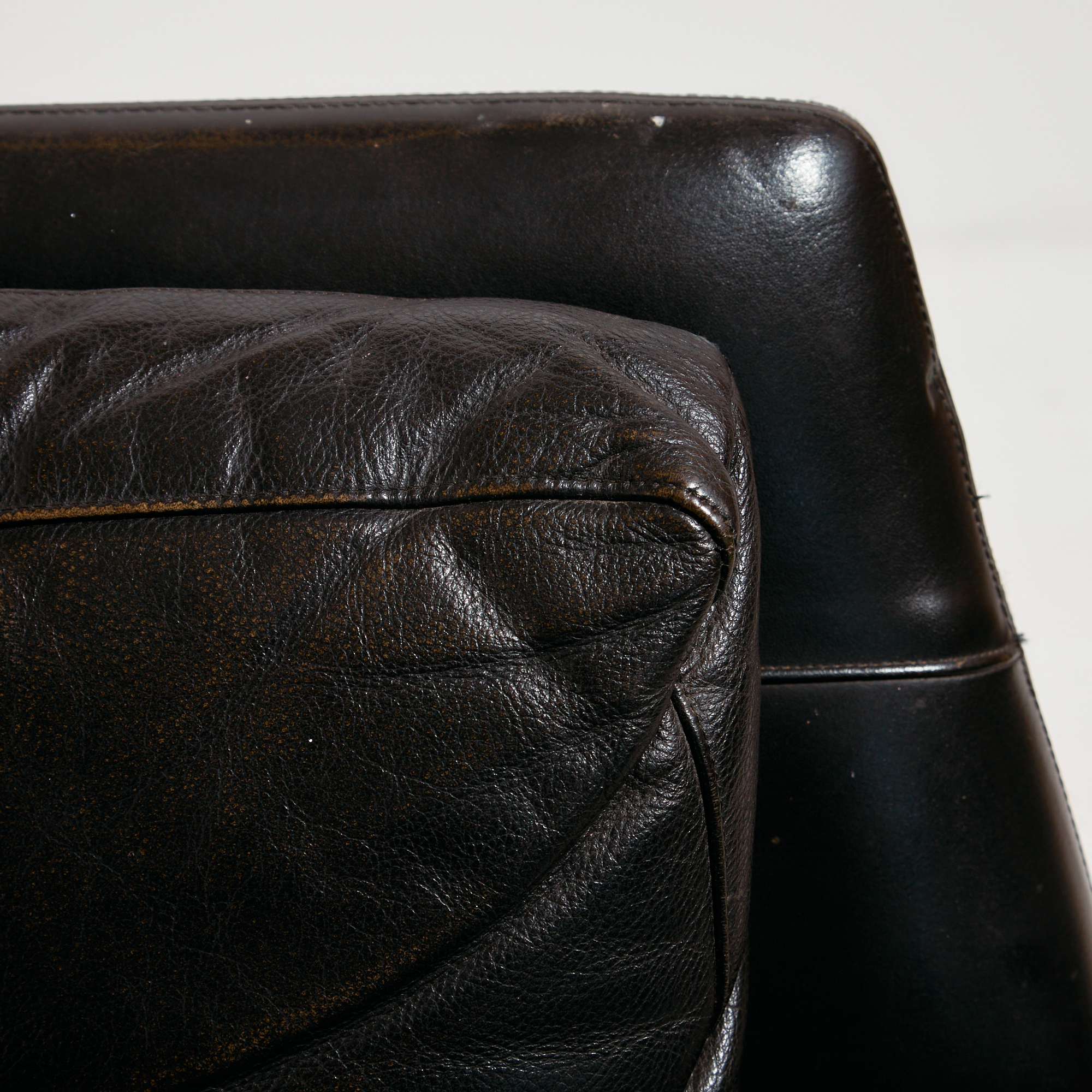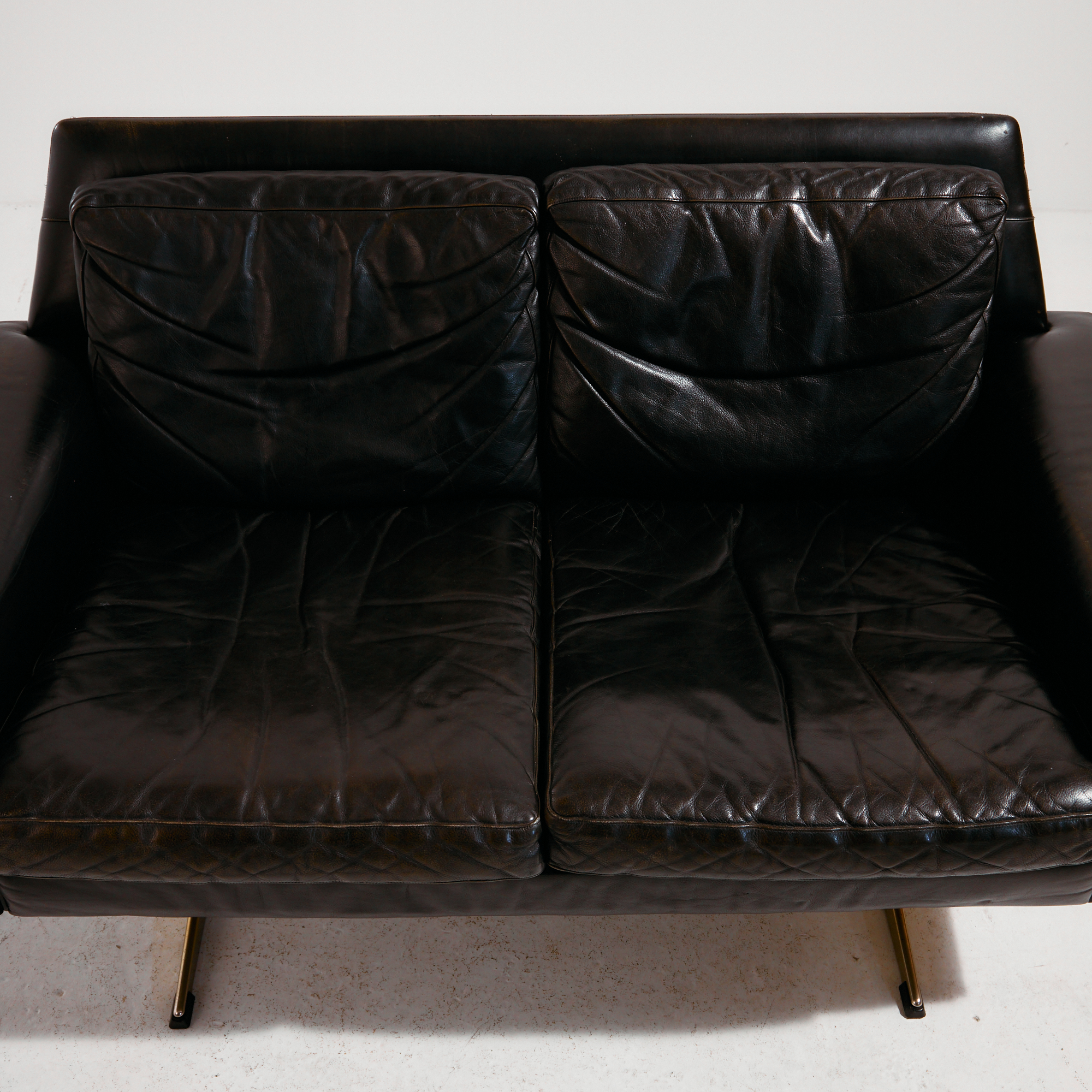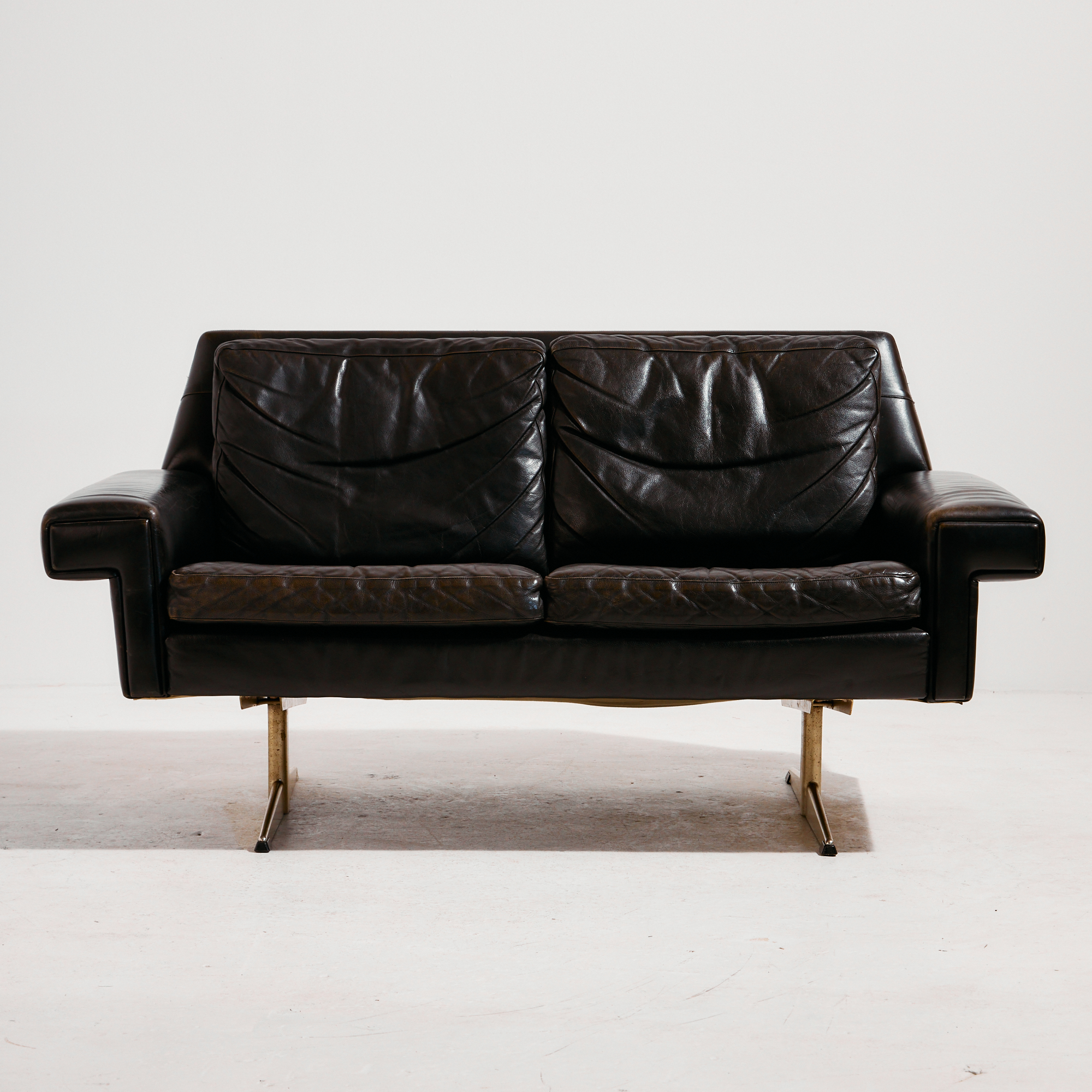 Kétszemélyes fekete bőr kanapé acél lábazaton az 1970-es évekből. Bőr kárpitozásán helyenként felületi karcokkal és kopásokkal. Az idő nyomot hagyott rajta, azonban igazán kényelmes választás lehet.