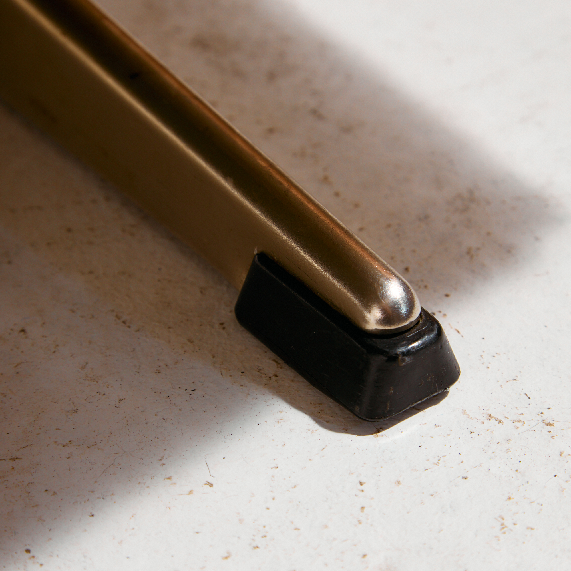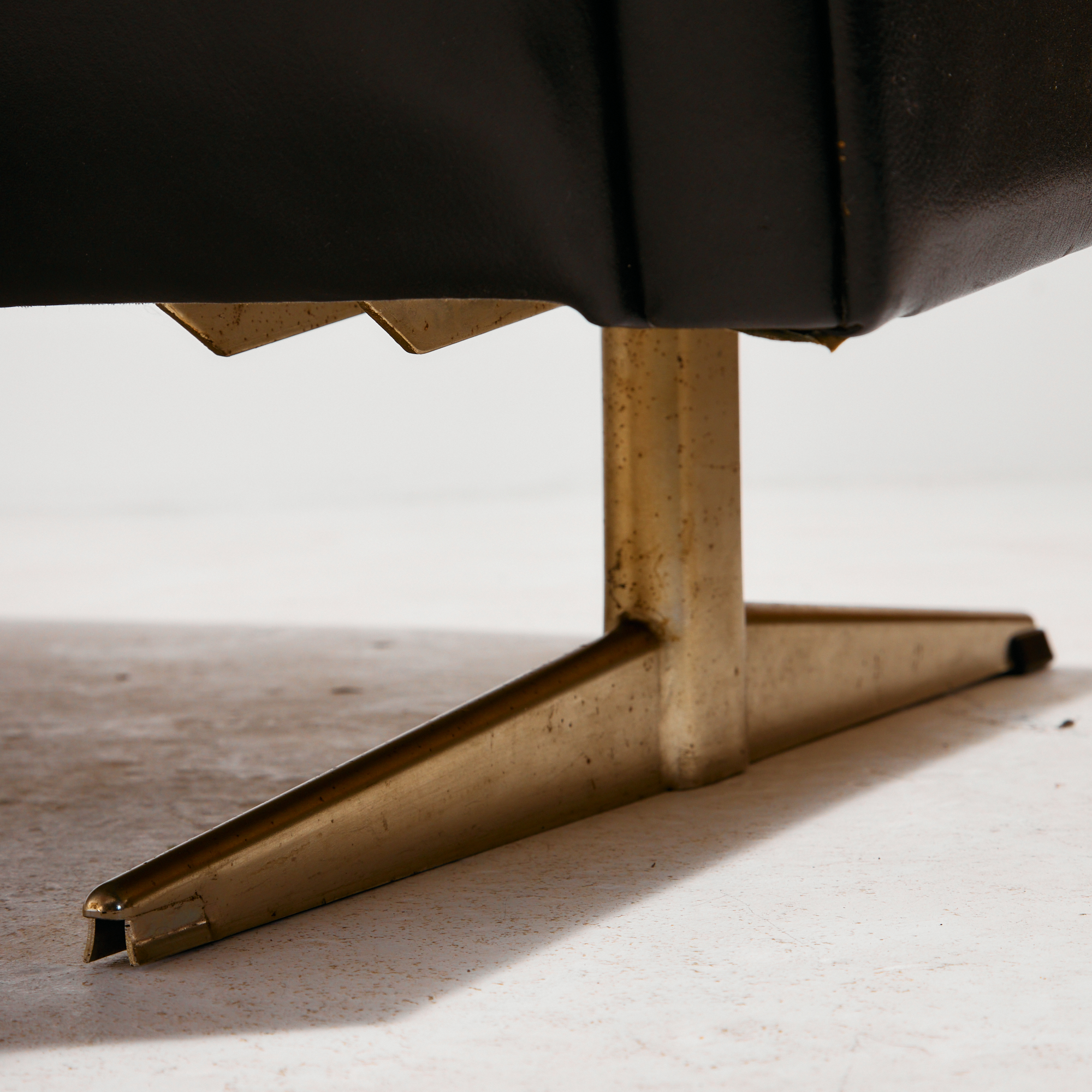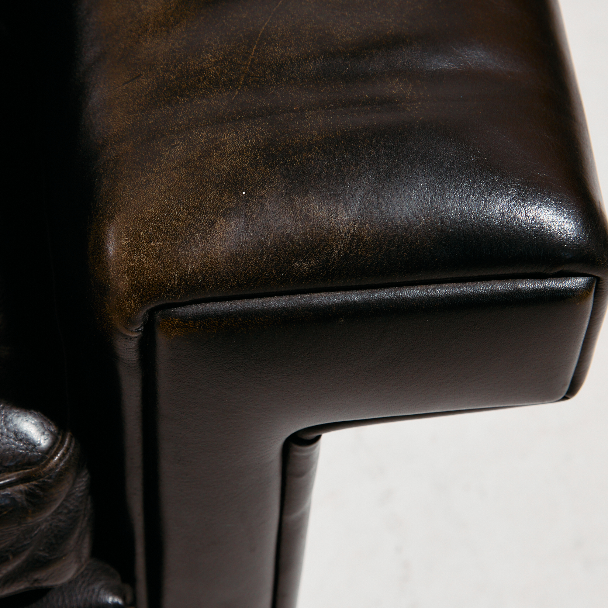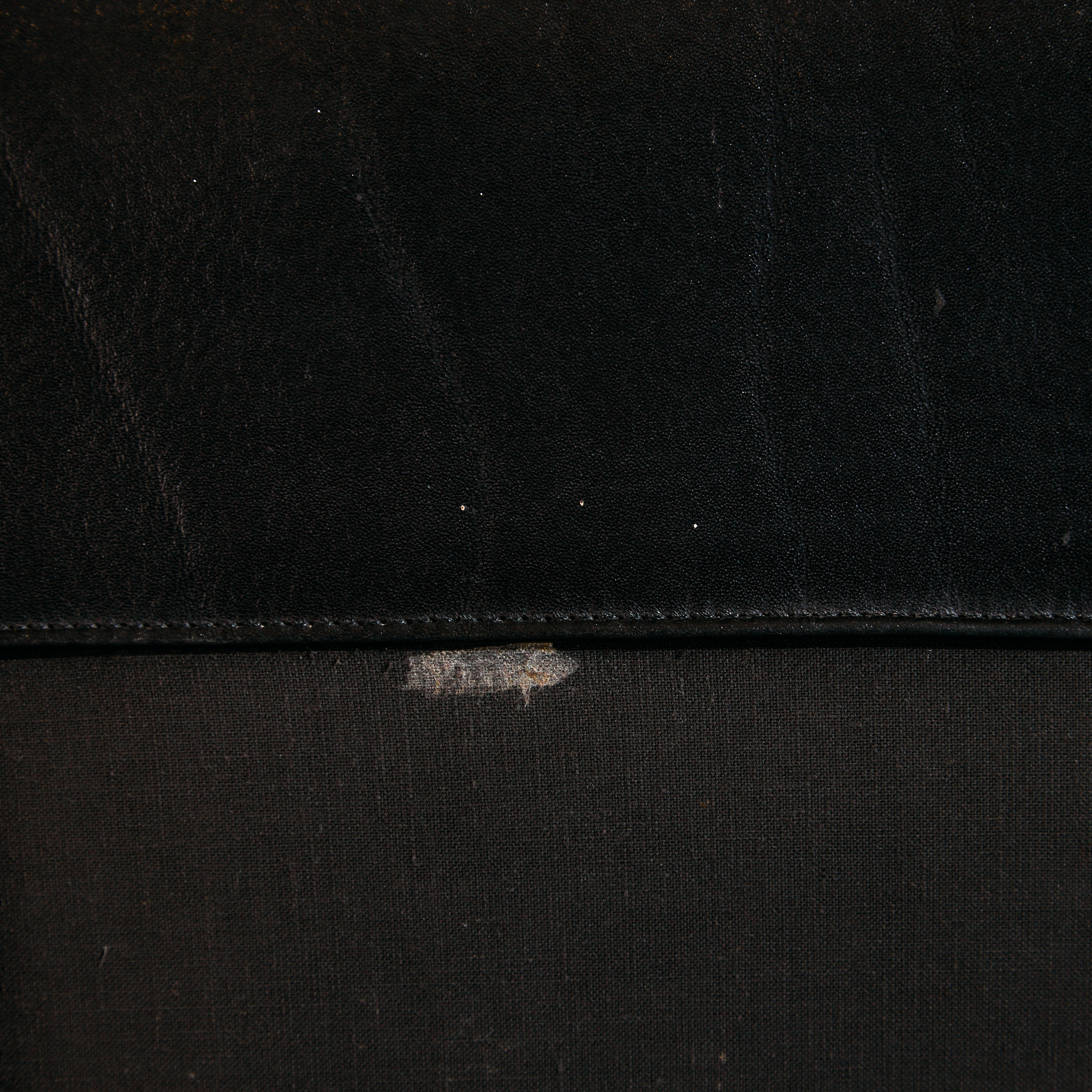 Kétszemélyes fekete bőr kanapé acél lábazaton az 1970-es évekből. Bőr kárpitozásán helyenként felületi karcokkal és kopásokkal. Az idő nyomot hagyott rajta, azonban igazán kényelmes választás lehet.