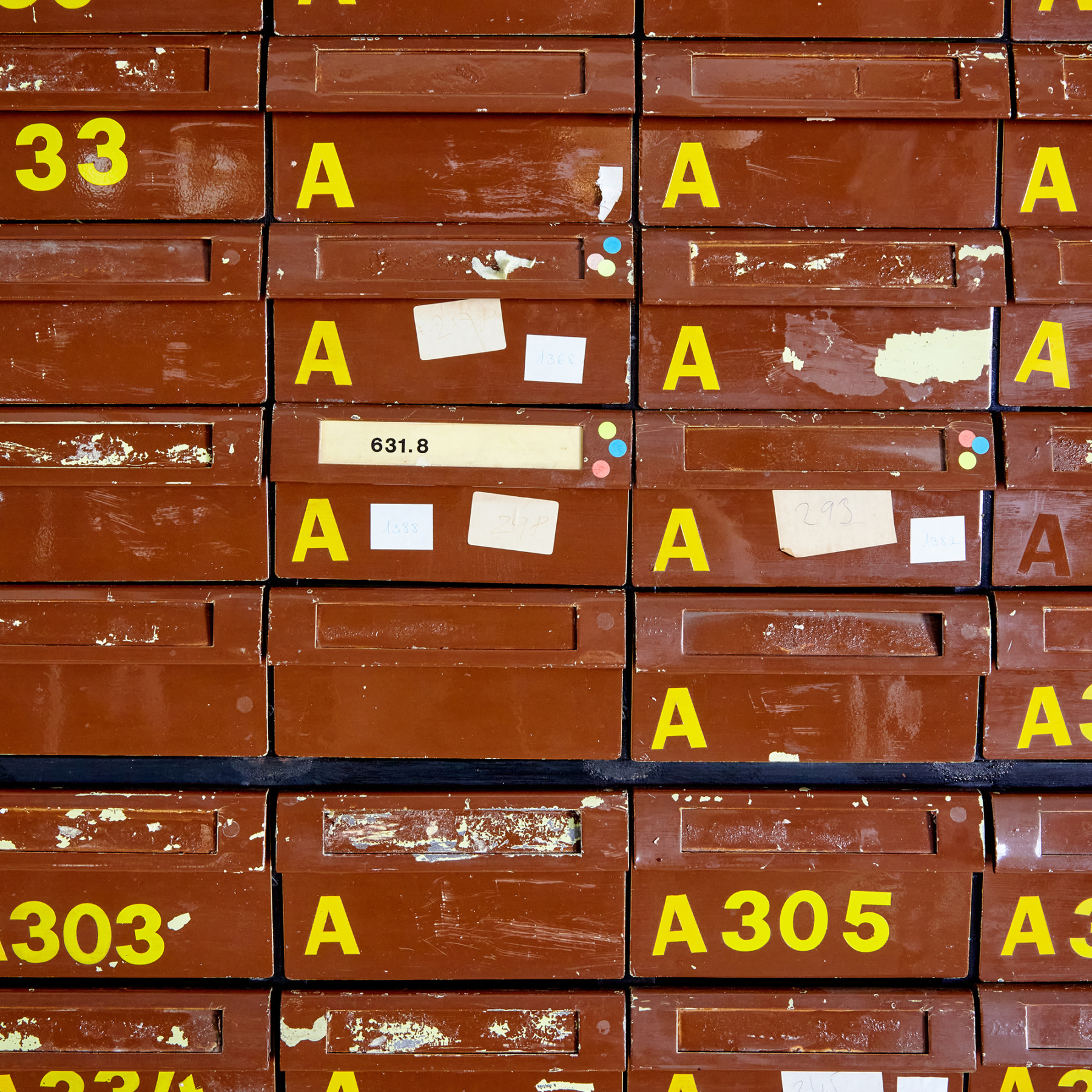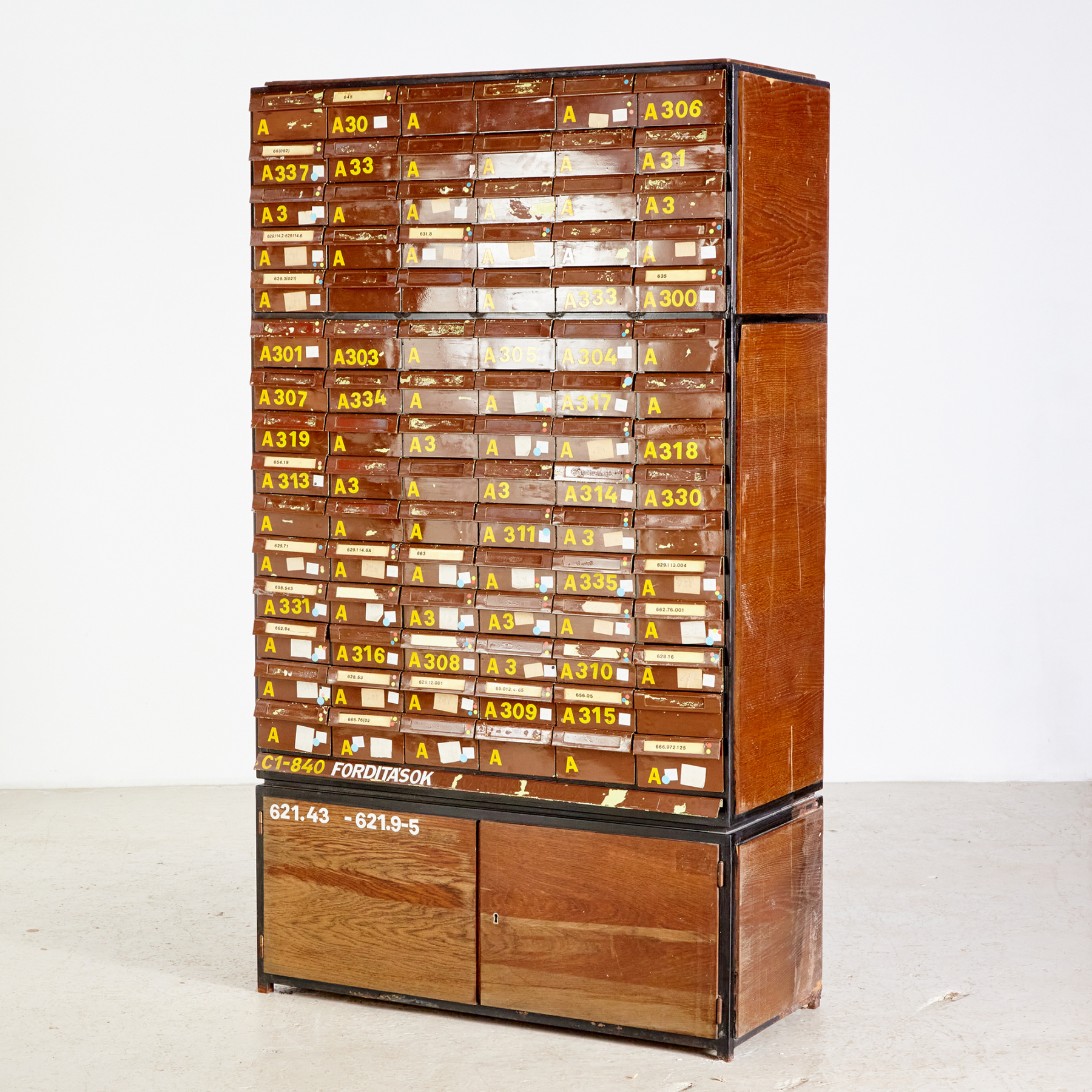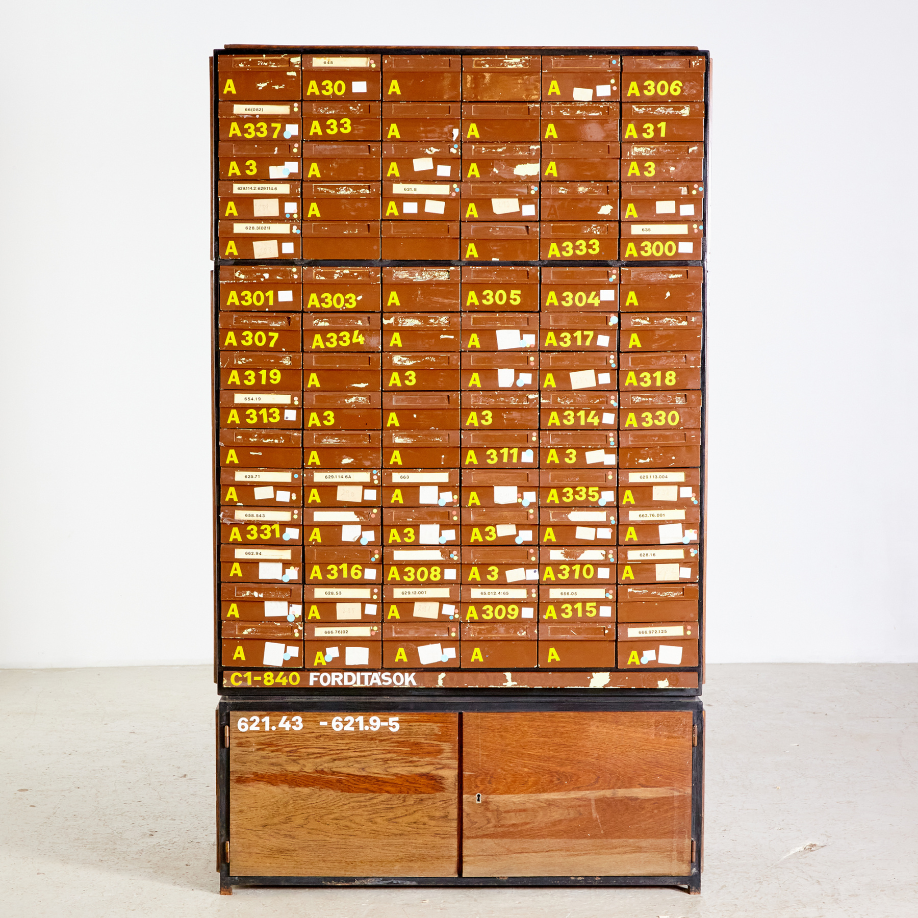 Vintage állapotú könyvtári kartotékszekrény fém fiókokkal és két ajtóval, korának megfelelő állapotban