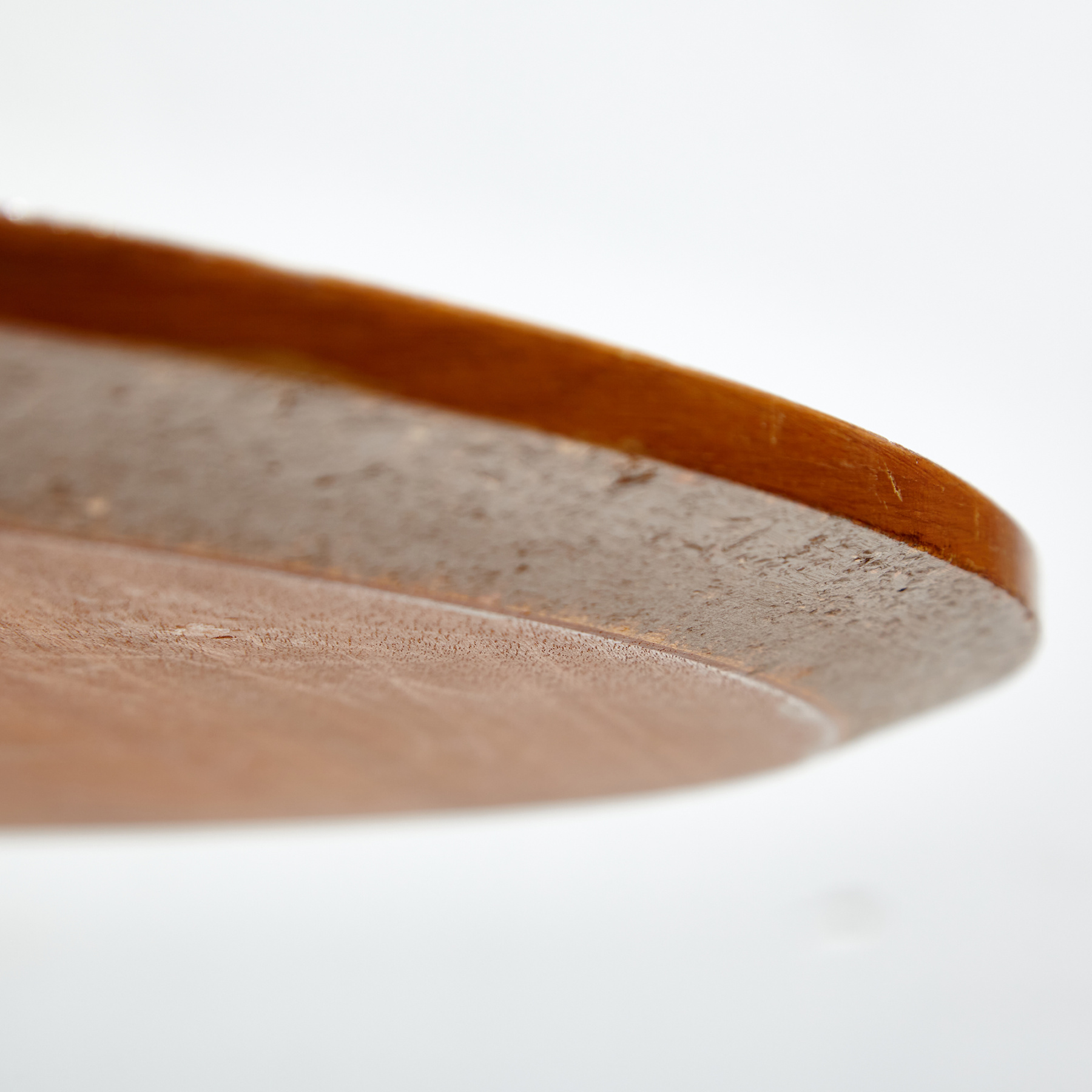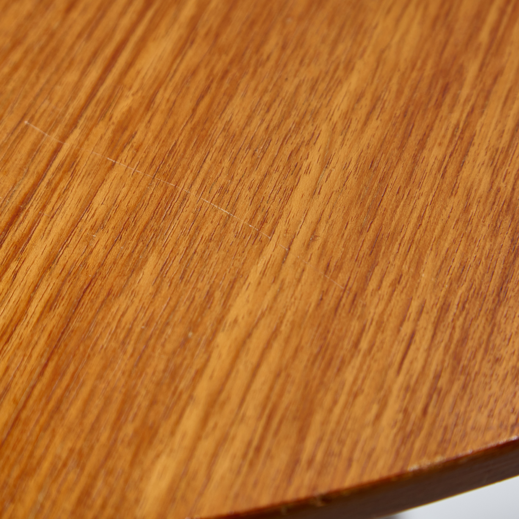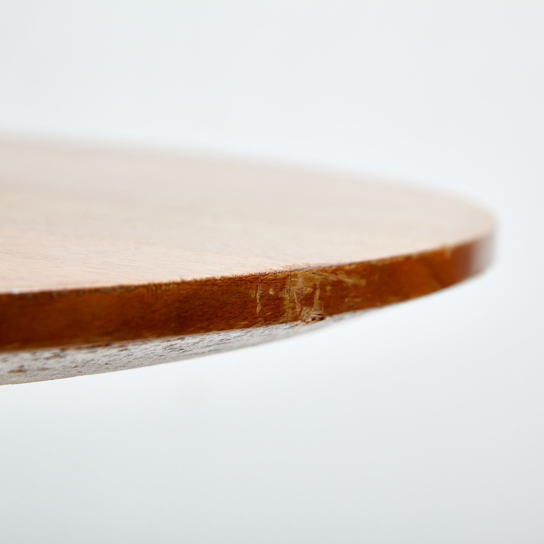 Kőris tetős dohányzóasztal négyágú acél lábazaton az 1970-es évekből. Az asztal felületén helyenként karcokkal, foltokkal és kopásokkal.