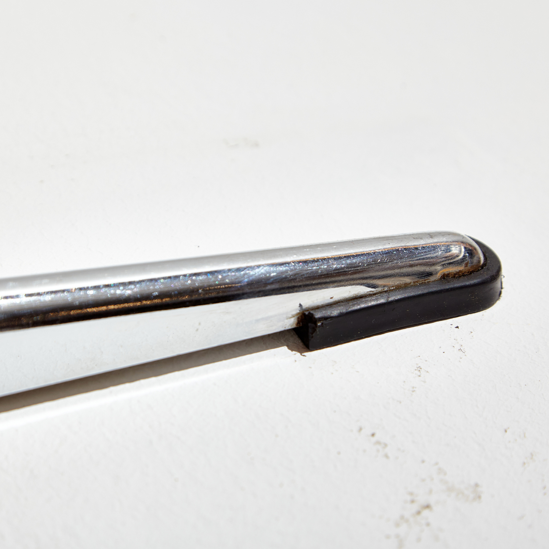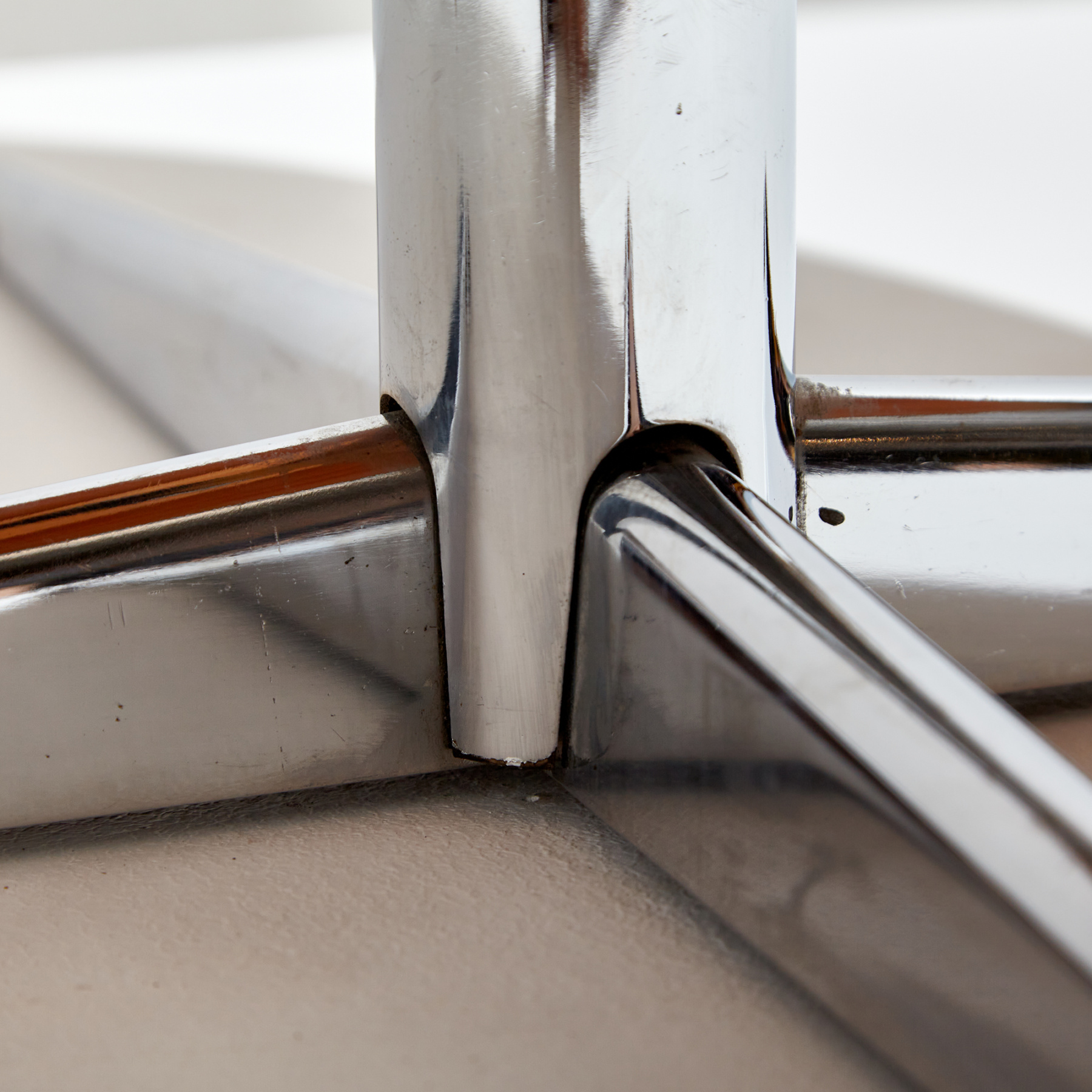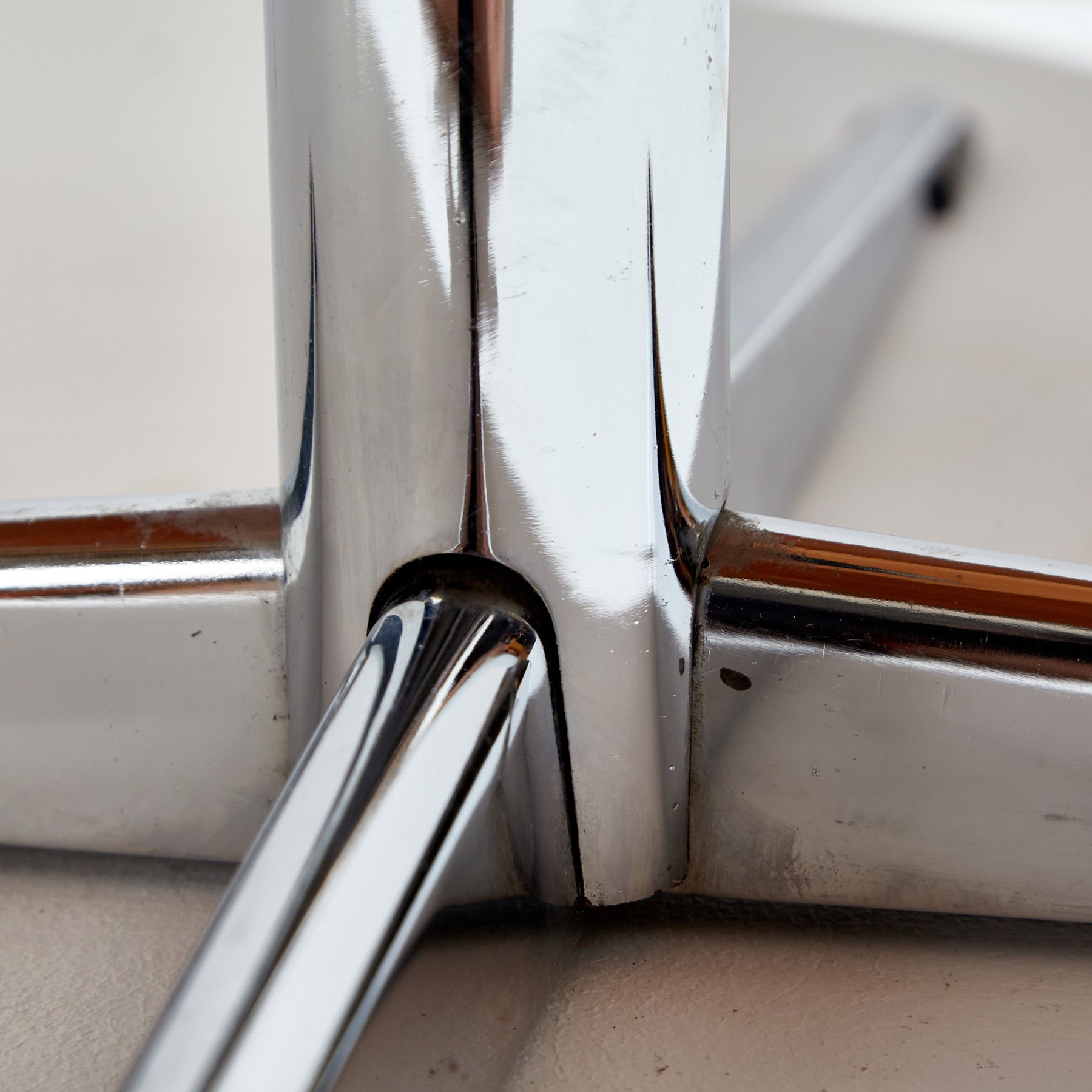 Kőris tetős dohányzóasztal négyágú acél lábazaton az 1970-es évekből. Az asztal felületén helyenként karcokkal, foltokkal és kopásokkal.