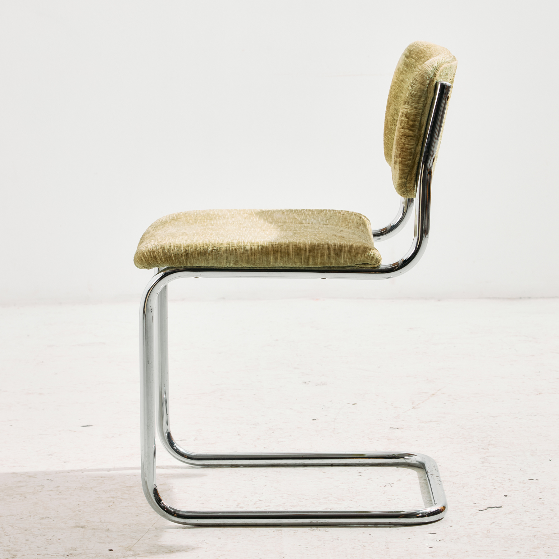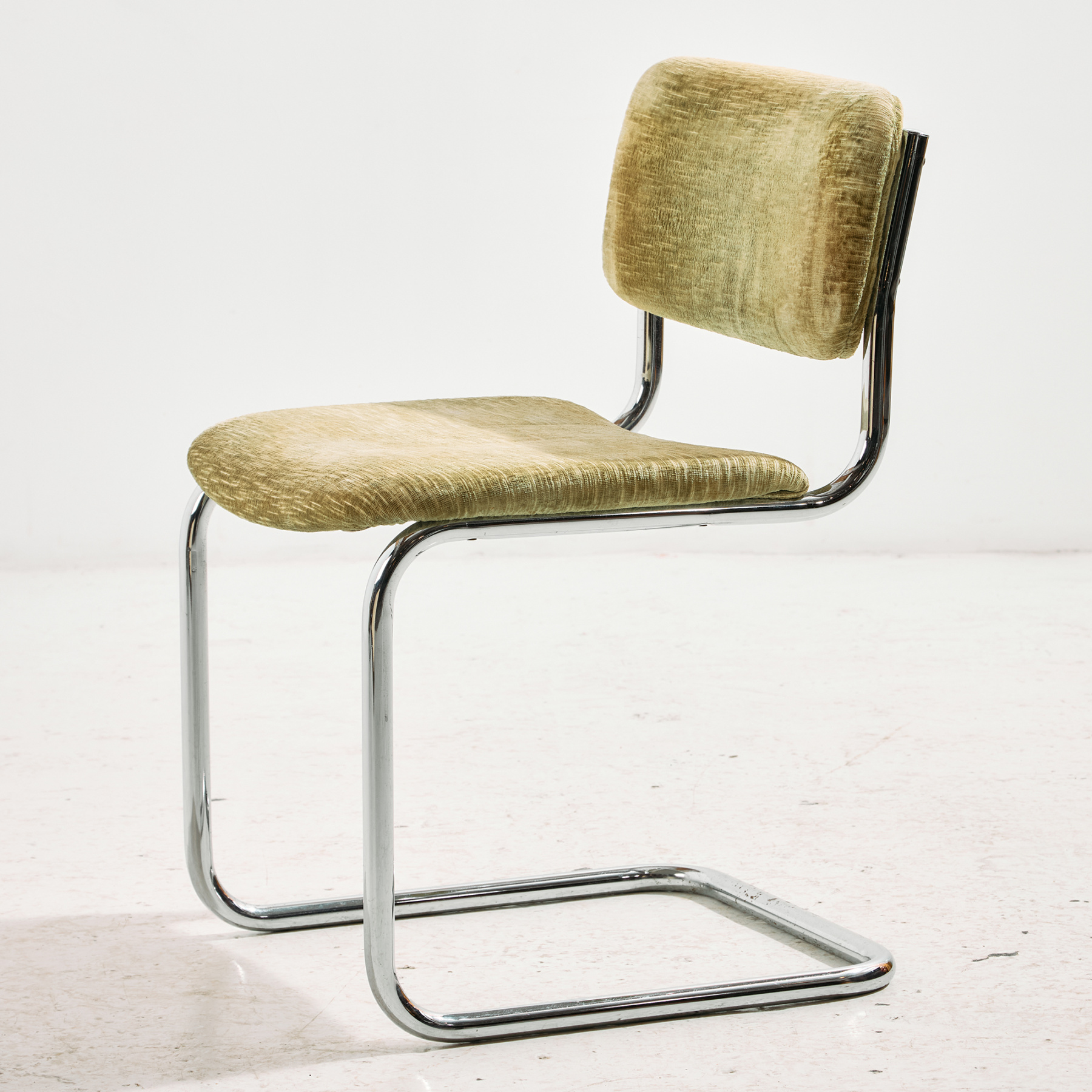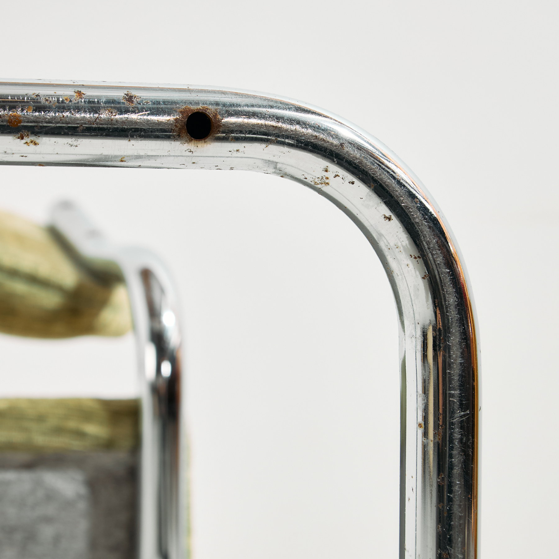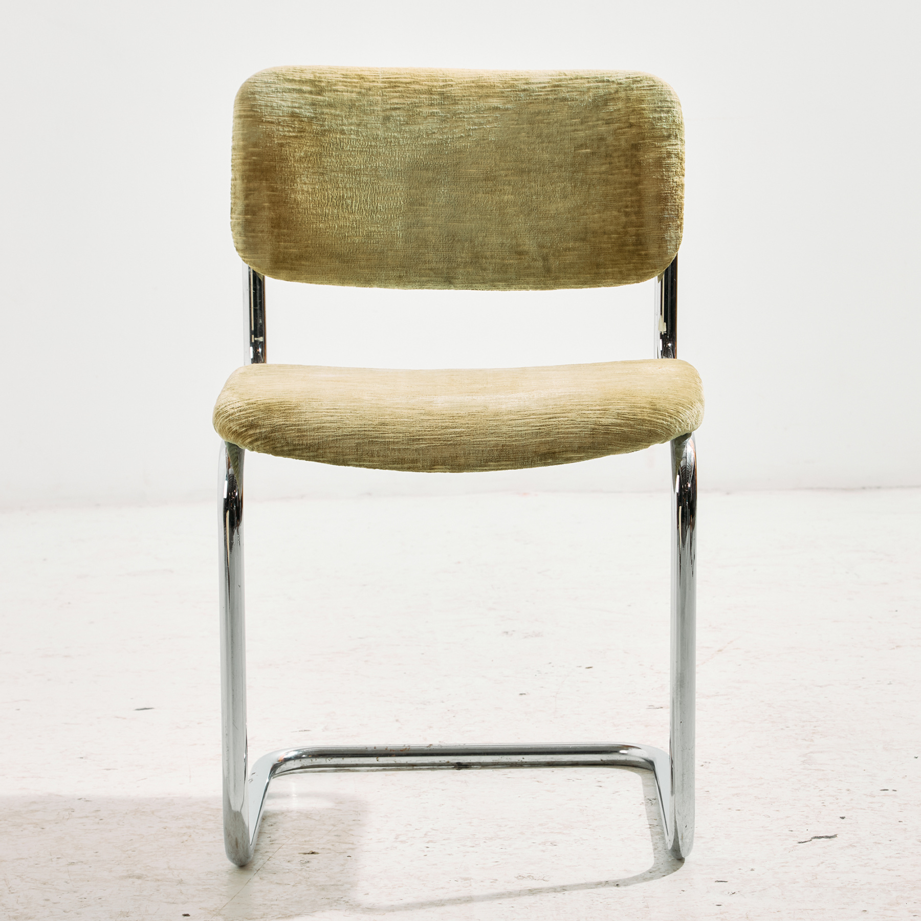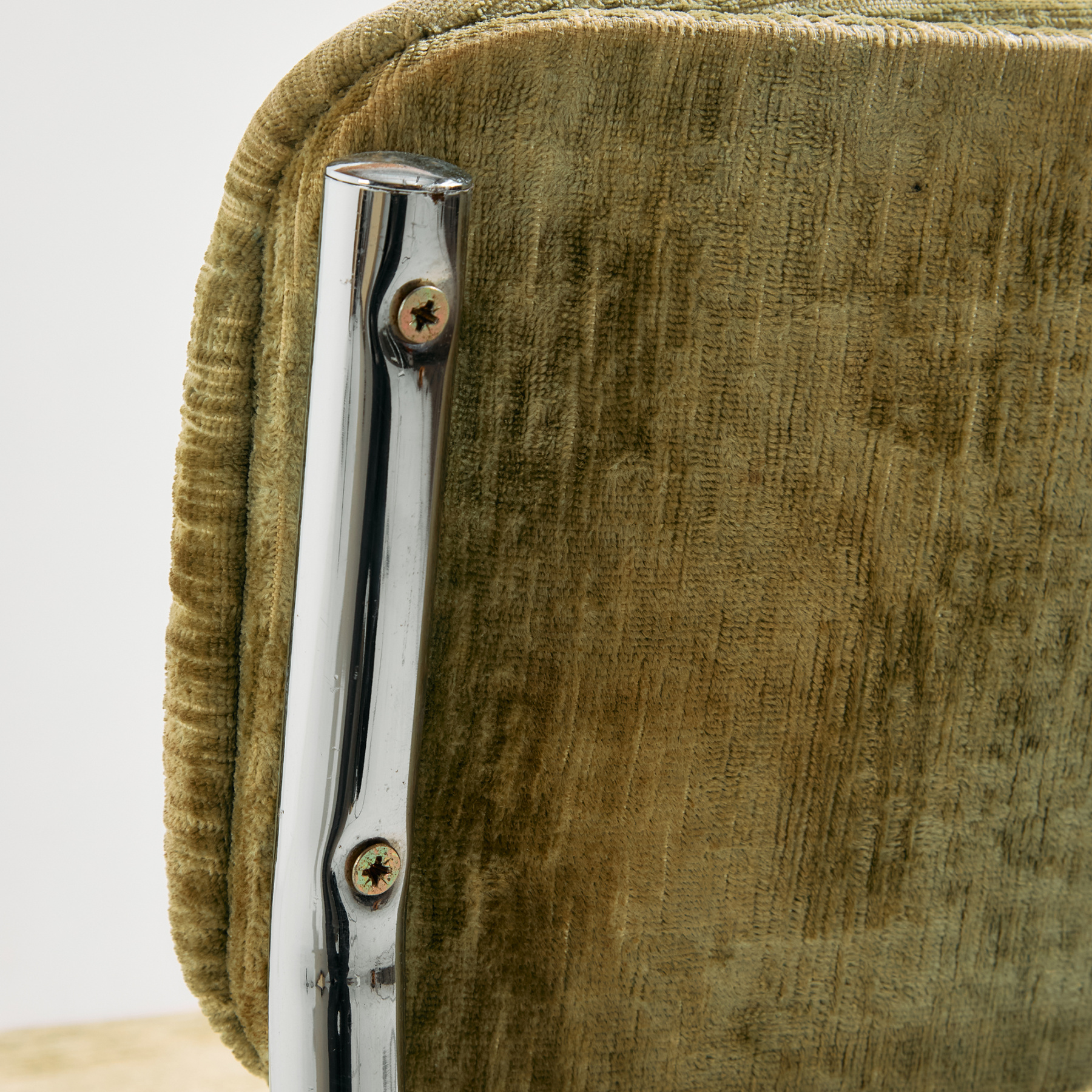Króm csővázas szék konzolos lábazattal és textil kárpitozással az 1970-es évekből. Az ülőbútor fém részein karcokkal és rozsdával. A kárpitozott részeken helyenként felületi kopással és foltokkal.