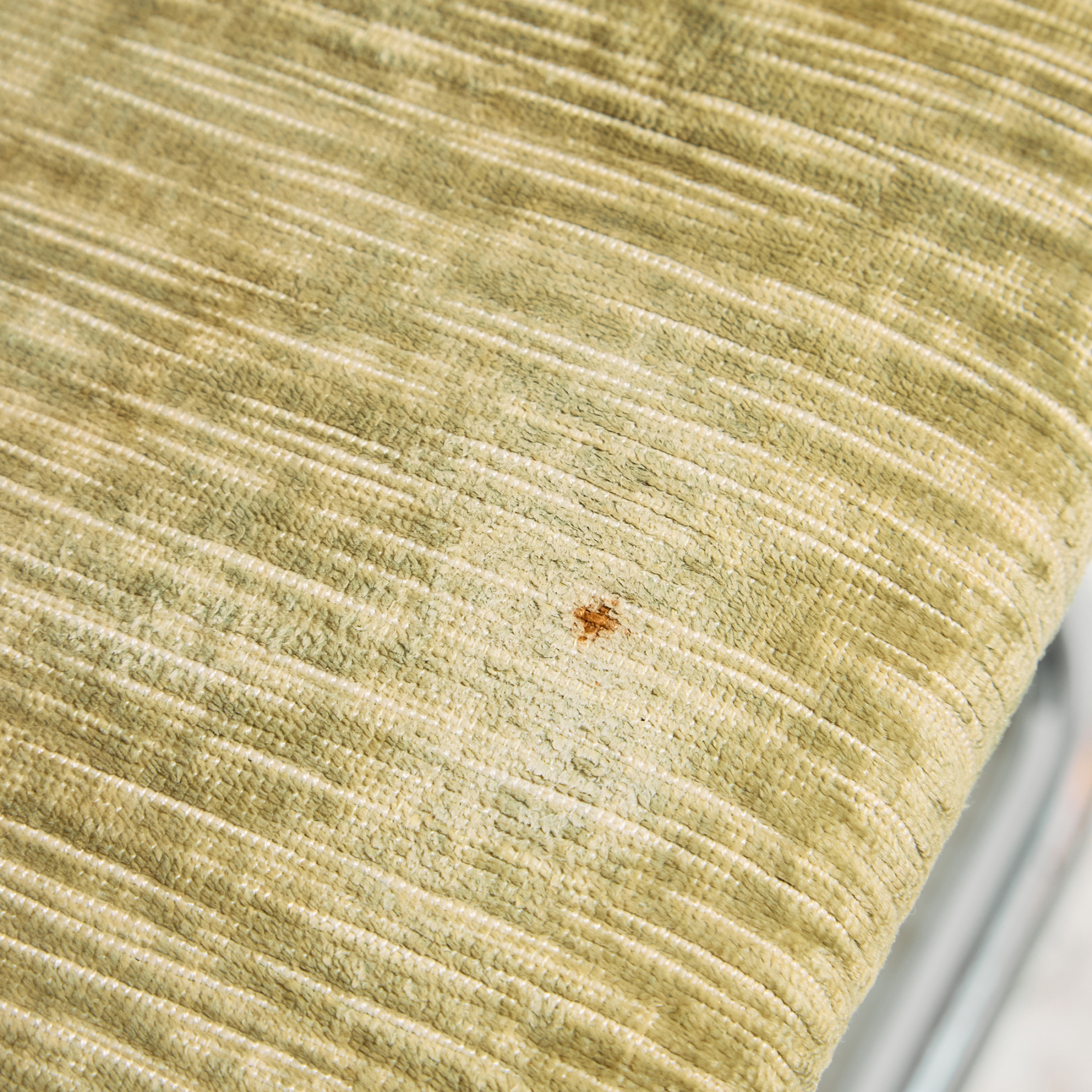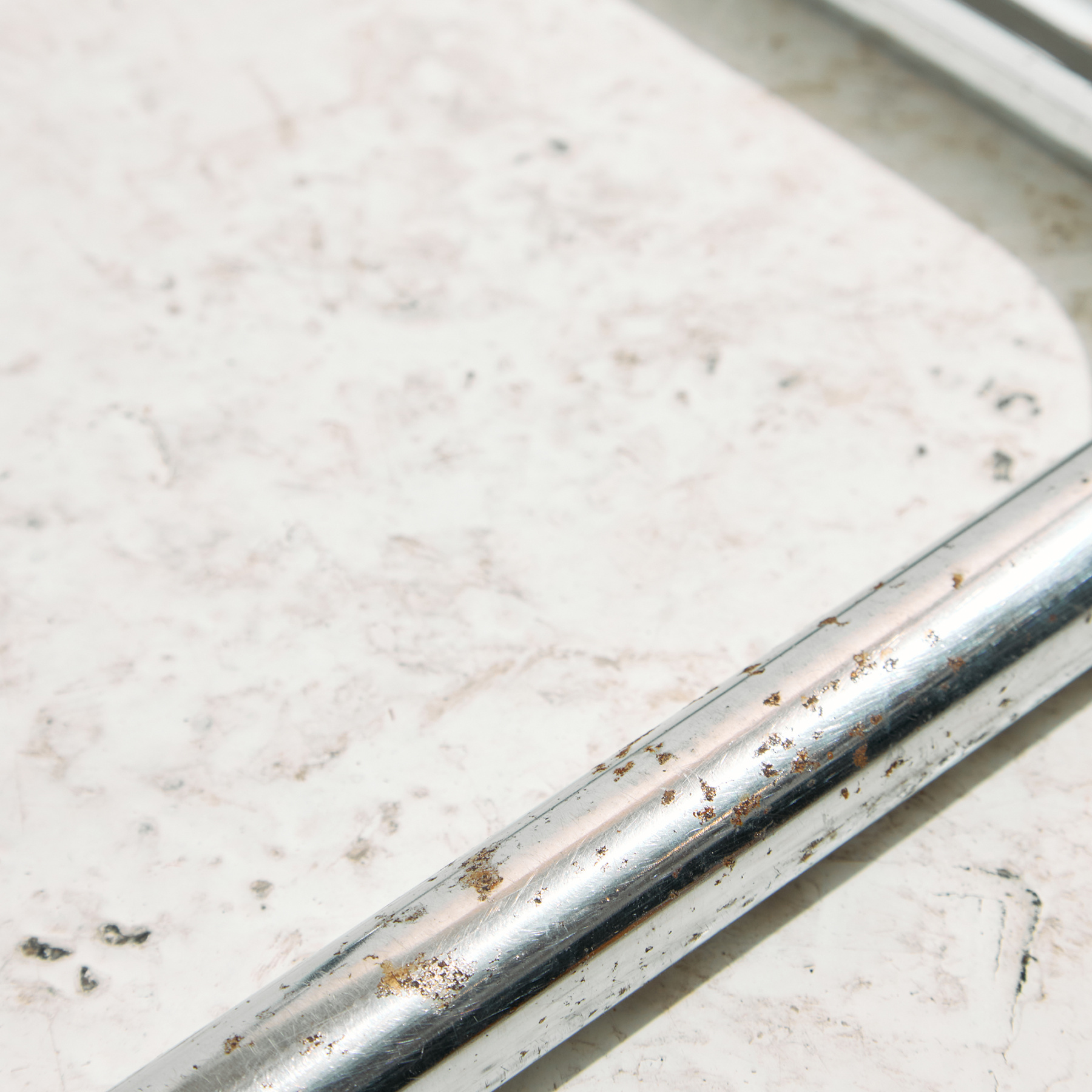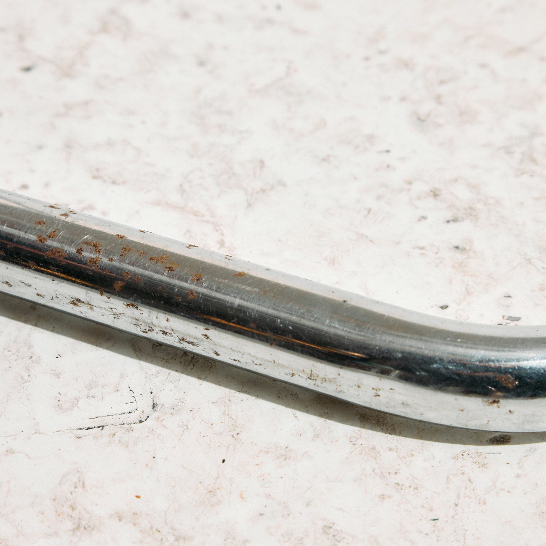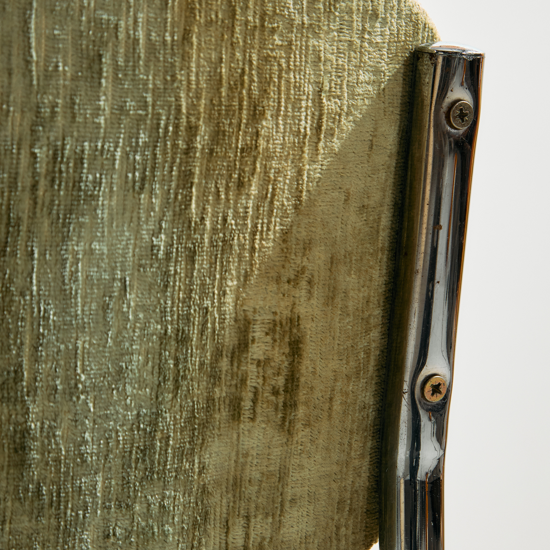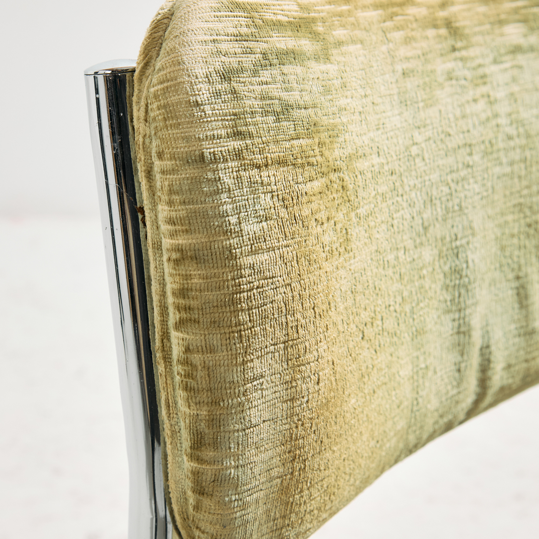 Króm csővázas szék konzolos lábazattal és textil kárpitozással az 1970-es évekből. Az ülőbútor fém részein karcokkal és rozsdával. A kárpitozott részeken helyenként felületi kopással és foltokkal.