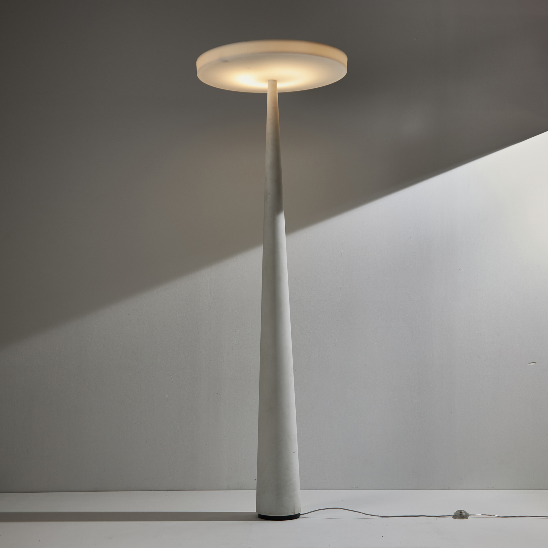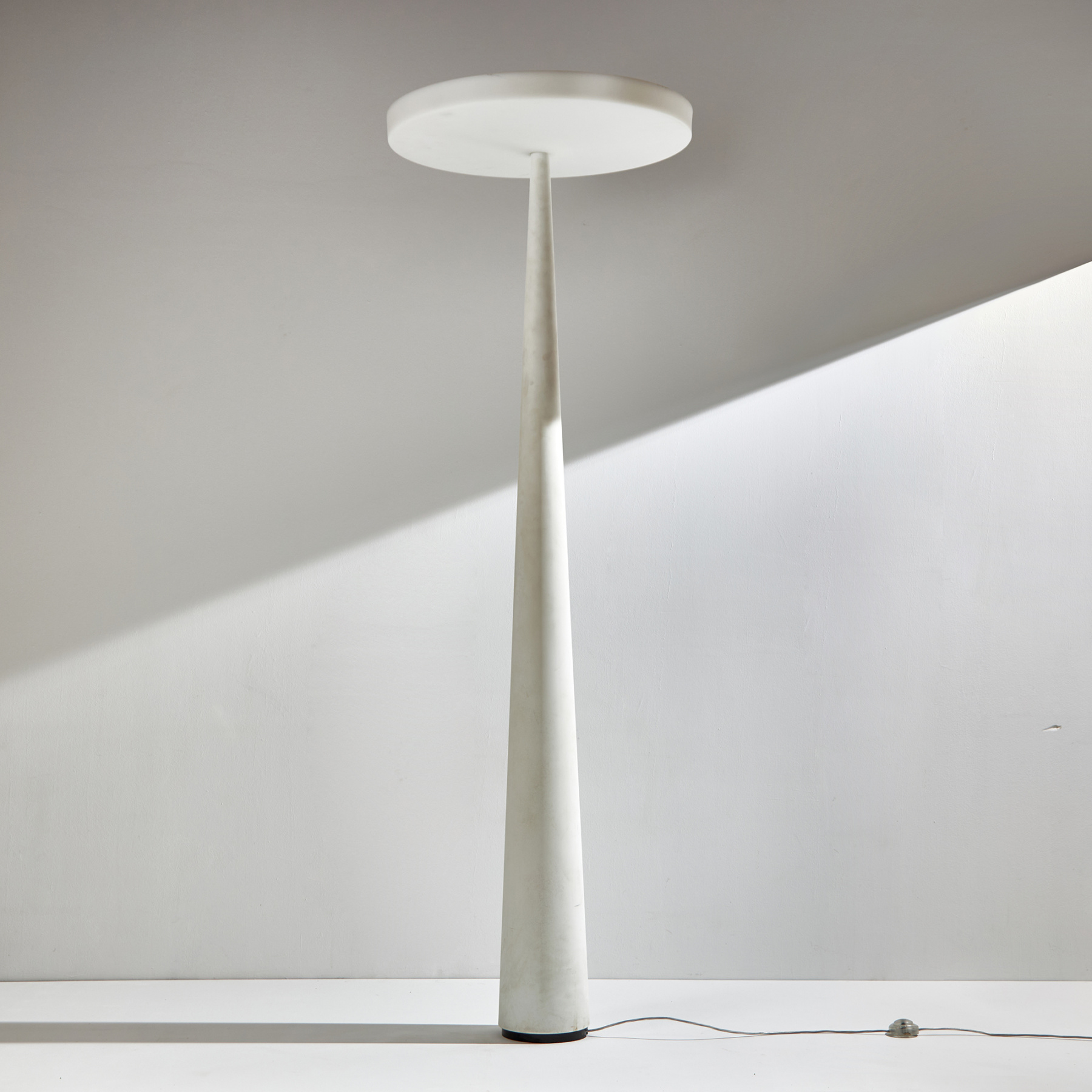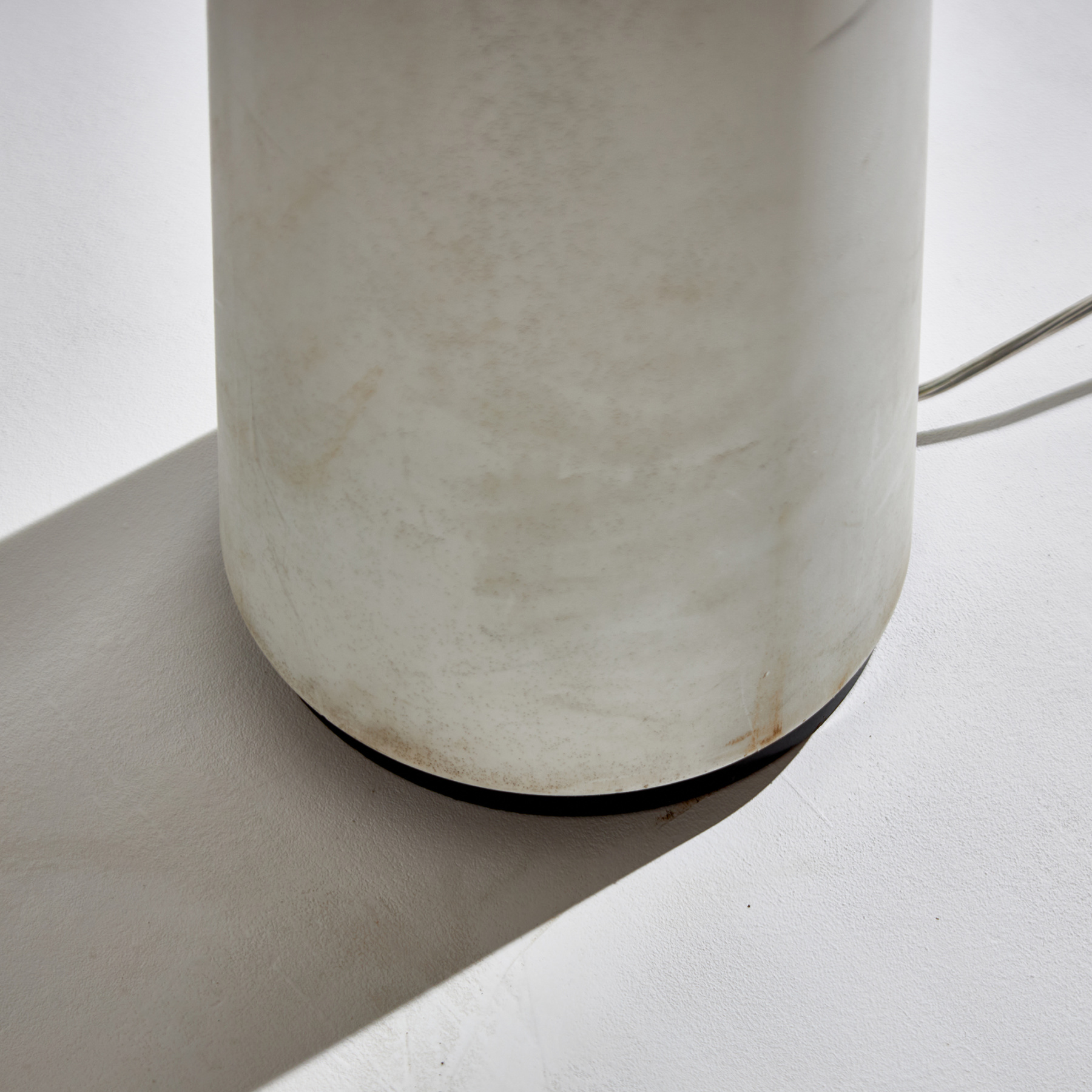 Luc Ramael által a Prandina számára tervezett ‘Equilibre F3’ állólámpa a 2000-es évekből. A lámpa műanyag és alumínium felületén helyenként karcokkal, foltokkal és kopásokkal.