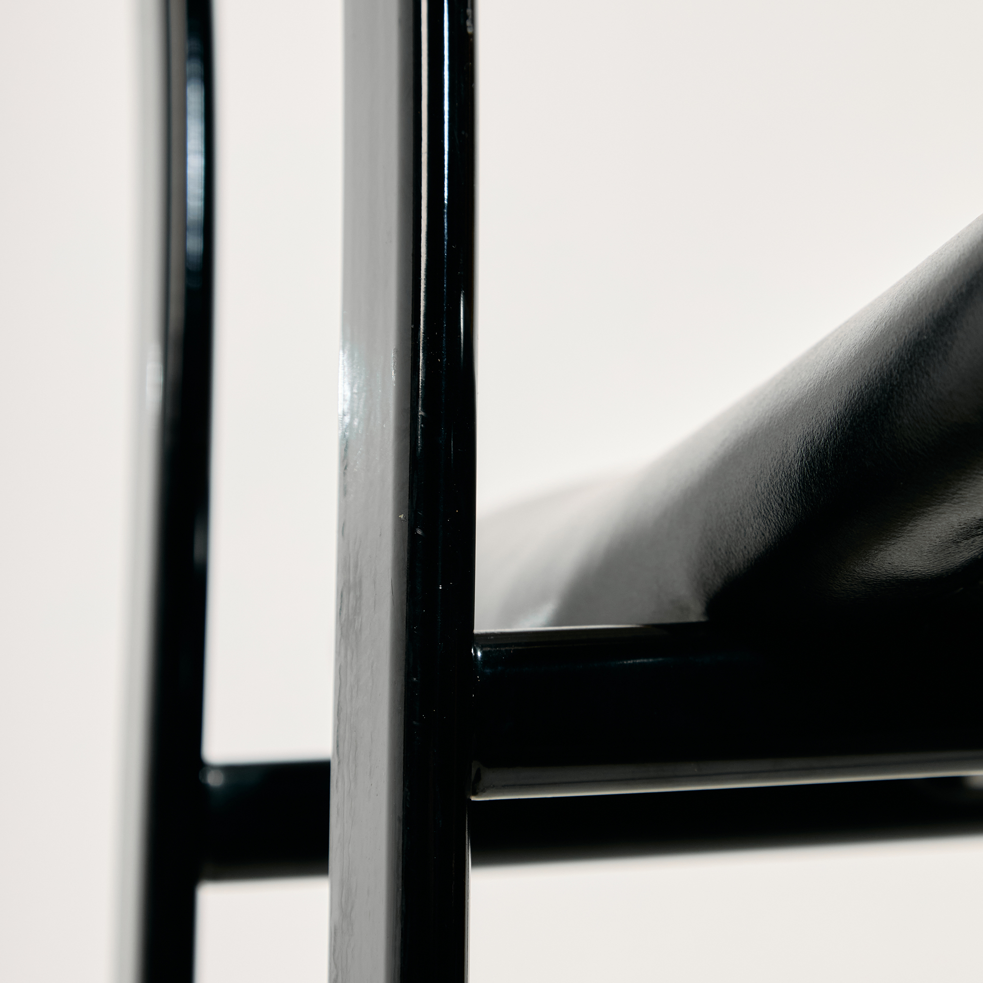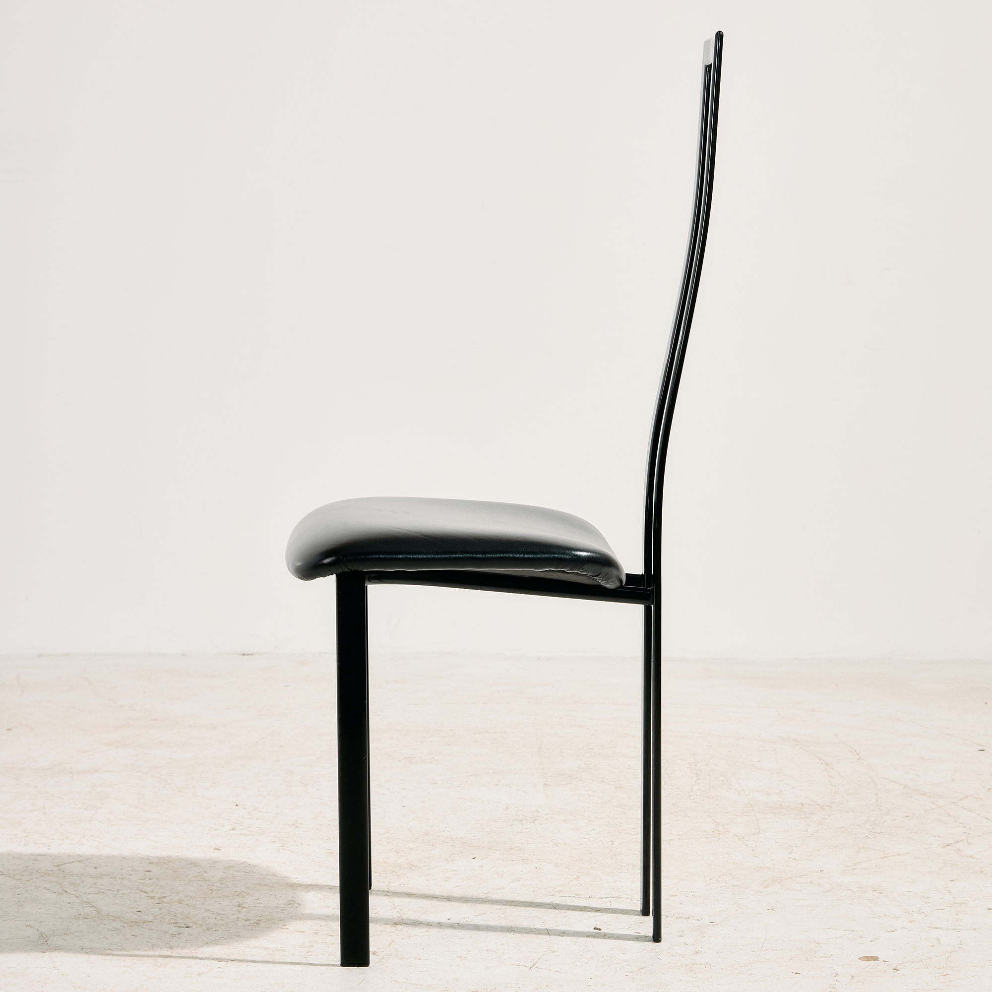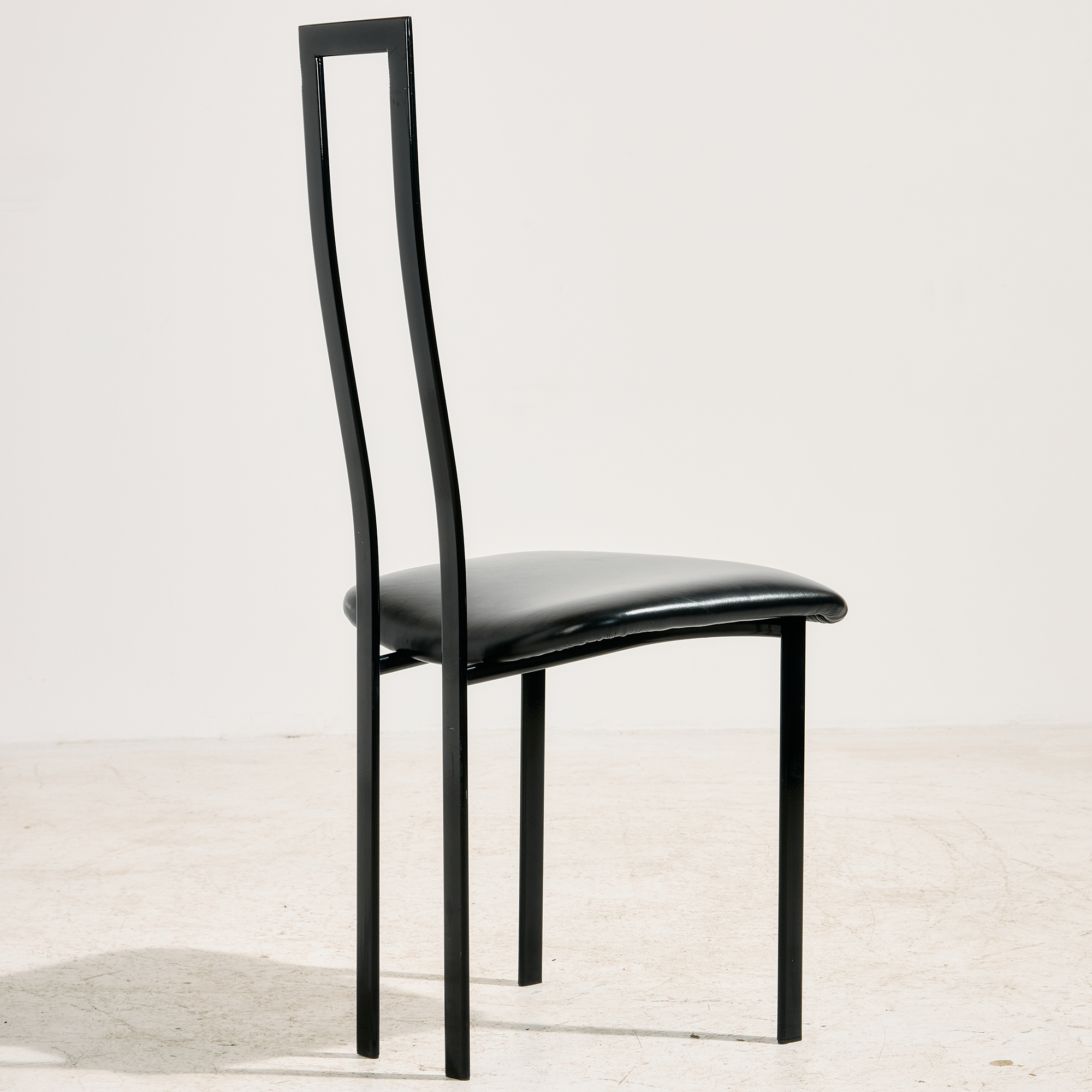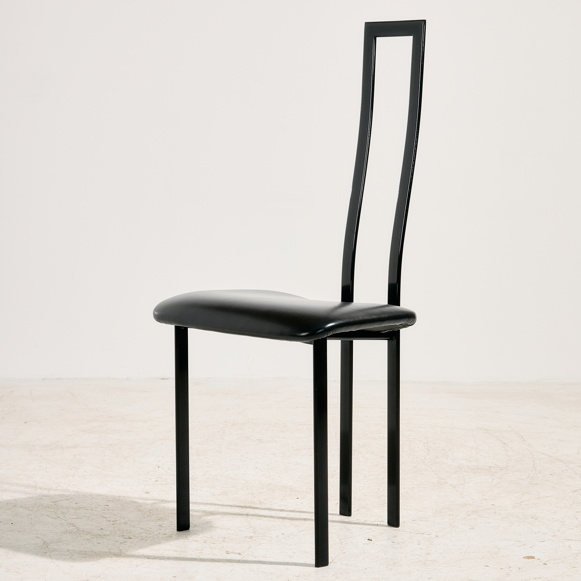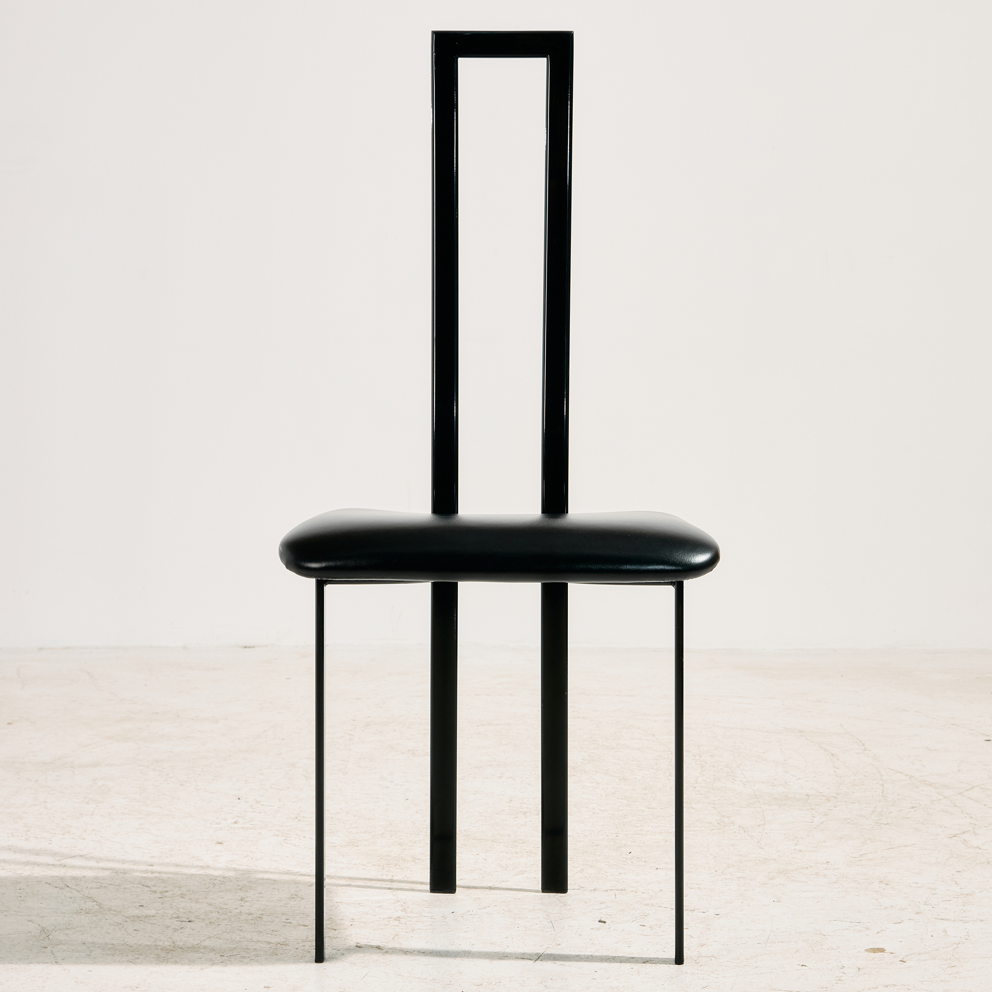 Maurizio Cattelan által a Cattelan számára tervezett posztmodern étkezőszékek az 1980-as évekből. Fémből készült szoborszerű háttámlával és szögletes, új bőr kárpitozással ellátott ülőrésszel. A szék fém felületén helyenként karcokkal, foltokkal és kopásokkal.