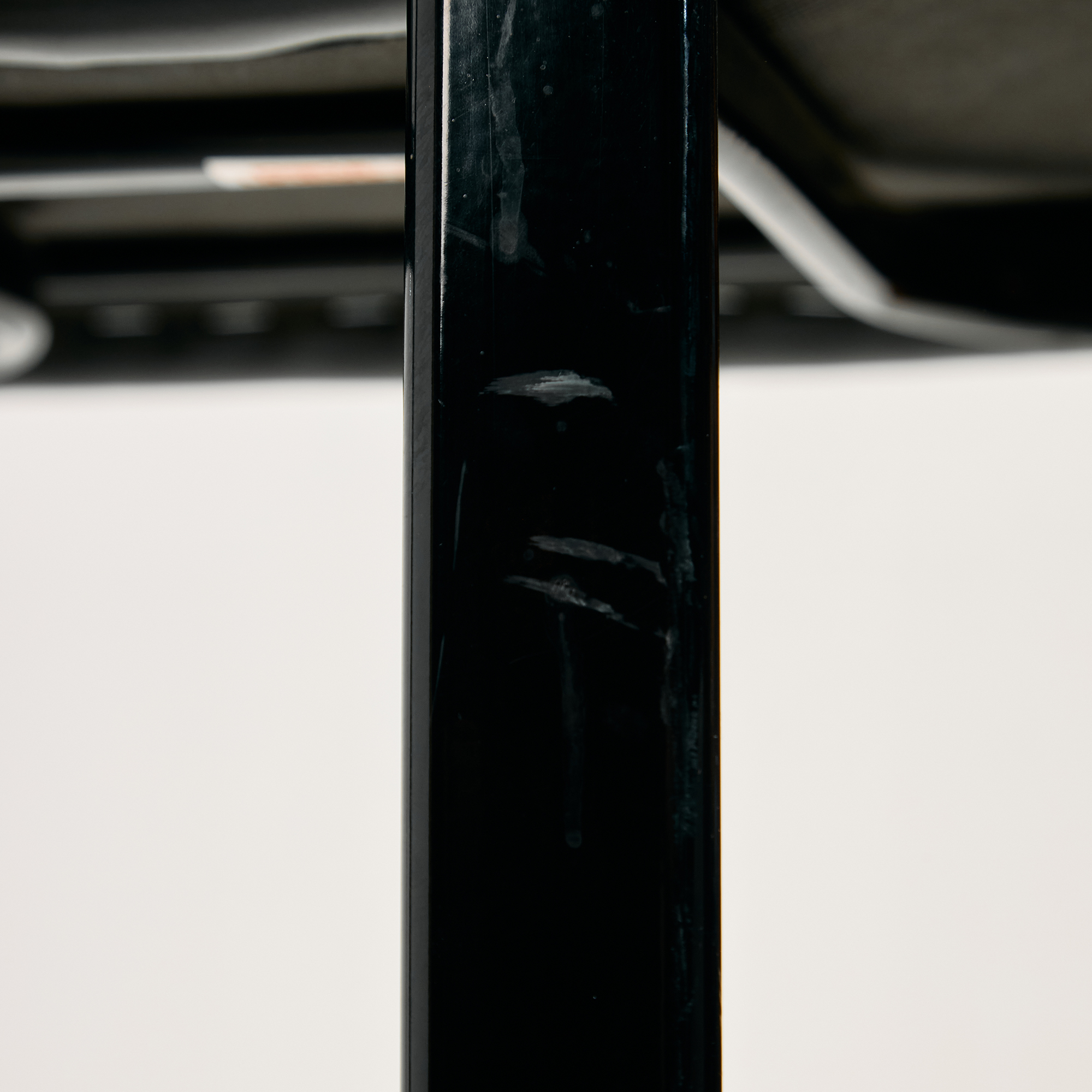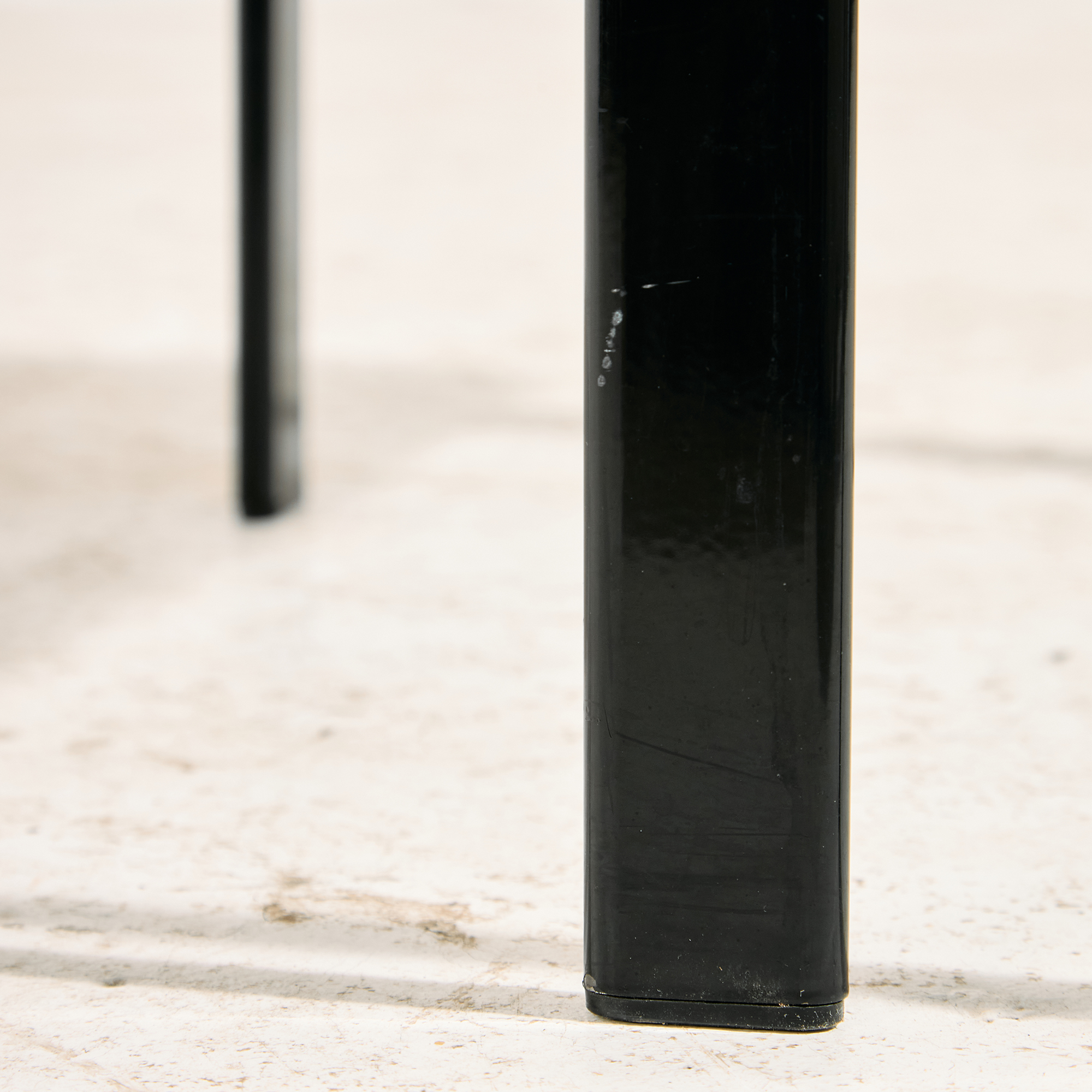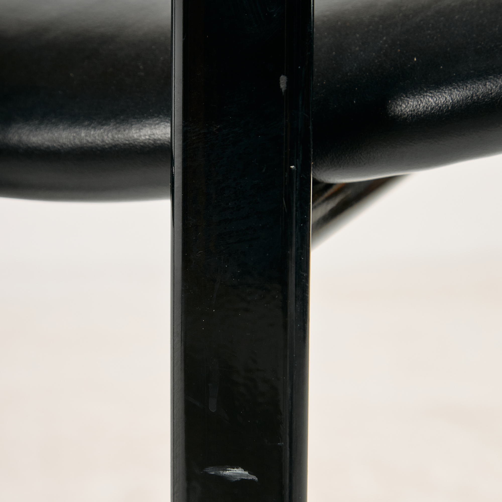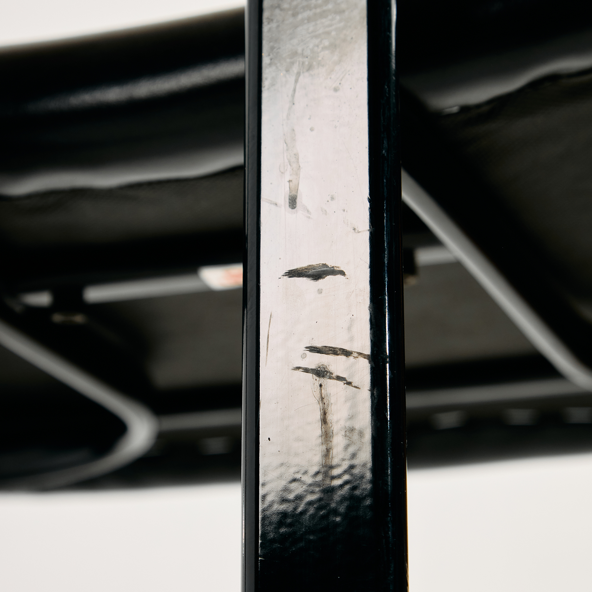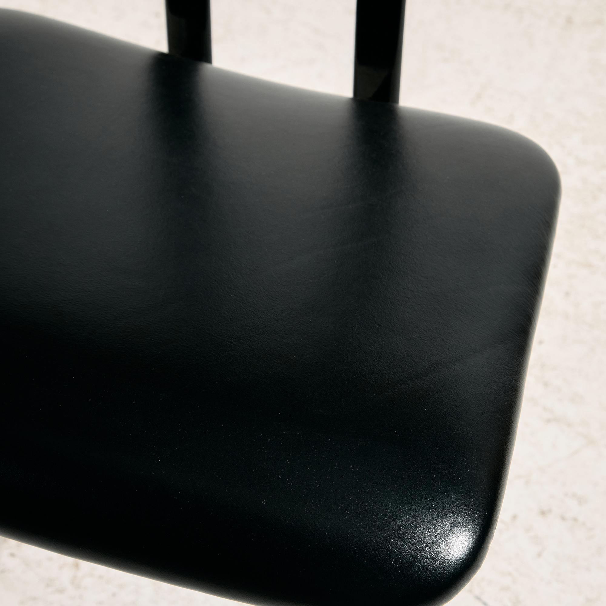 Maurizio Cattelan által a Cattelan számára tervezett posztmodern étkezőszékek az 1980-as évekből. Fémből készült szoborszerű háttámlával és szögletes, új bőr kárpitozással ellátott ülőrésszel. A szék fém felületén helyenként karcokkal, foltokkal és kopásokkal.