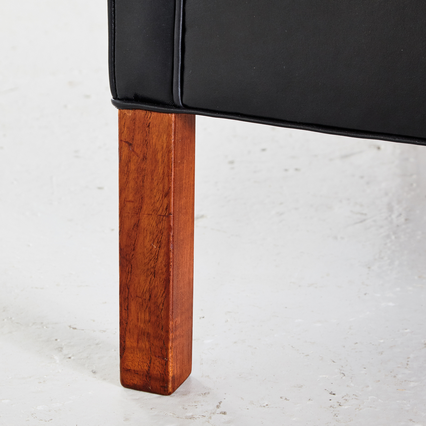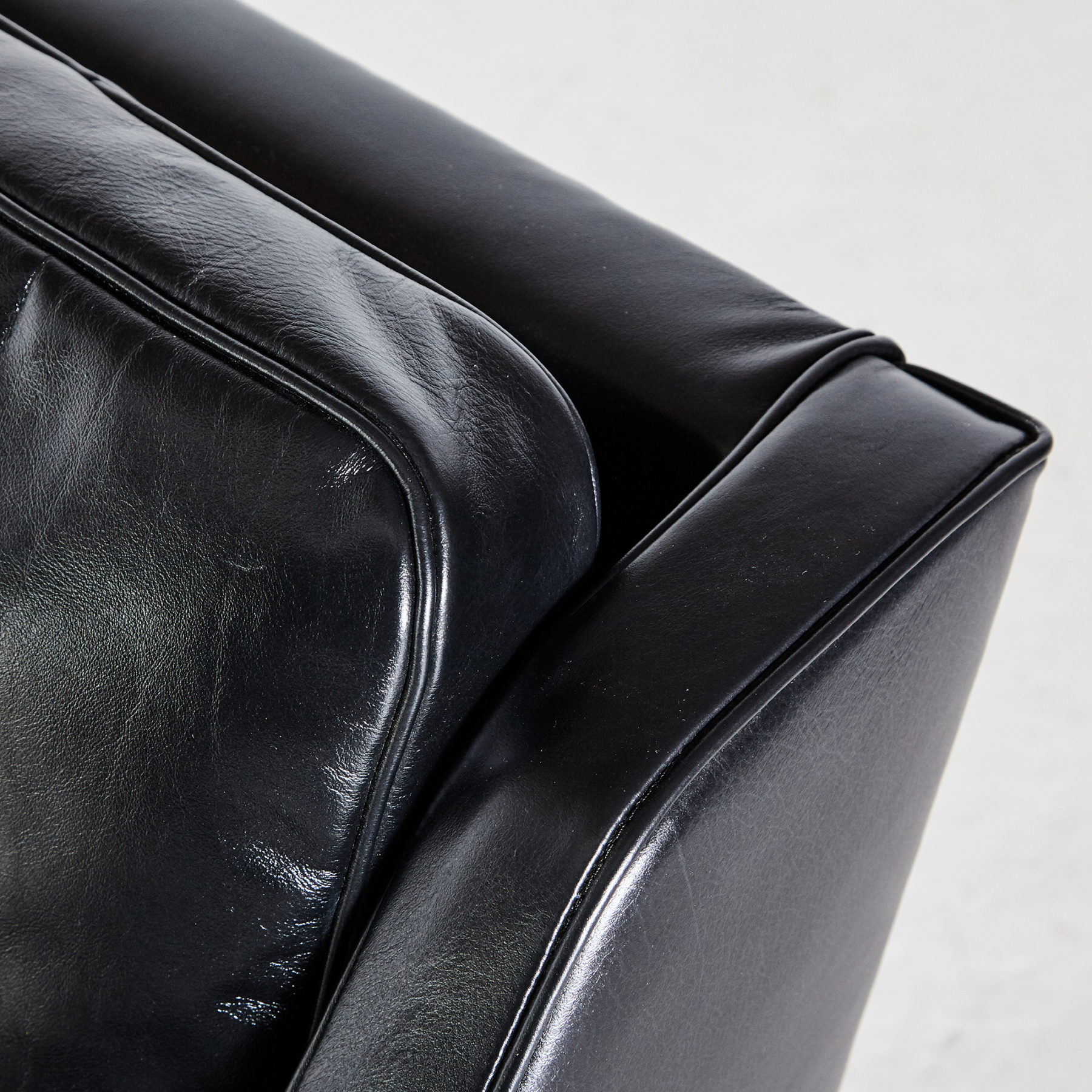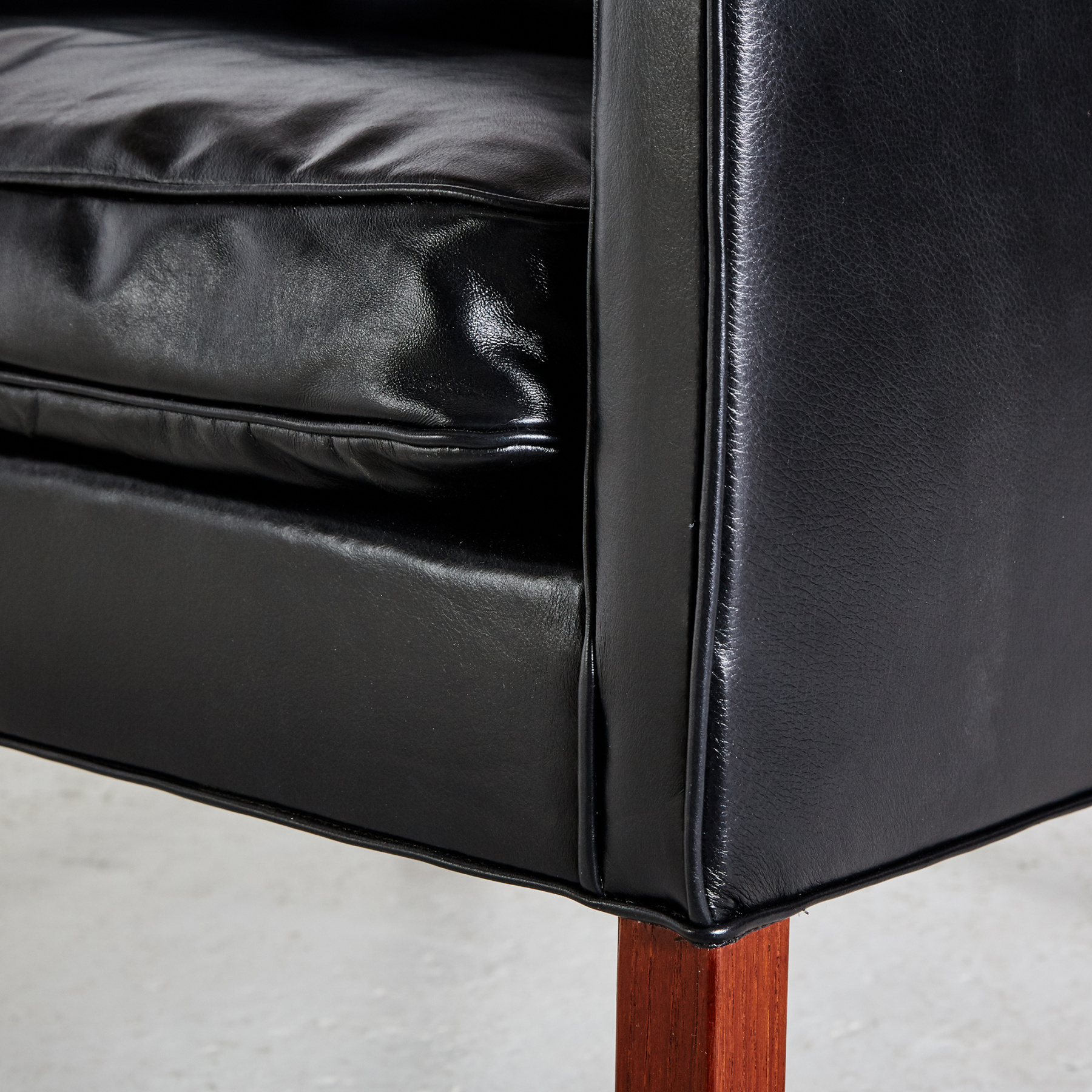 Børge Mogensen által tervezett friss bőr kárpitos háromszemélyes dán fekete bőr kanapé és fotel pár lábtartóval, gyönyörű vonalakkal teak lábazaton. Az egyszerűség és a letisztultság egyik legmeghatározóbb dán darabjai 1962 óta