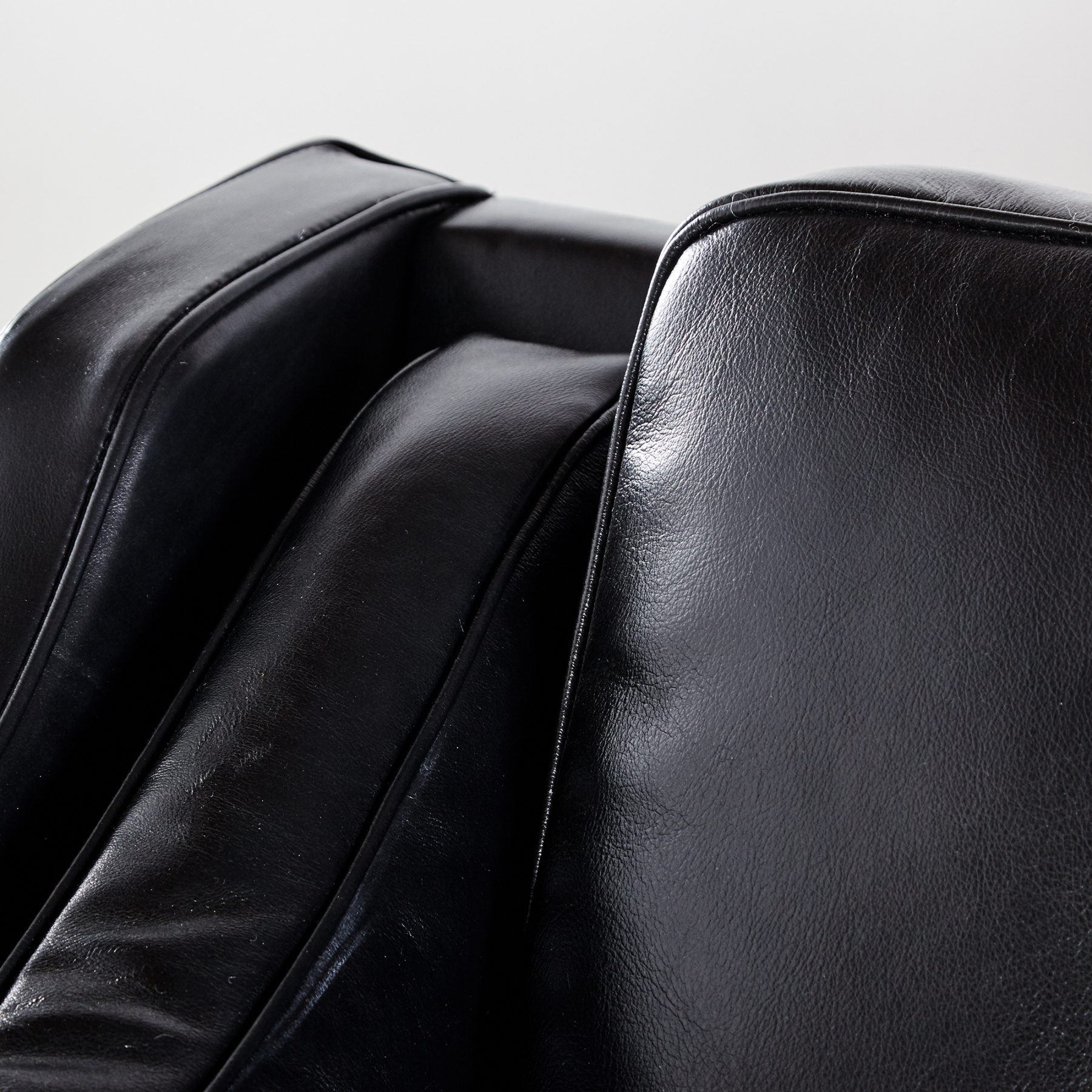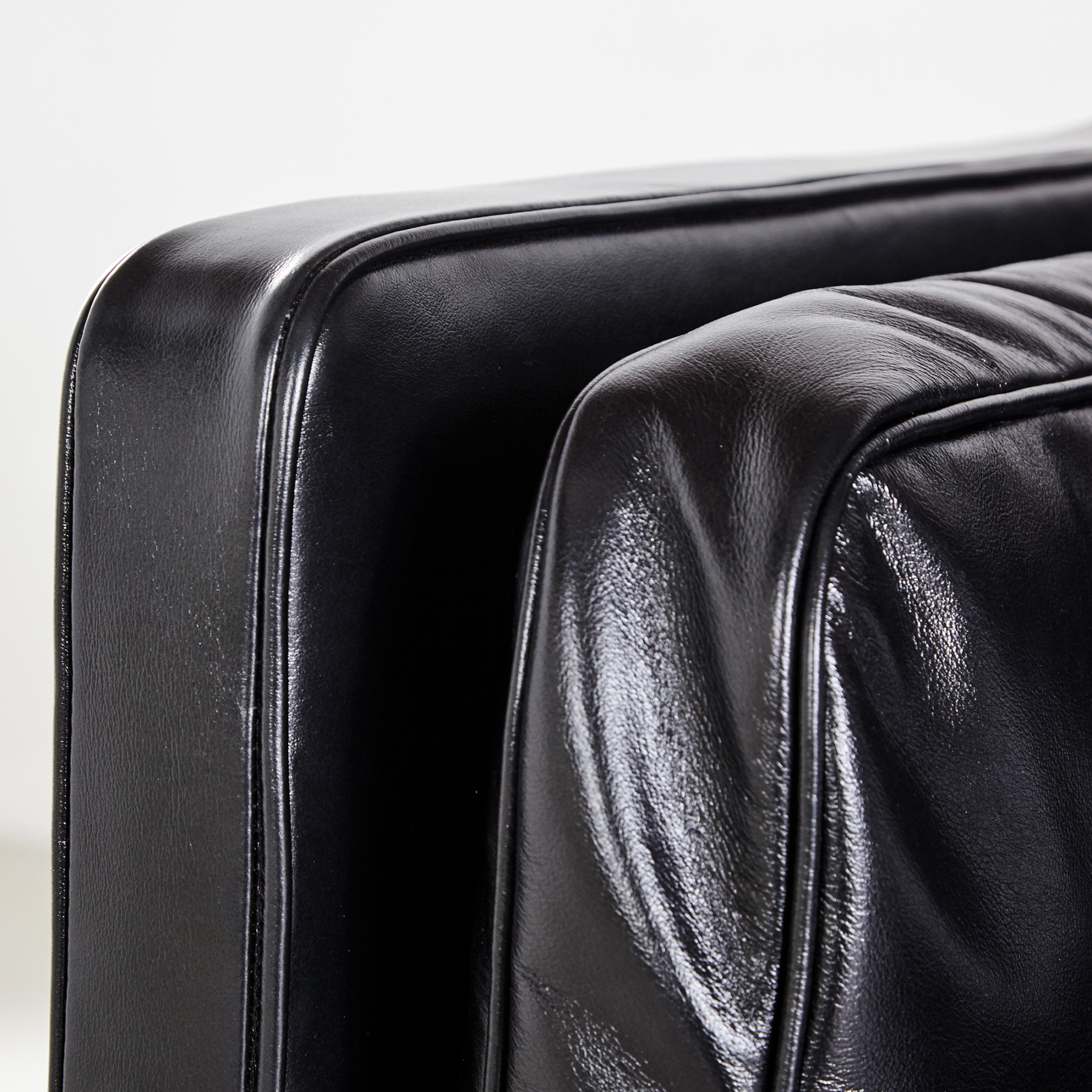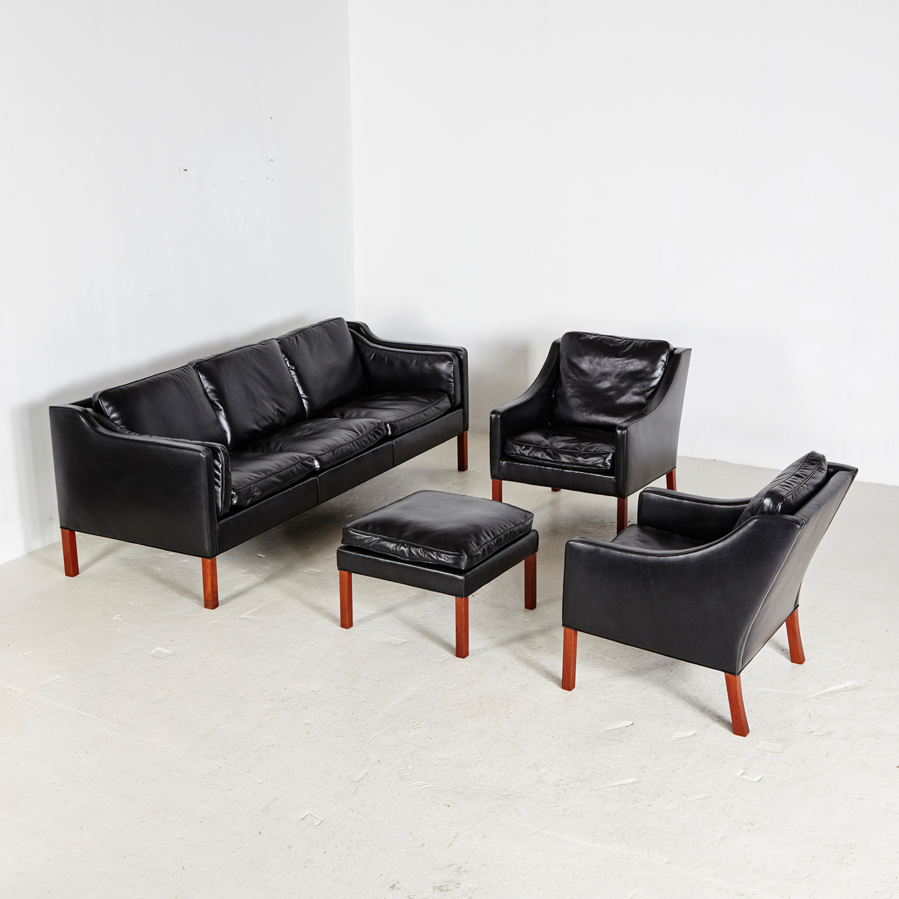 Børge Mogensen által tervezett friss bőr kárpitos háromszemélyes dán fekete bőr kanapé és fotel pár lábtartóval, gyönyörű vonalakkal teak lábazaton. Az egyszerűség és a letisztultság egyik legmeghatározóbb dán darabjai 1962 óta