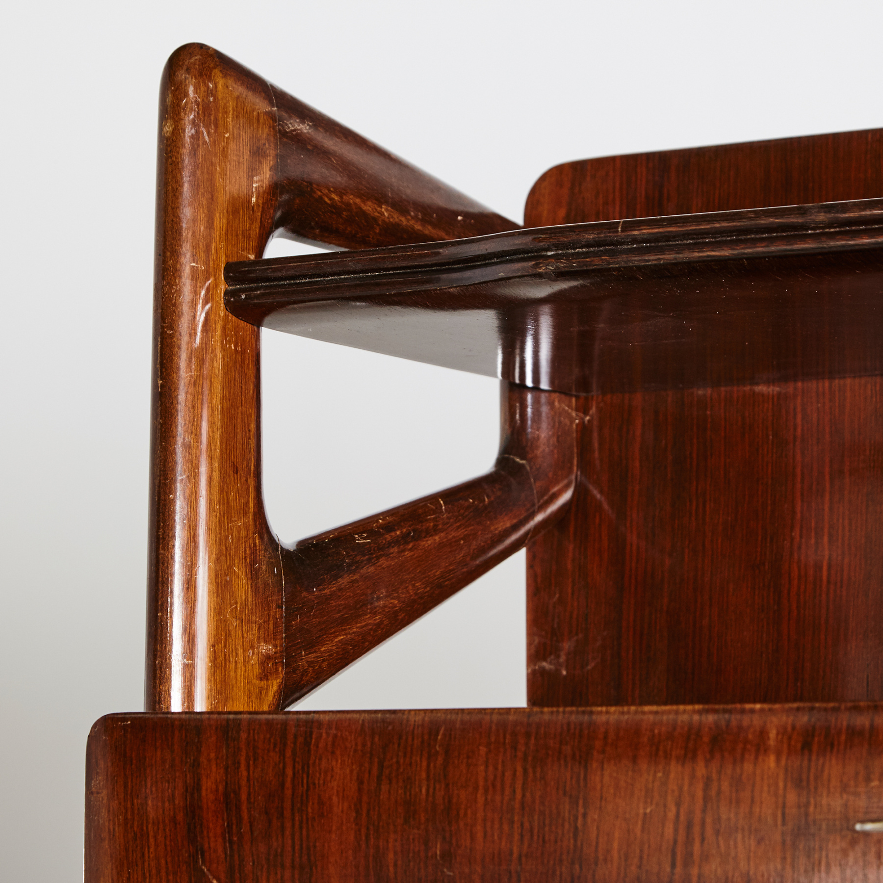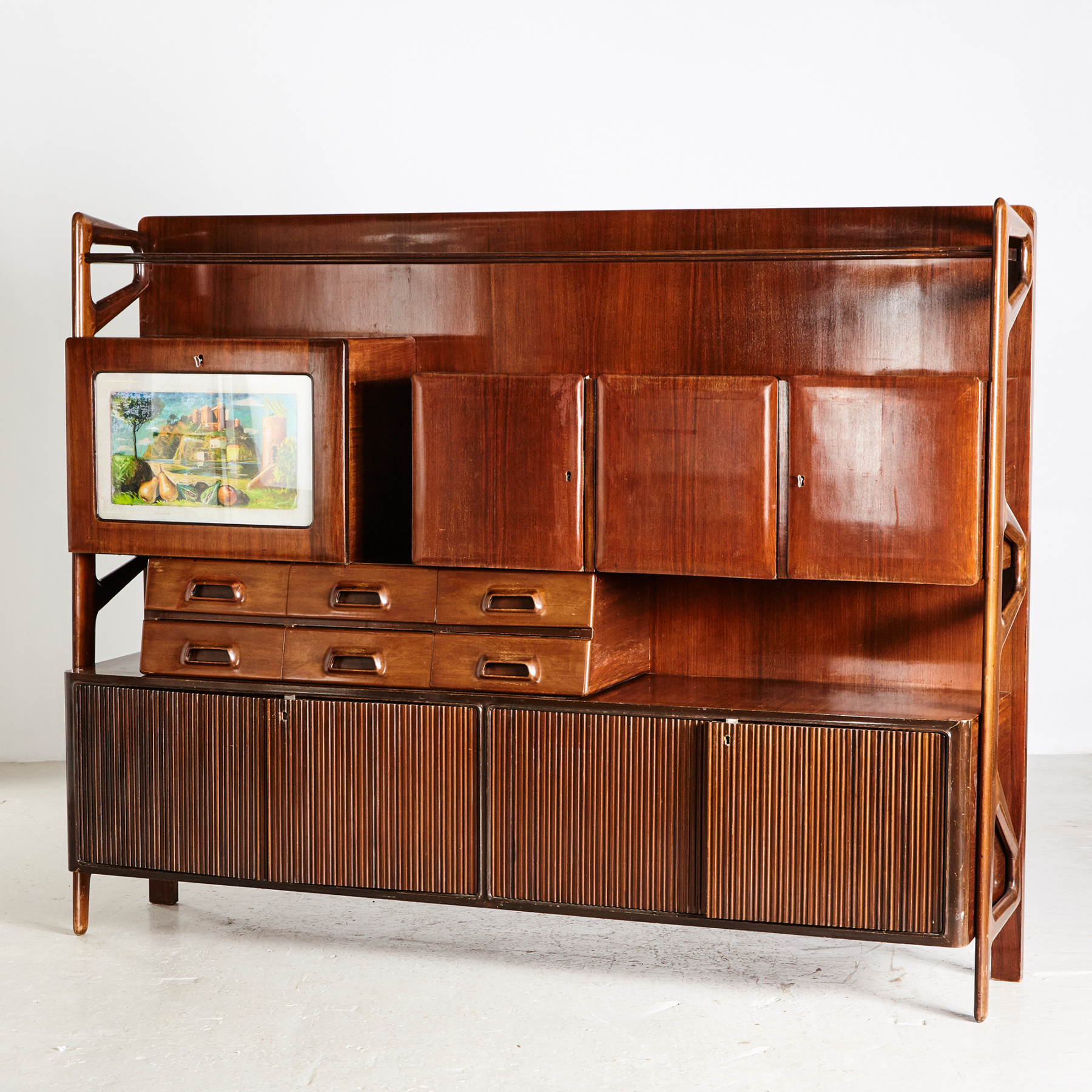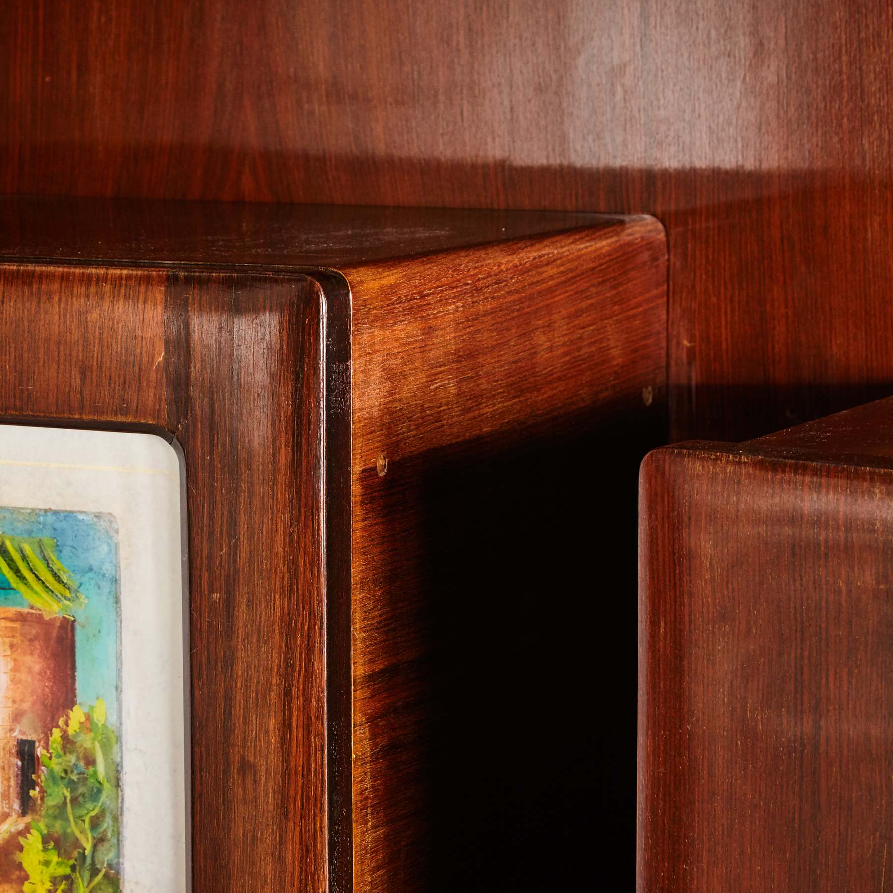Silvio Cavatorta által tervezett szép állapotú magas olasz tálalószekrény. Praktikus tároló rekeszekkel, polcokkal és zárható ajtóval a rózsafa gyönyörű meleg árnyalatával