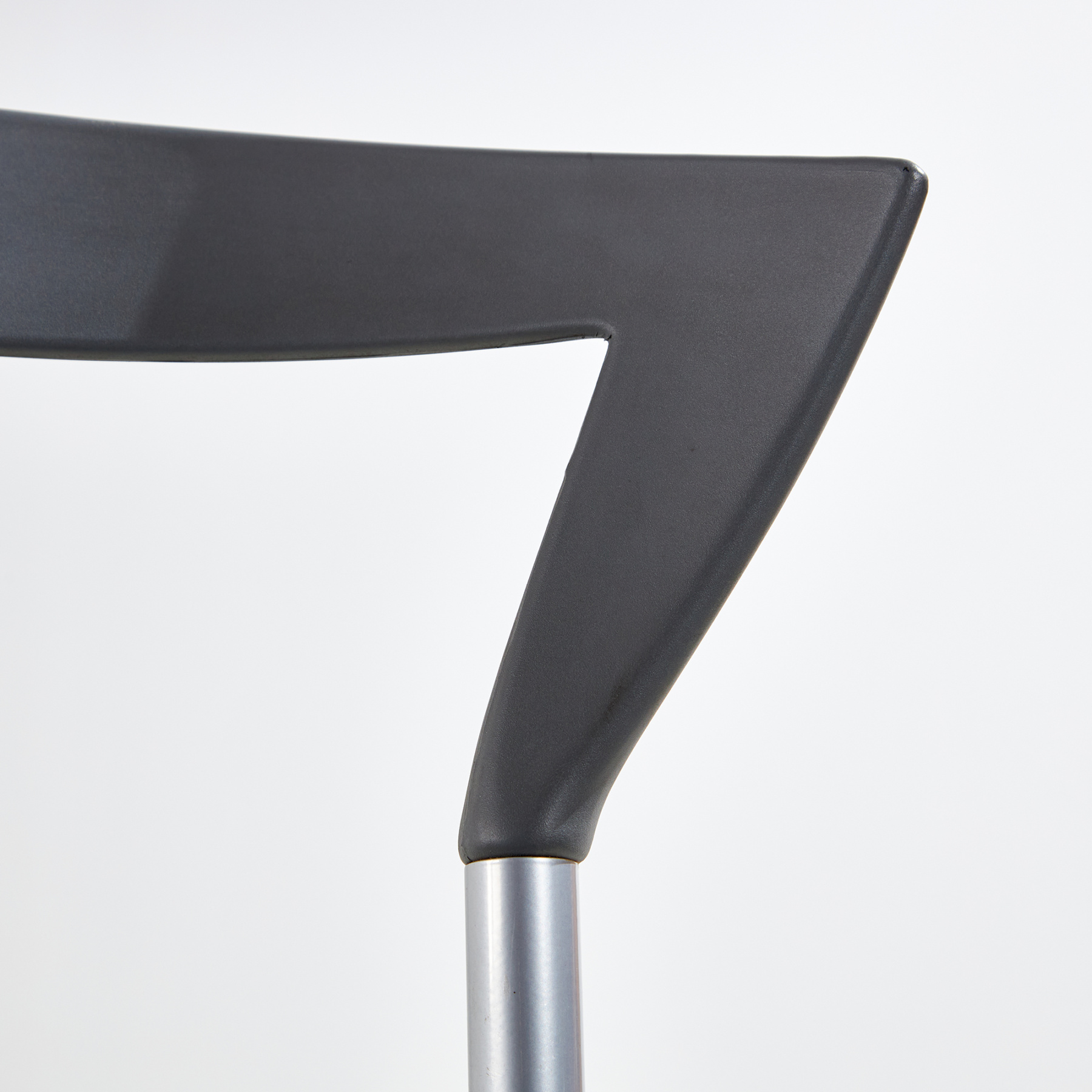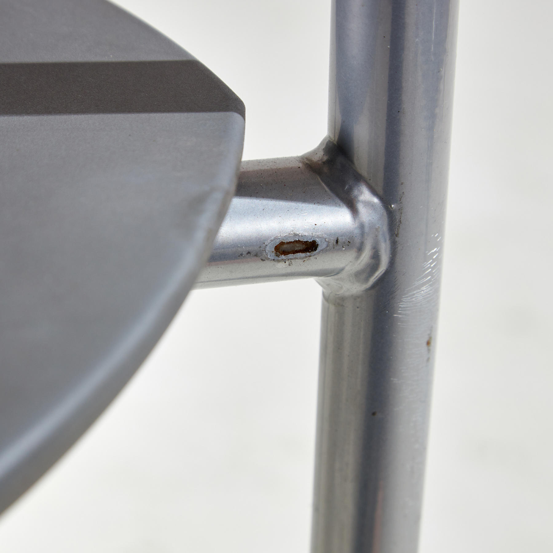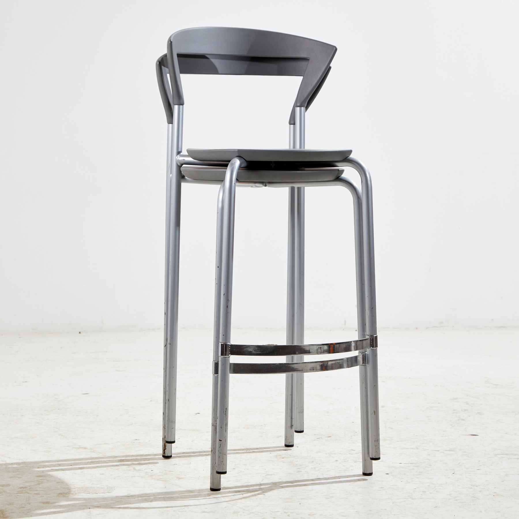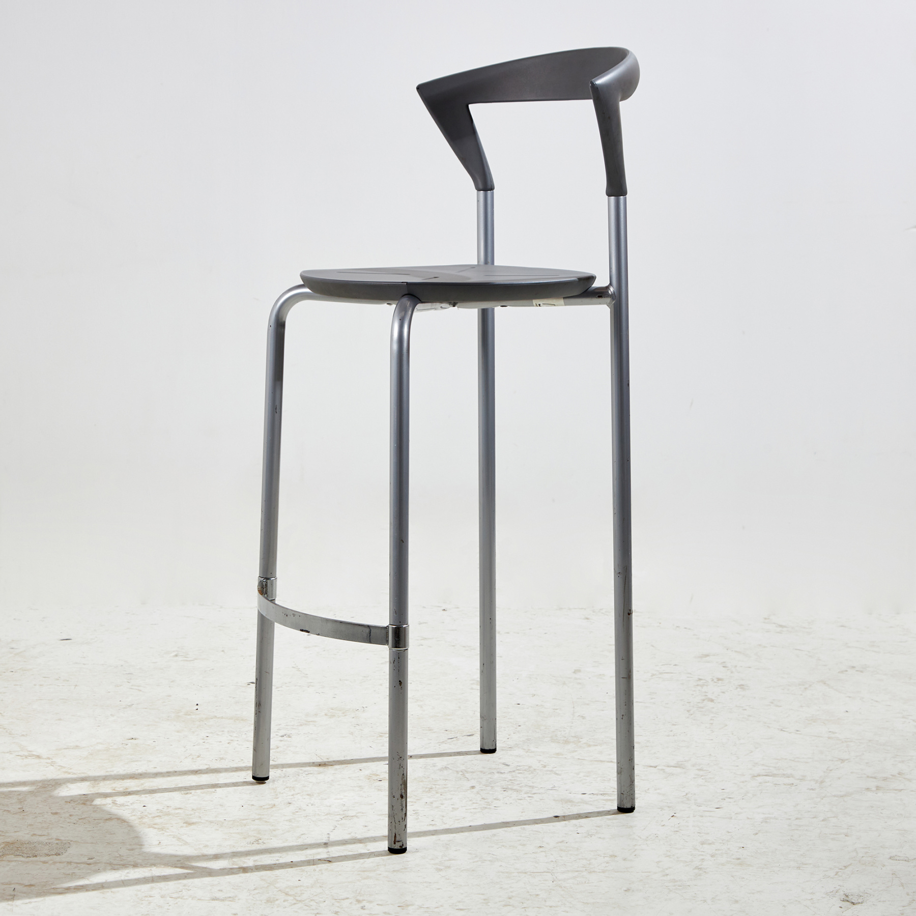 Niels Gammelgaard és Lars Mathiesen, azaz a Pelikan Design által tervezett ‘Opus’ bárszék az 1990-es évekből. Az ülőbútor ülő- és háttámla része gumiból, szerkezete acélból készült. A bárszék felületén helyenként karcokkal, foltokkal és kopásokkal.