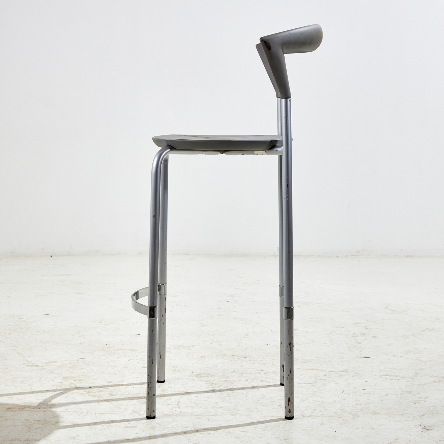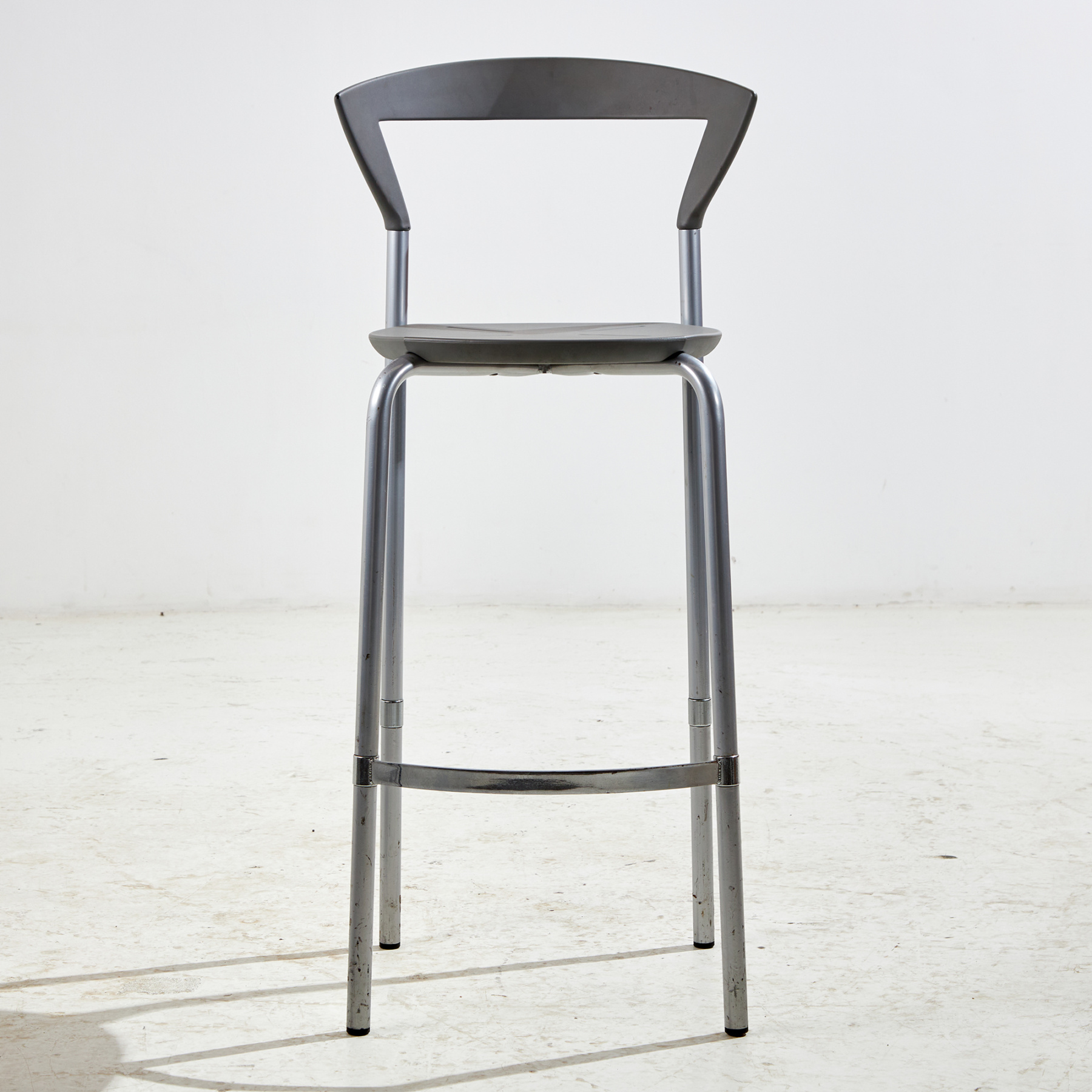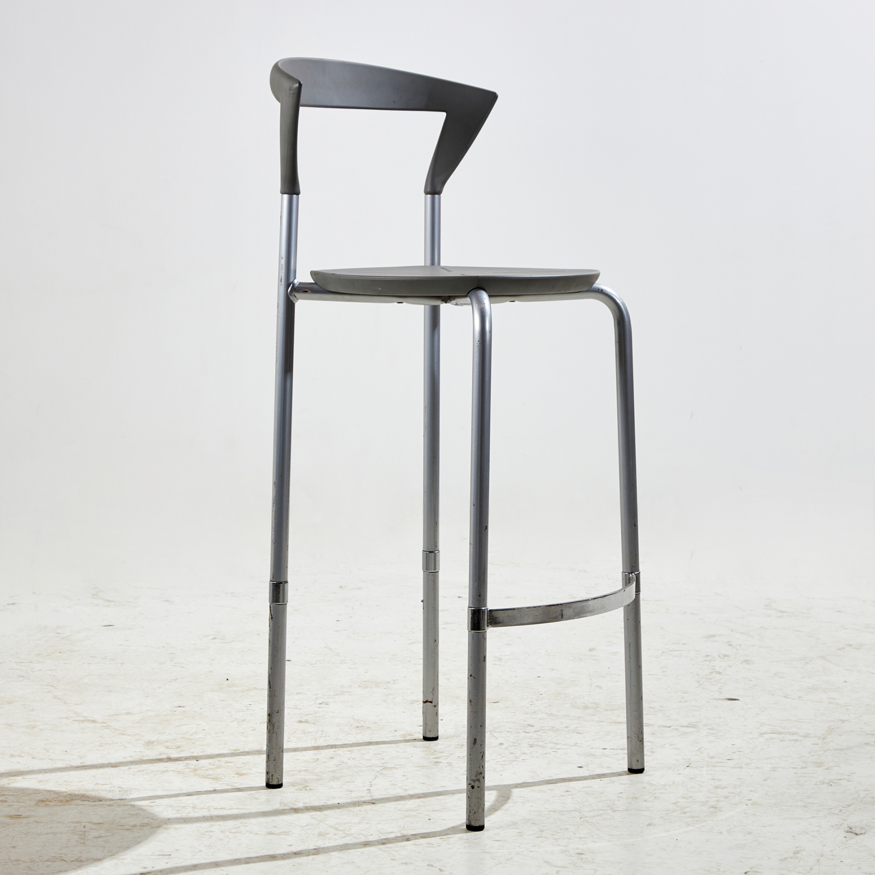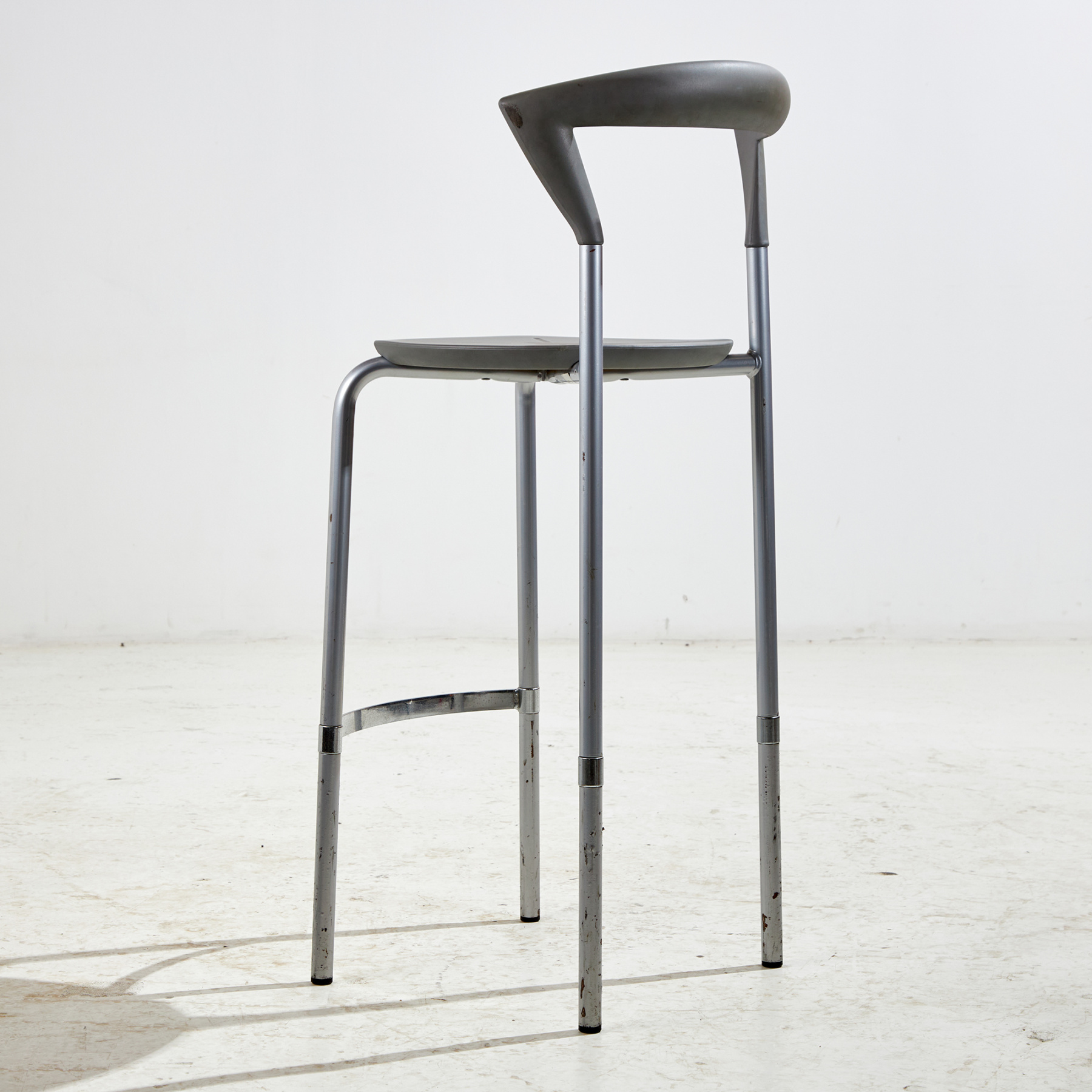 Niels Gammelgaard és Lars Mathiesen, azaz a Pelikan Design által tervezett ‘Opus’ bárszék az 1990-es évekből. Az ülőbútor ülő- és háttámla része gumiból, szerkezete acélból készült. A bárszék felületén helyenként karcokkal, foltokkal és kopásokkal.