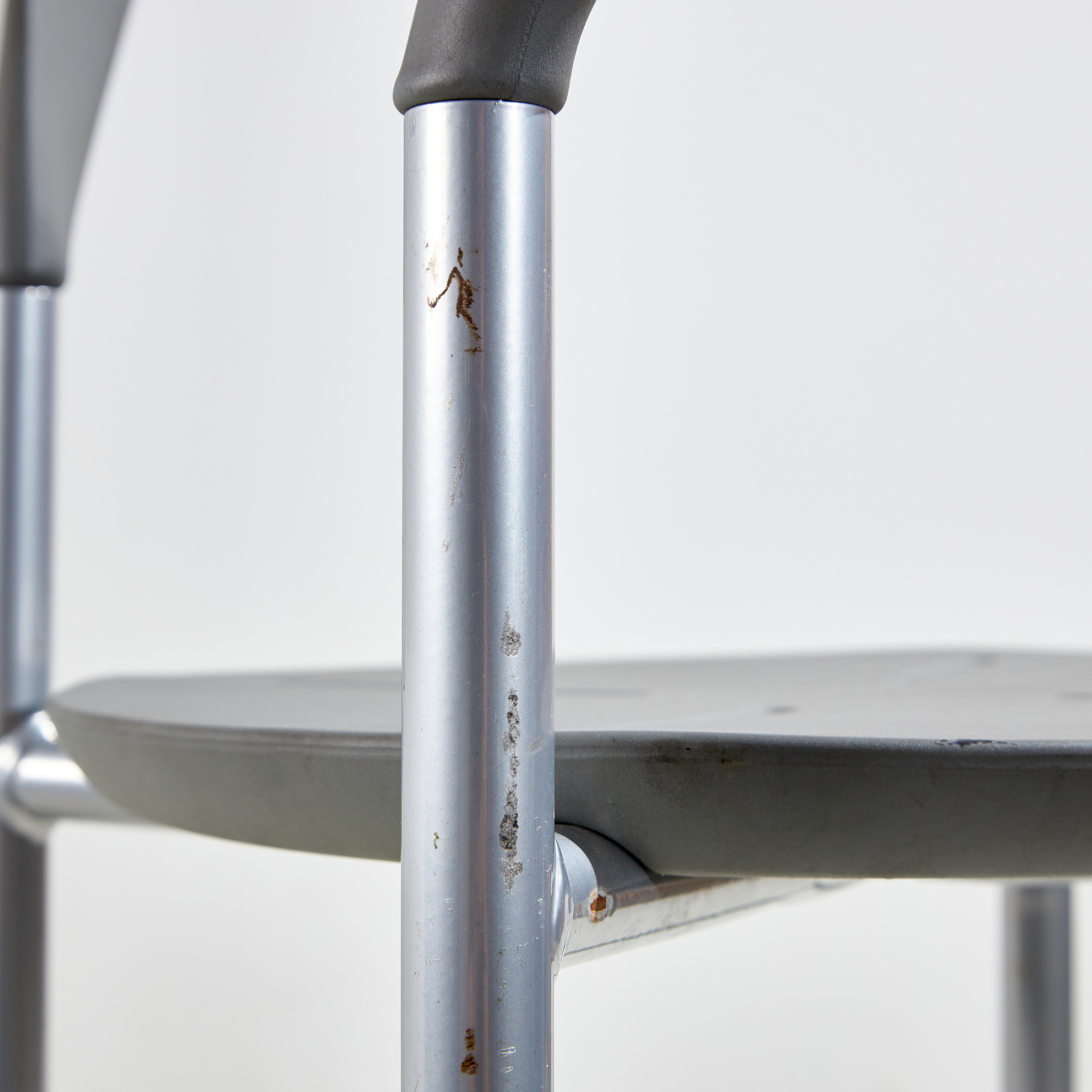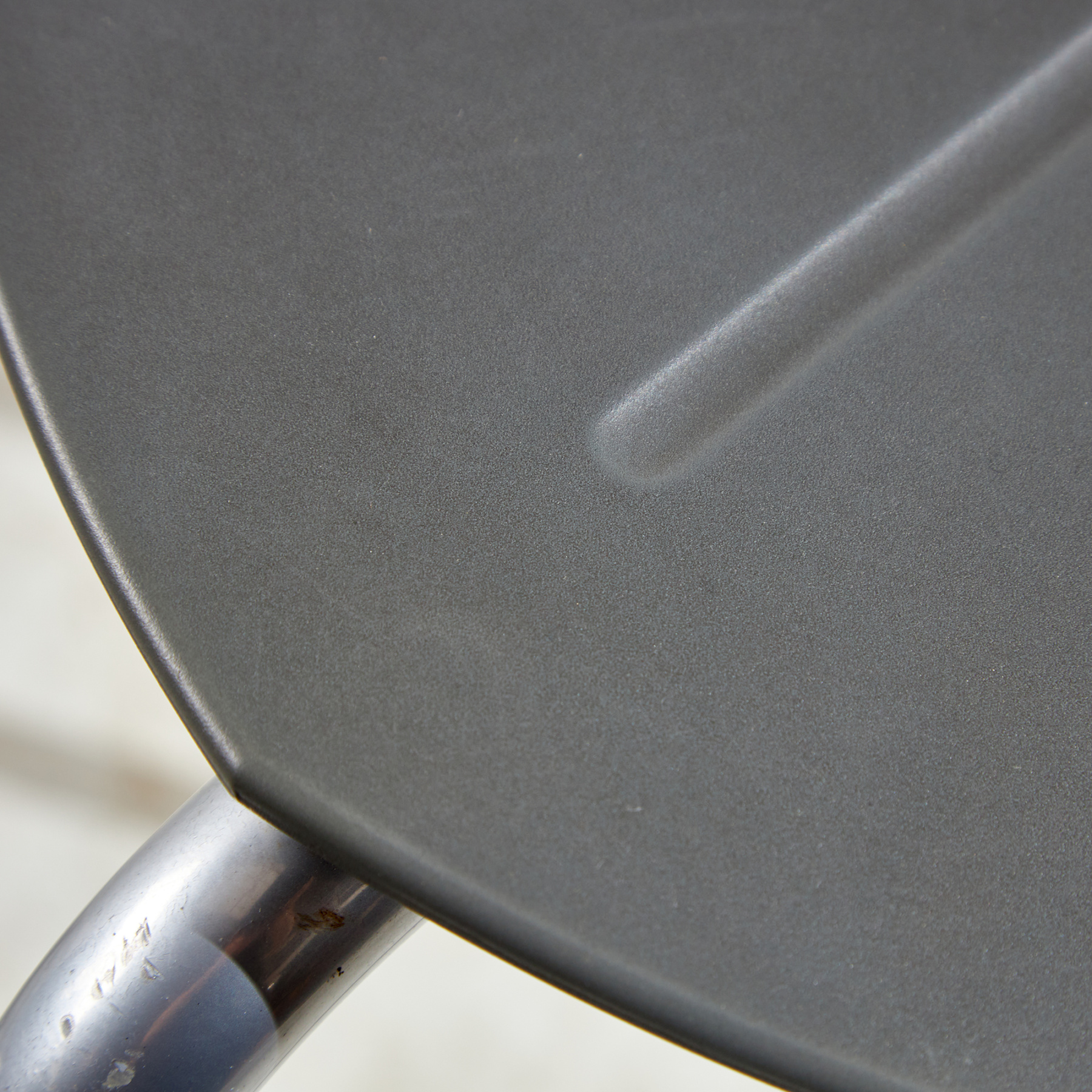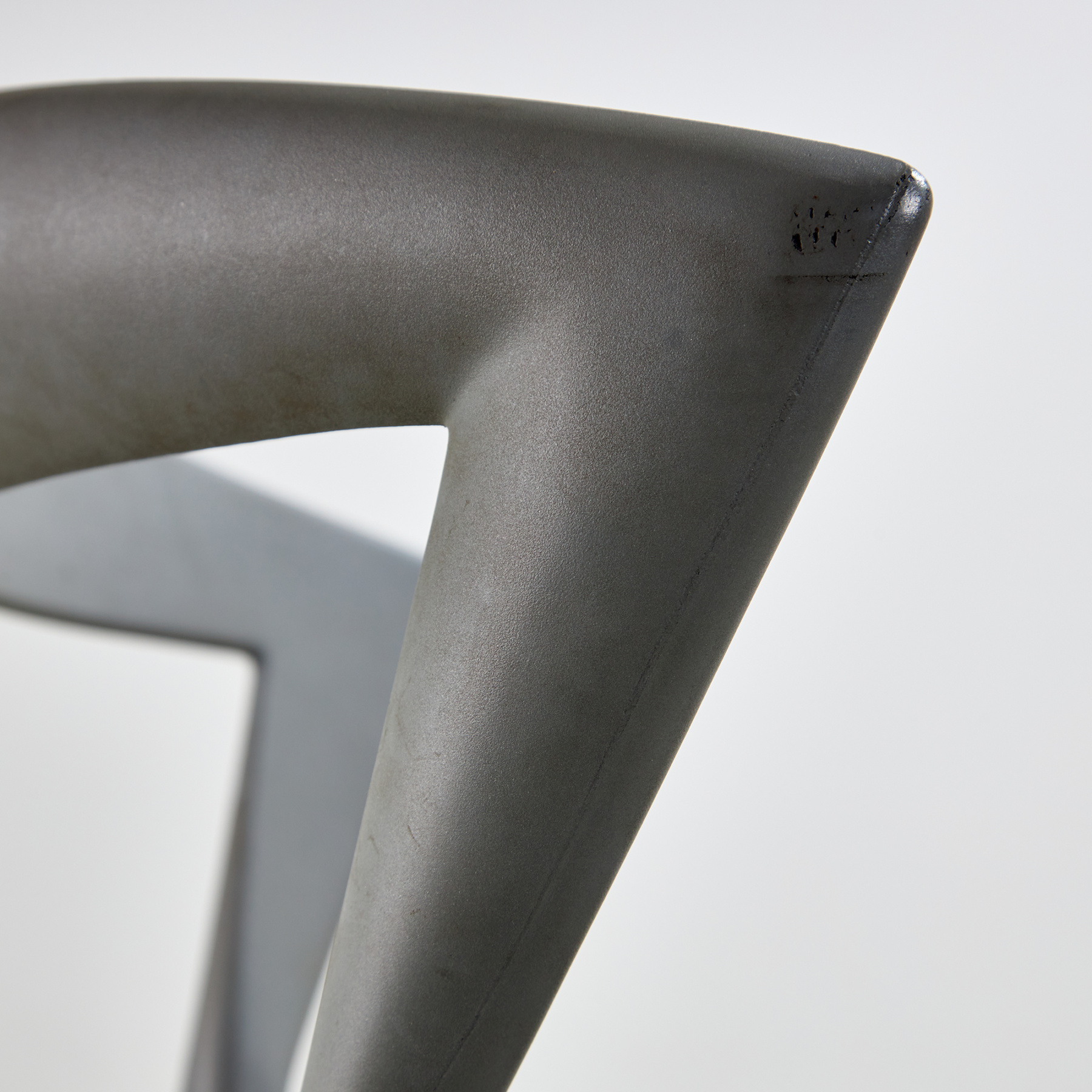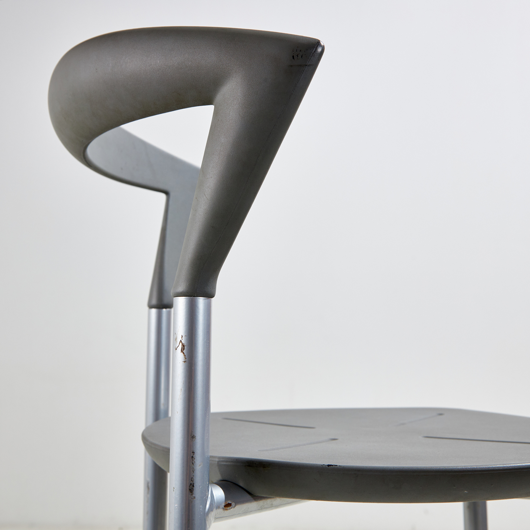 Niels Gammelgaard és Lars Mathiesen, azaz a Pelikan Design által tervezett ‘Opus’ bárszék az 1990-es évekből. Az ülőbútor ülő- és háttámla része gumiból, szerkezete acélból készült. A bárszék felületén helyenként karcokkal, foltokkal és kopásokkal.