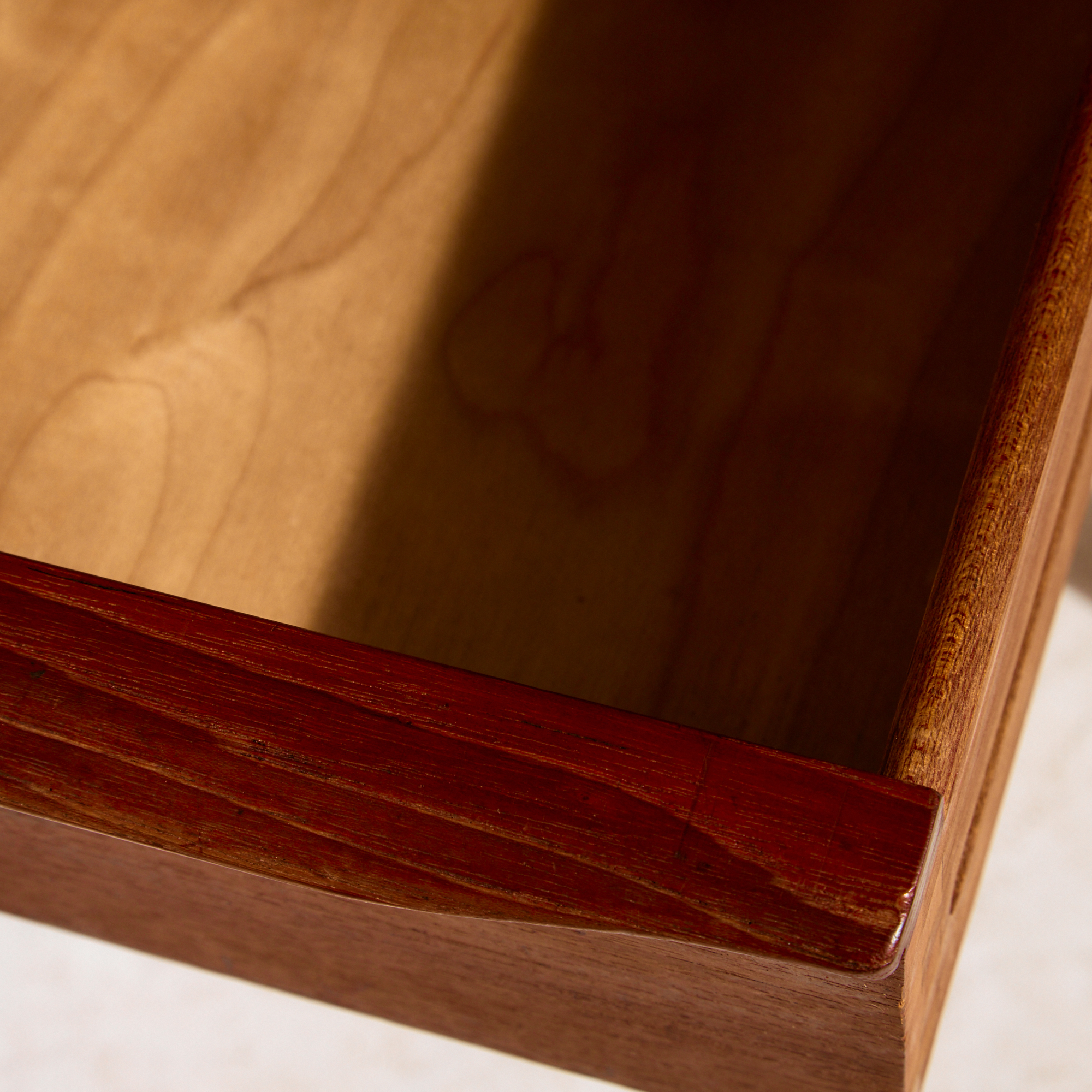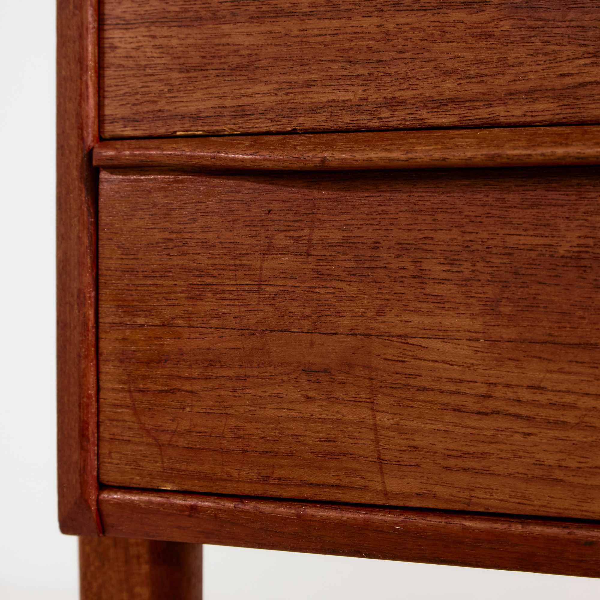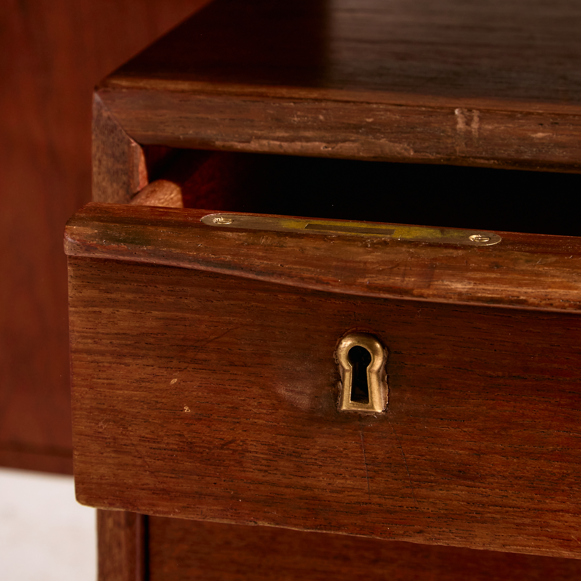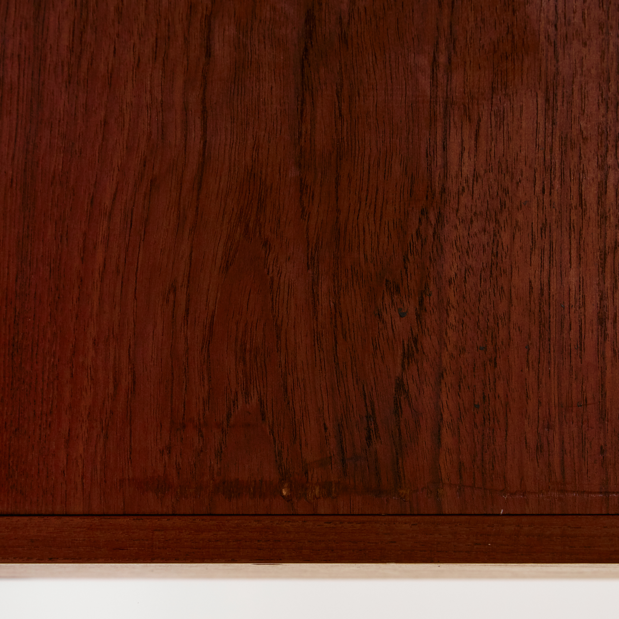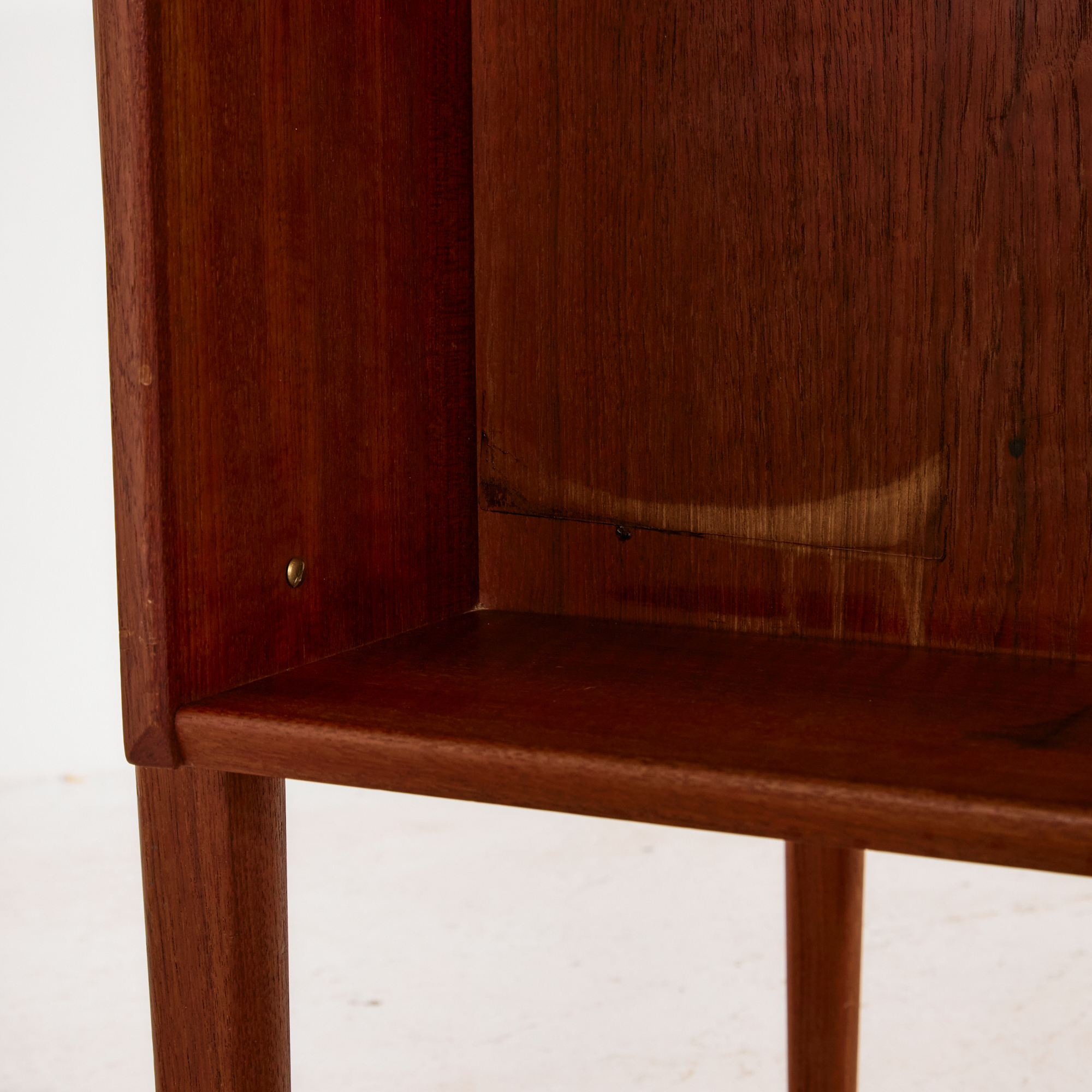 Peter Løvig Nielsen által a Hedensted Møbelfabrik számára tervezett teak íróasztal az 1960-as évekből. Az asztal hat fiókkal, hátán kettő nyitott polccal ellátott. A bútor felületén helyenként karcokkal, foltokkal és kopásokkal.