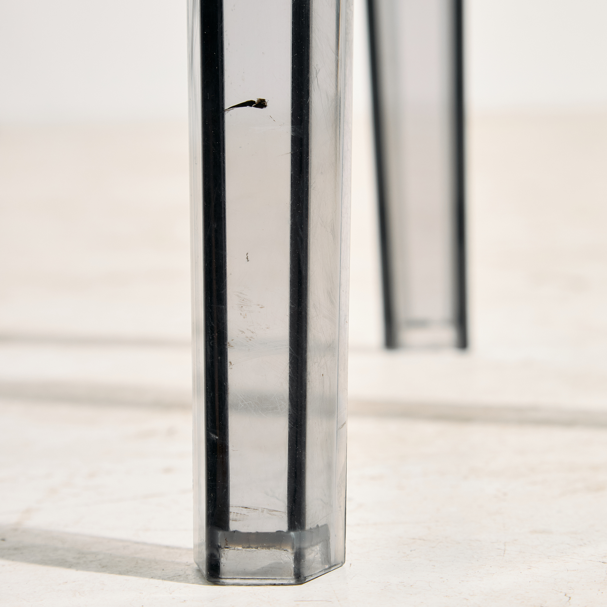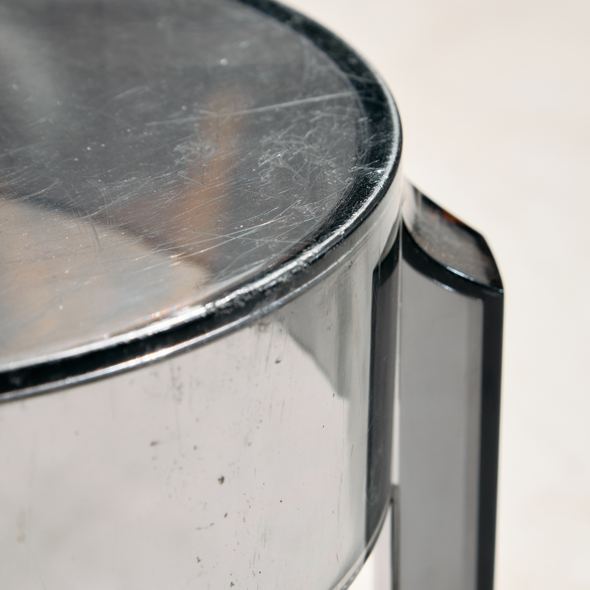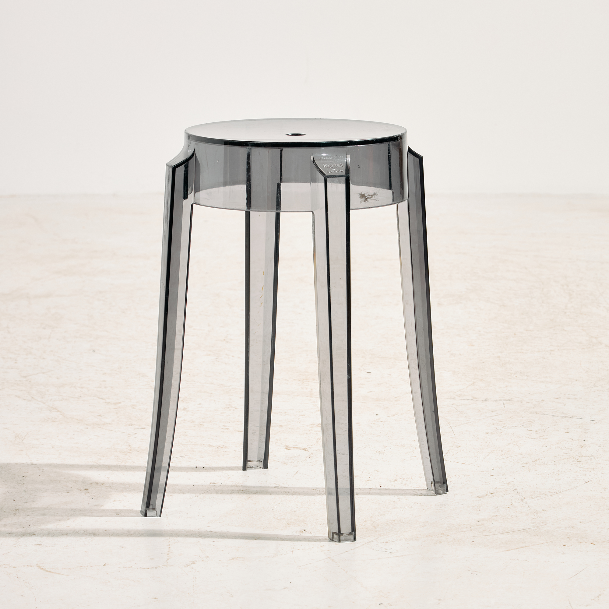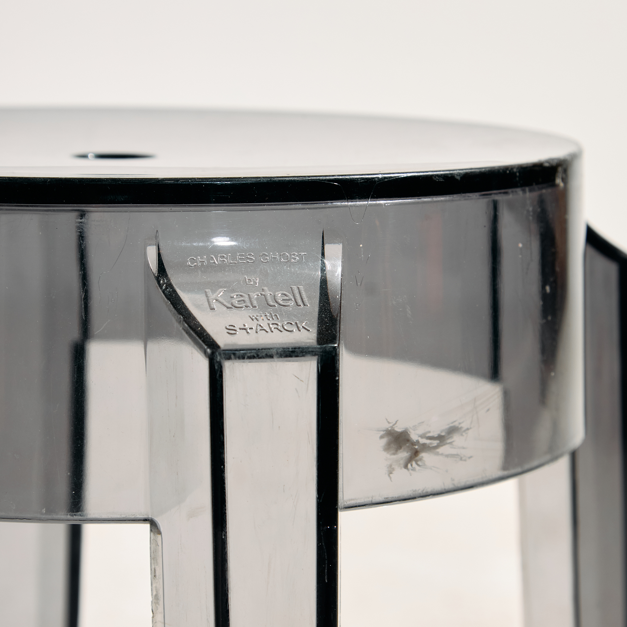 Egy igazi posztmodern darab, ami a funkció, a forma és az anyaghasználat izgalmas találkozásából született. Philippe Starck által a Kartell számára tervezett ‘Charles Ghost’ ülőke a 2000-es évekből. A szék felületén helyenként karcokkal, foltokkal és kopásokkal.