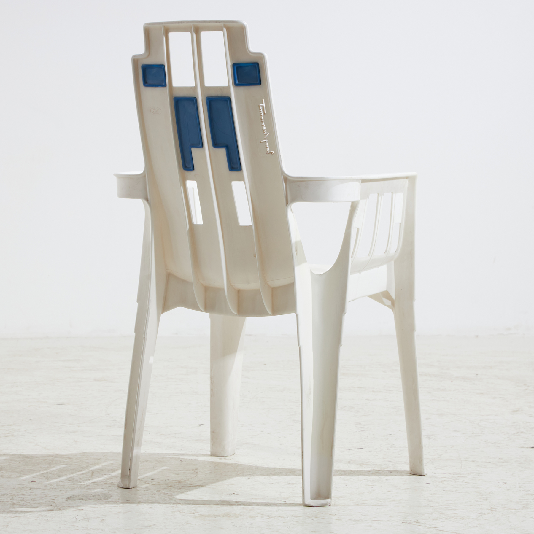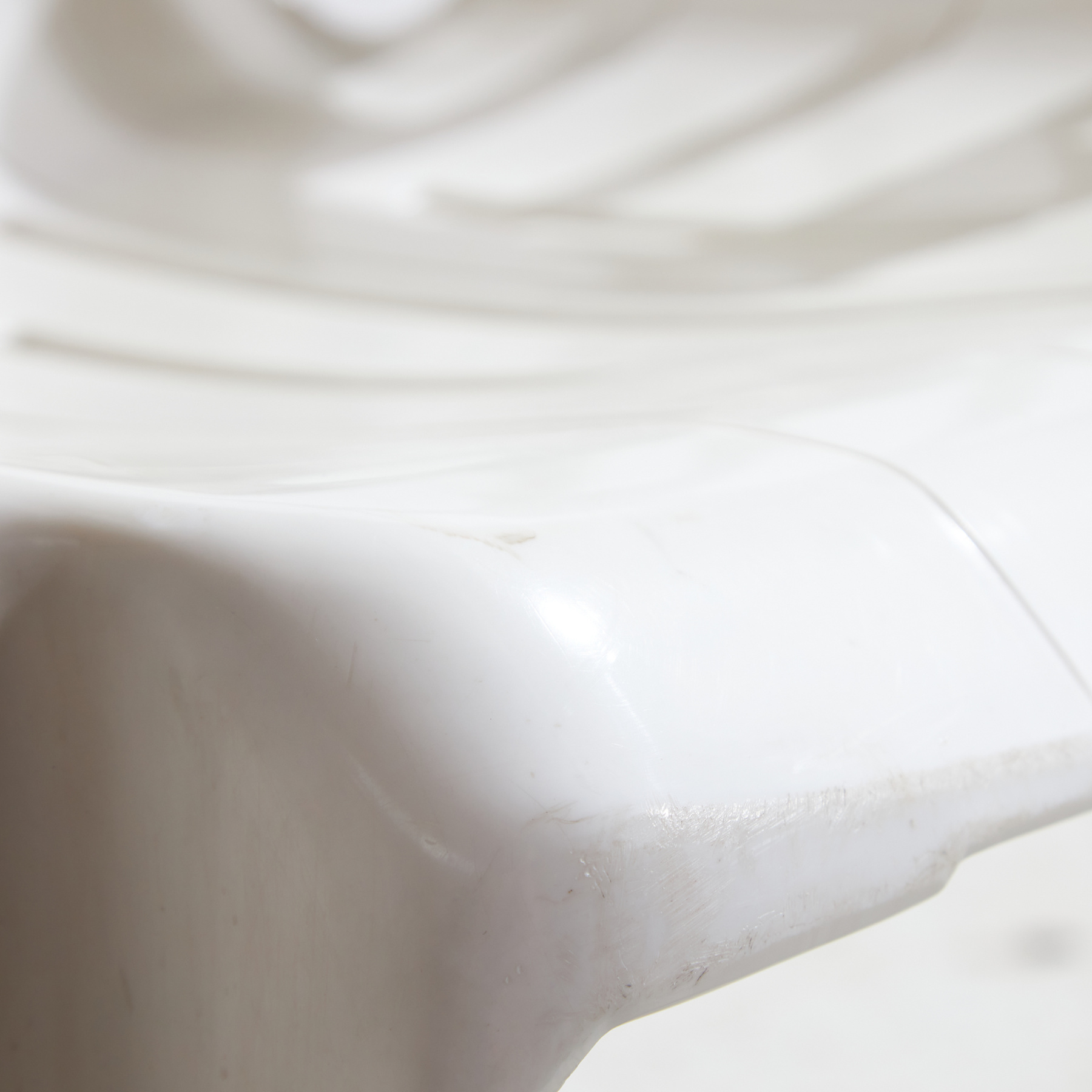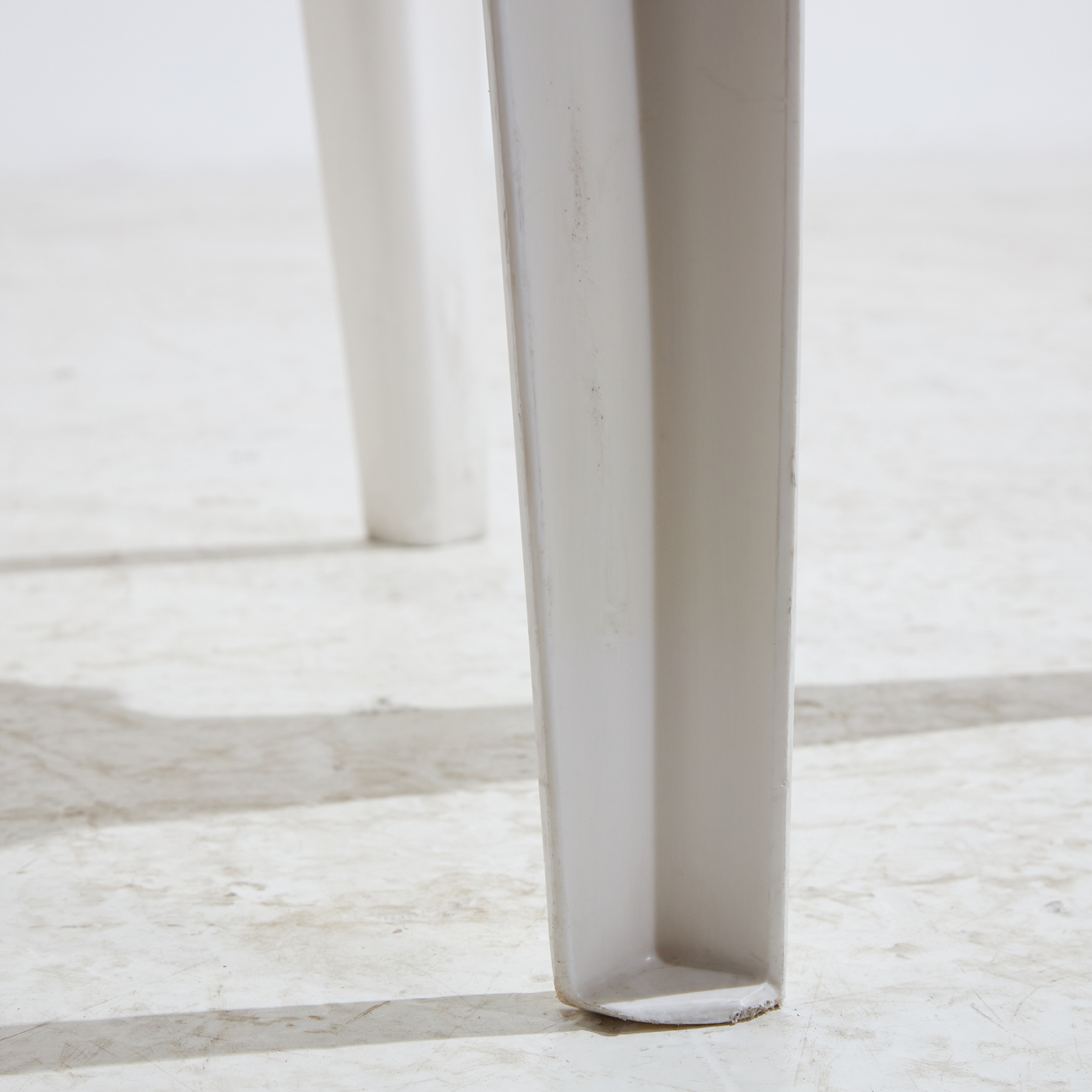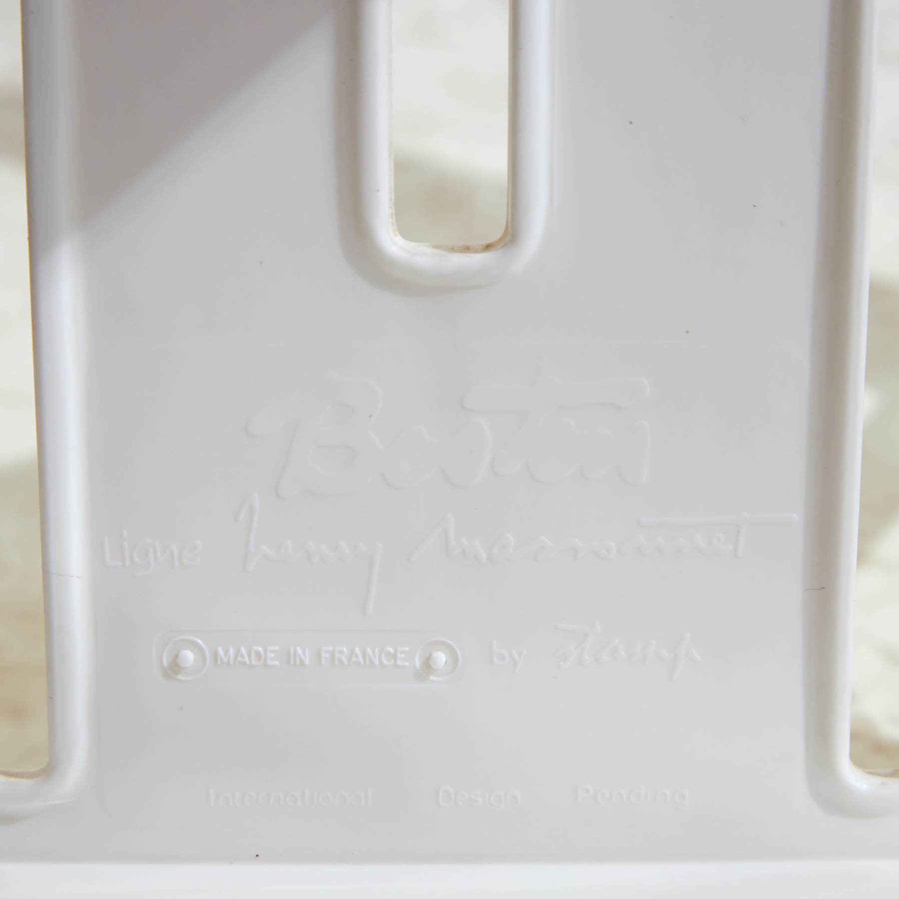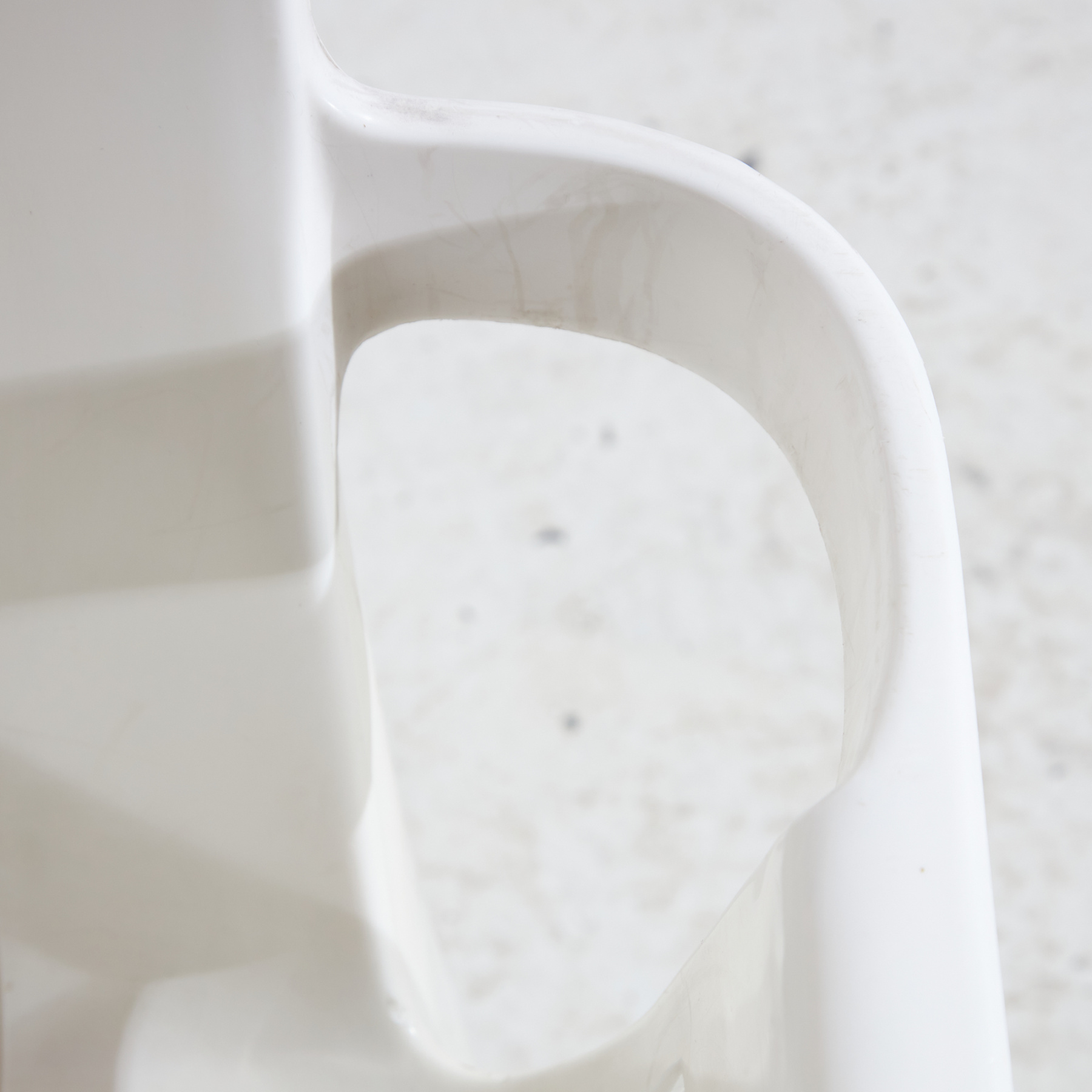 Pierre Paulin által a Henry Massonnet számára tervezett ‘Boston’ karosszék az 1980-as évekből. Az ülőbútor rakásolható, műanyag szerkezetén helyenként felületi karcok, foltok és kopások találhatóak. Kiválóan passzol teraszokra és belső terekbe is egyedi formájának köszönhetően.