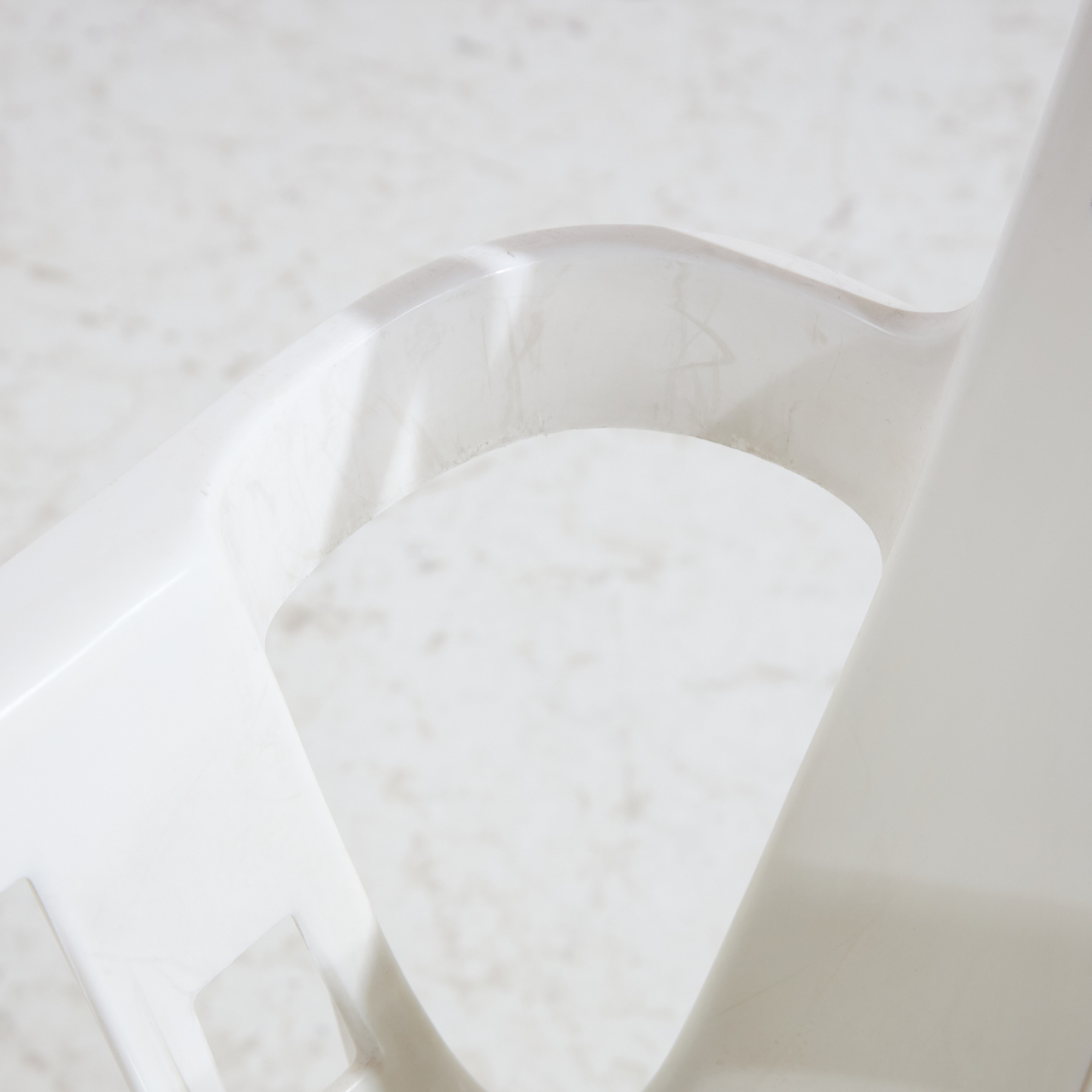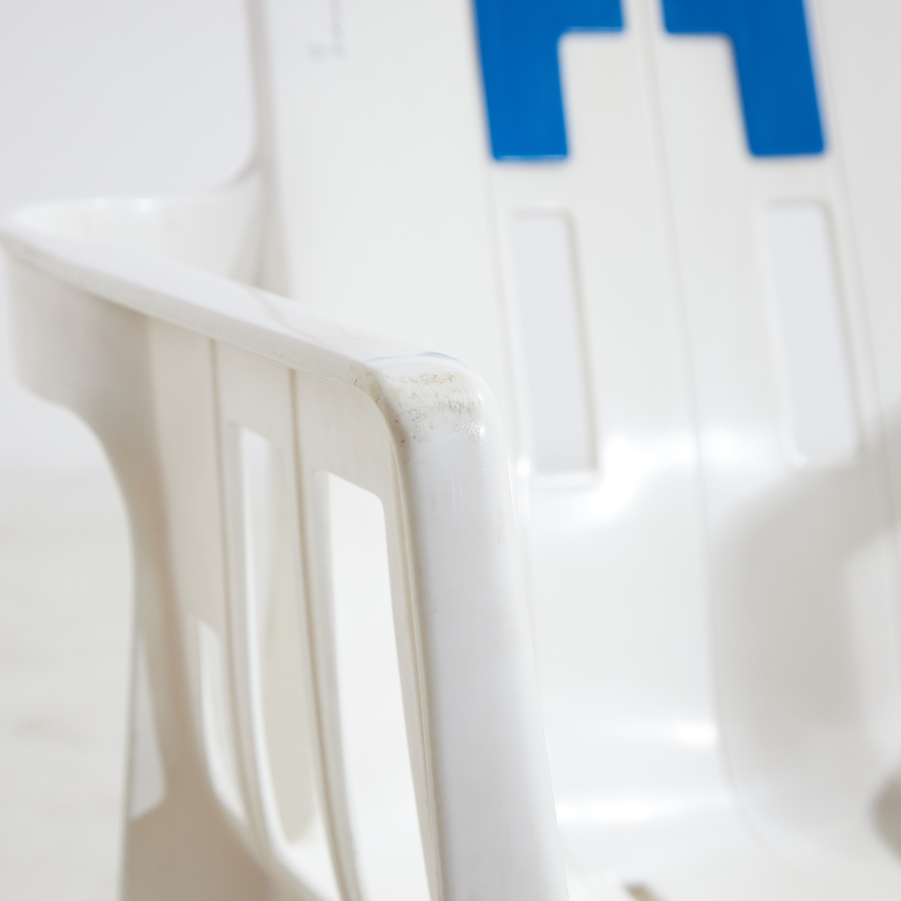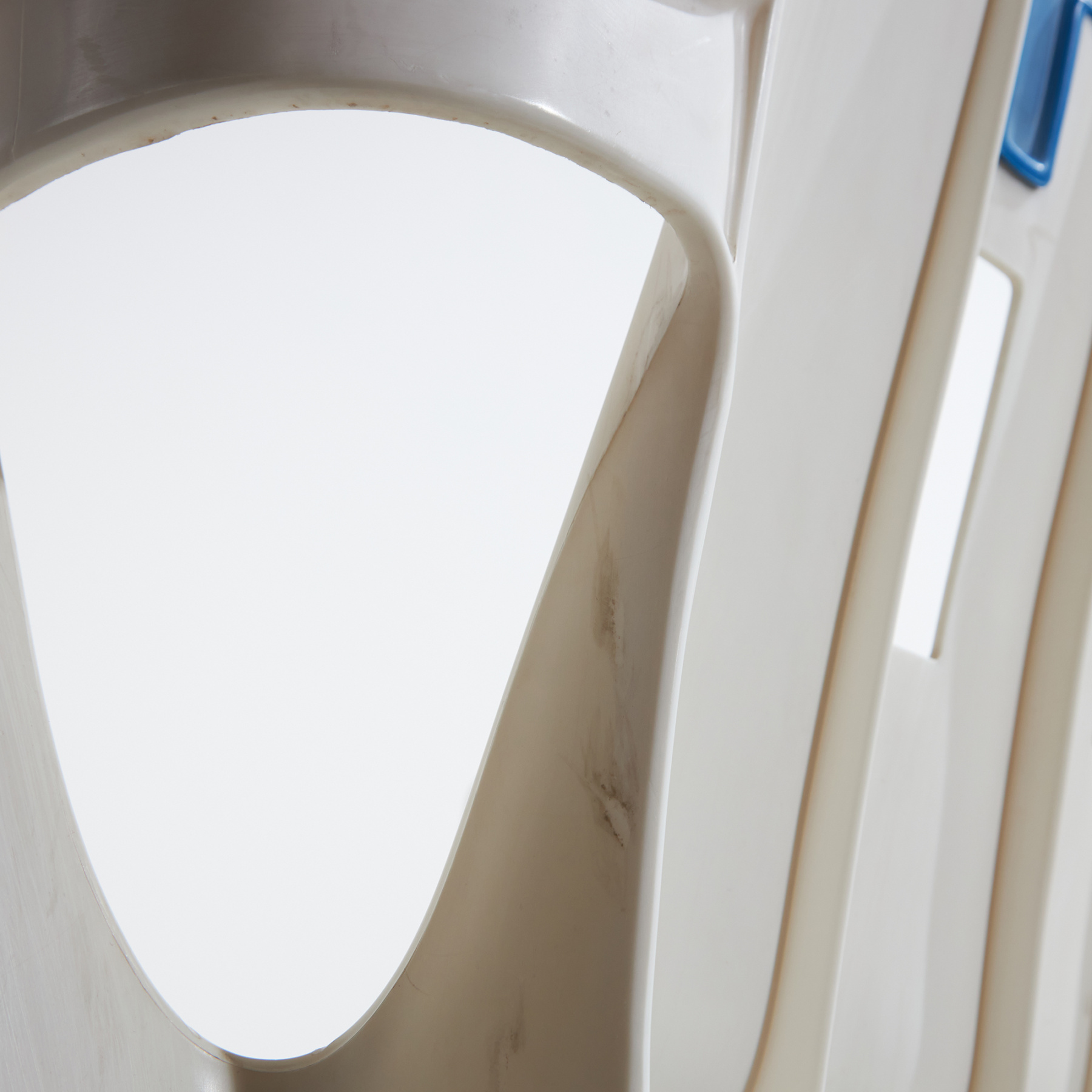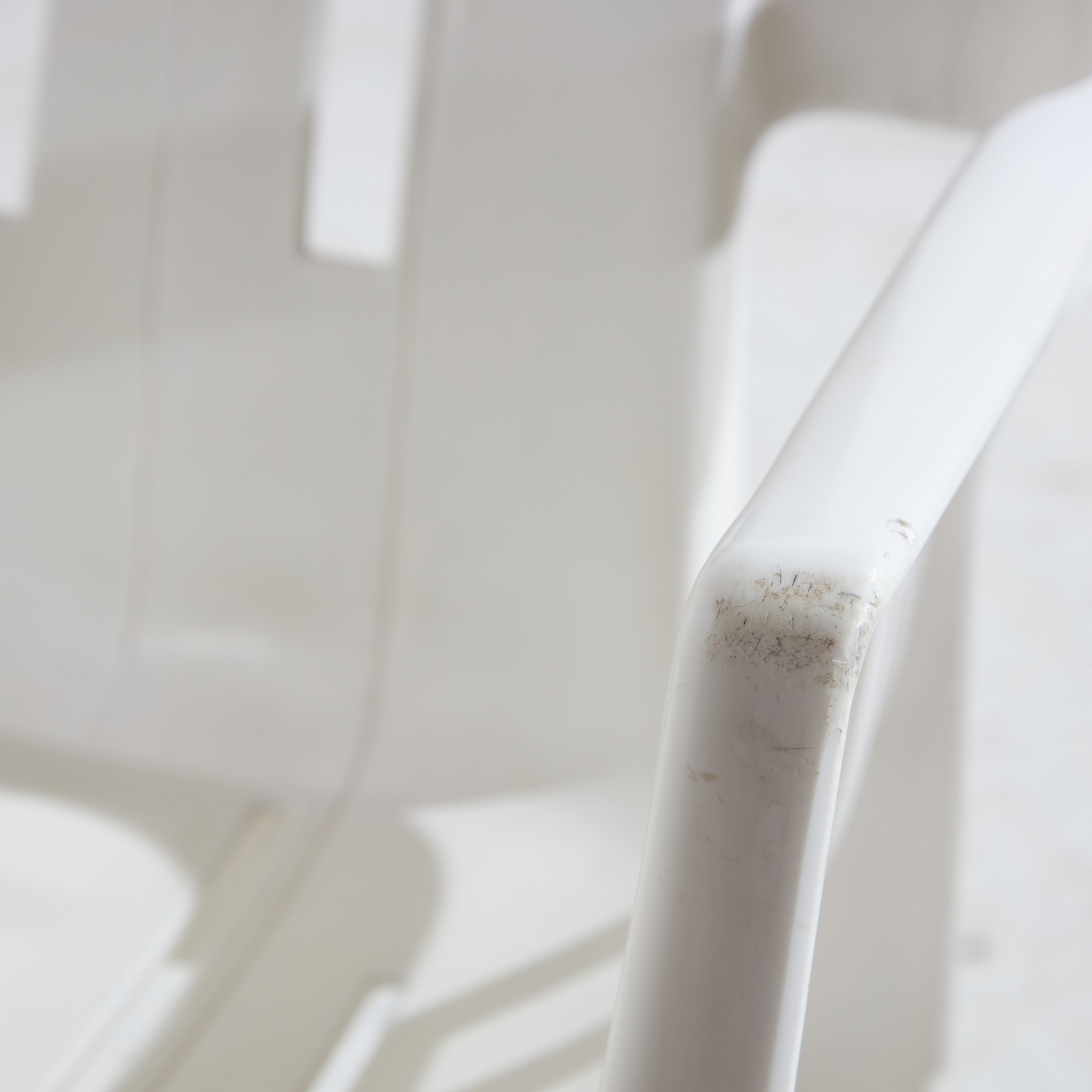 Pierre Paulin által a Henry Massonnet számára tervezett ‘Boston’ karosszék az 1980-as évekből. Az ülőbútor rakásolható, műanyag szerkezetén helyenként felületi karcok, foltok és kopások találhatóak. Kiválóan passzol teraszokra és belső terekbe is egyedi formájának köszönhetően.