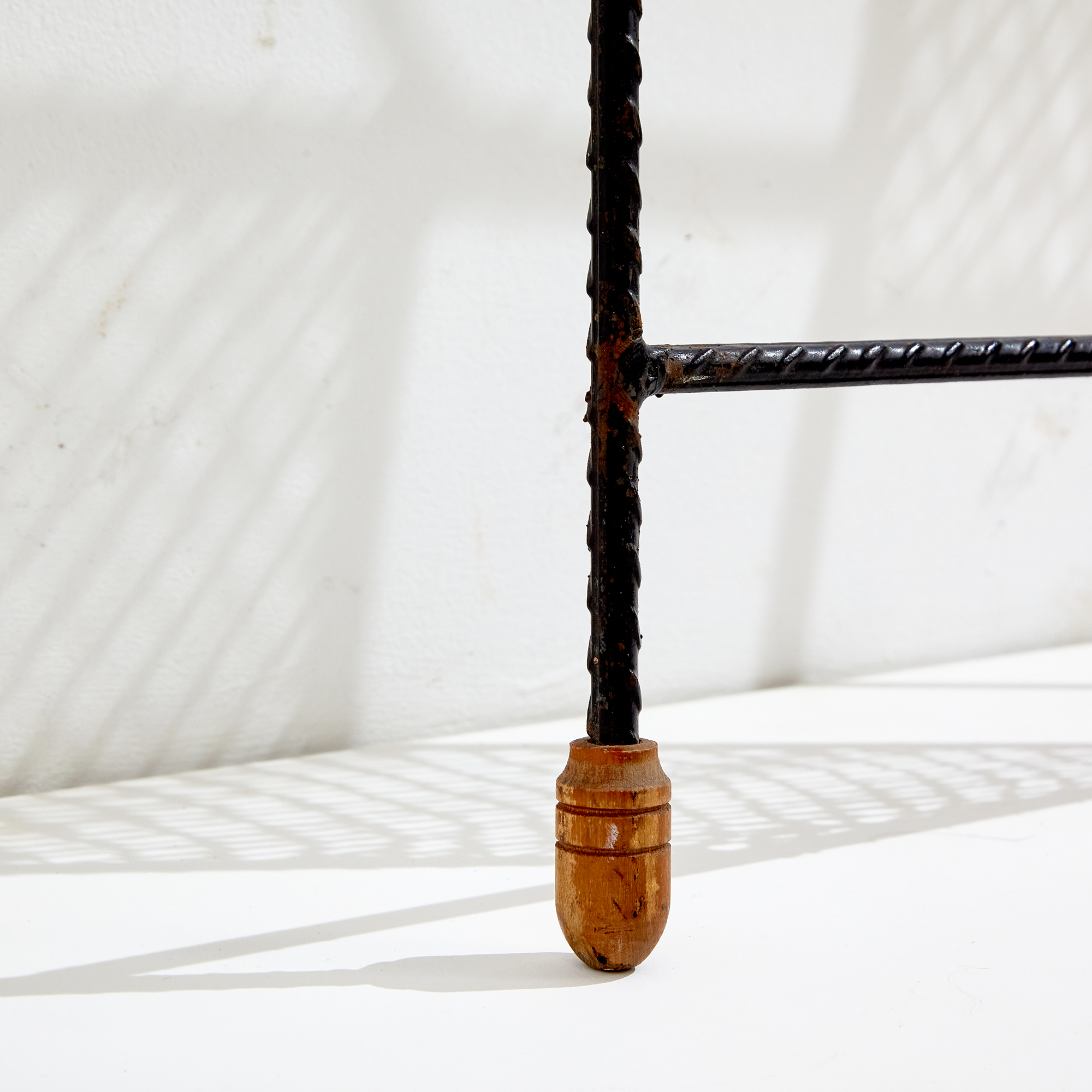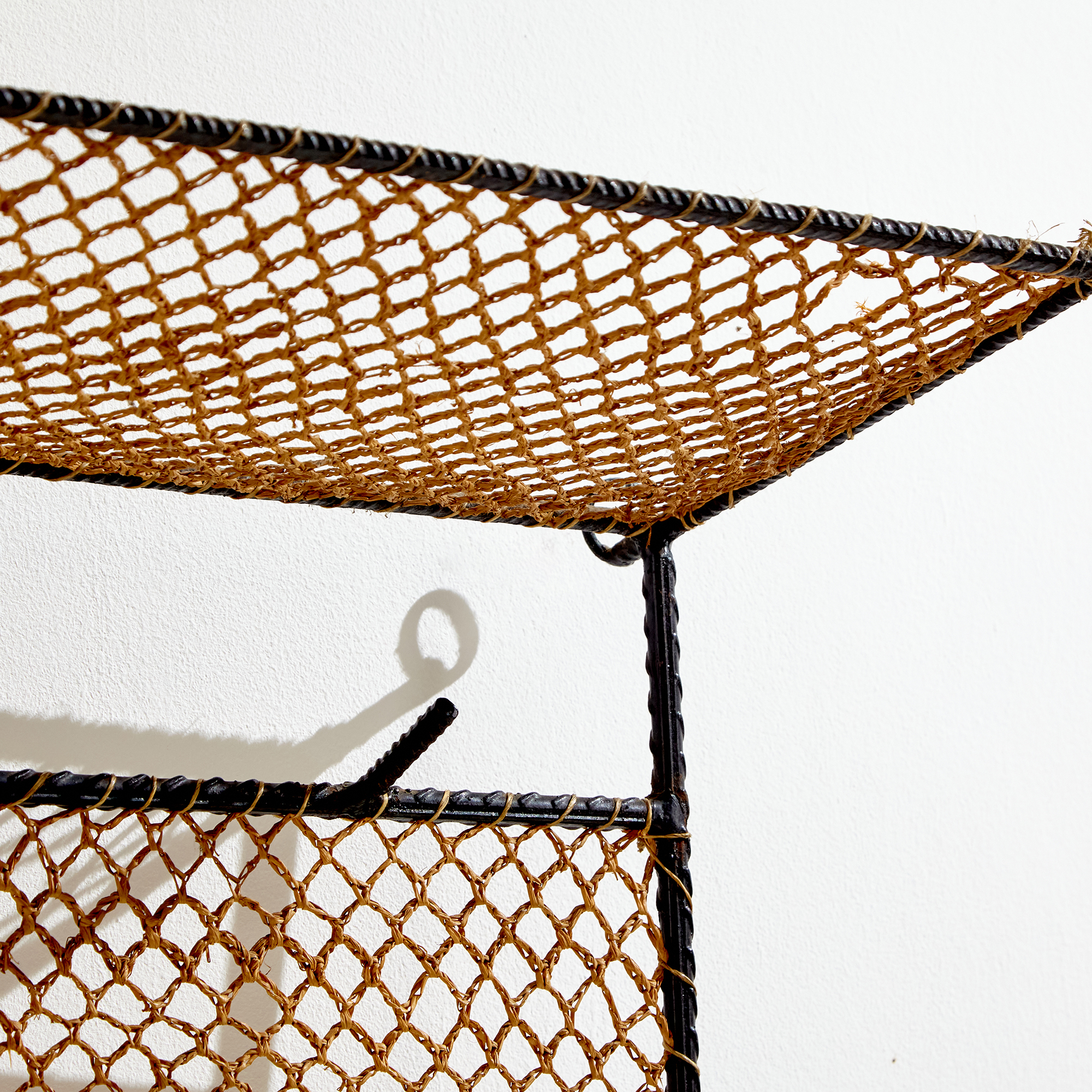 Rattan és fém fali fogas az 1970-es évekből. Négy akasztója mellett egy polccal is ellátott, a még nagyobb pakolófelület érdekében. Felületén helyenként karcokkal, kopásokkal és rozsdával.