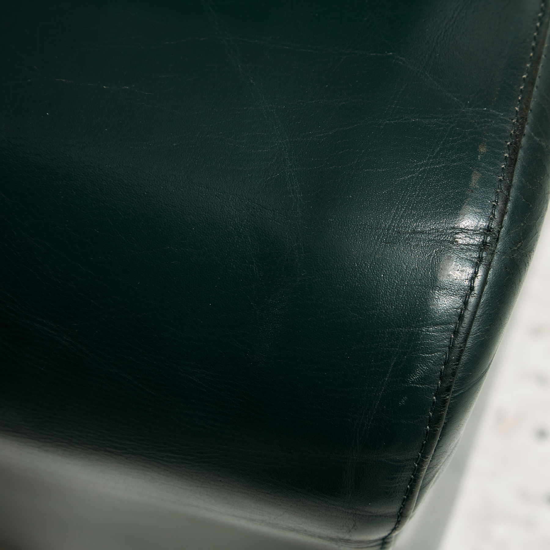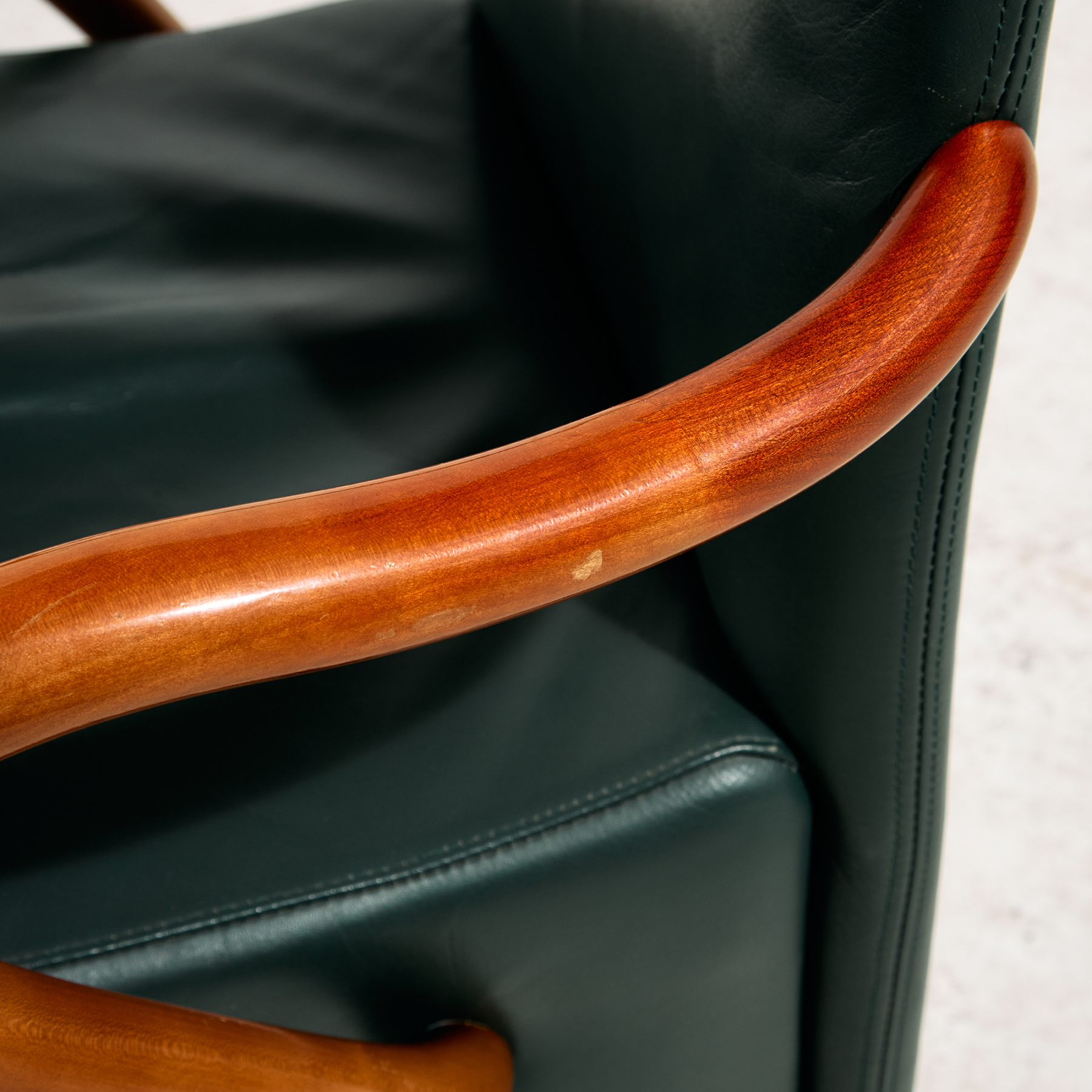 Roberto Lazzeroni által tervezett olasz karosszék az 1990-es évekből. Az ülőbútor kecses, lágy formákkal ellátott. Bükkből készült karfákkal és lábakkal, illetve kényelmes bőr kárpitozást kapott. A bútor felületén helyenként karcokkal, foltokkal és kopásokkal, némi használatból adódó nyomokkal.