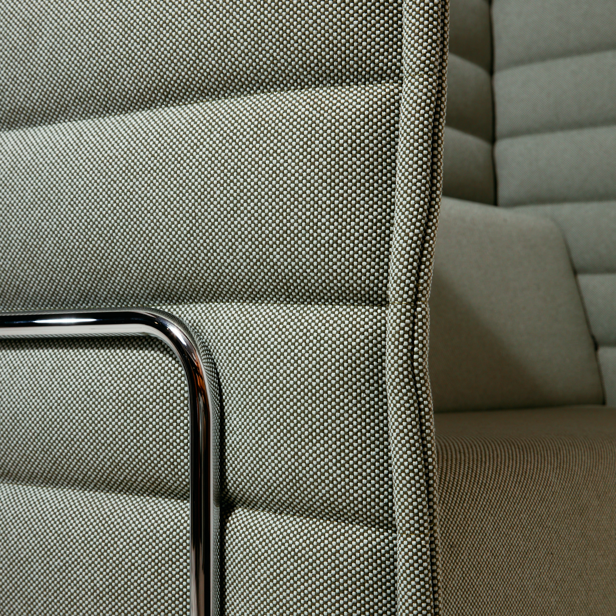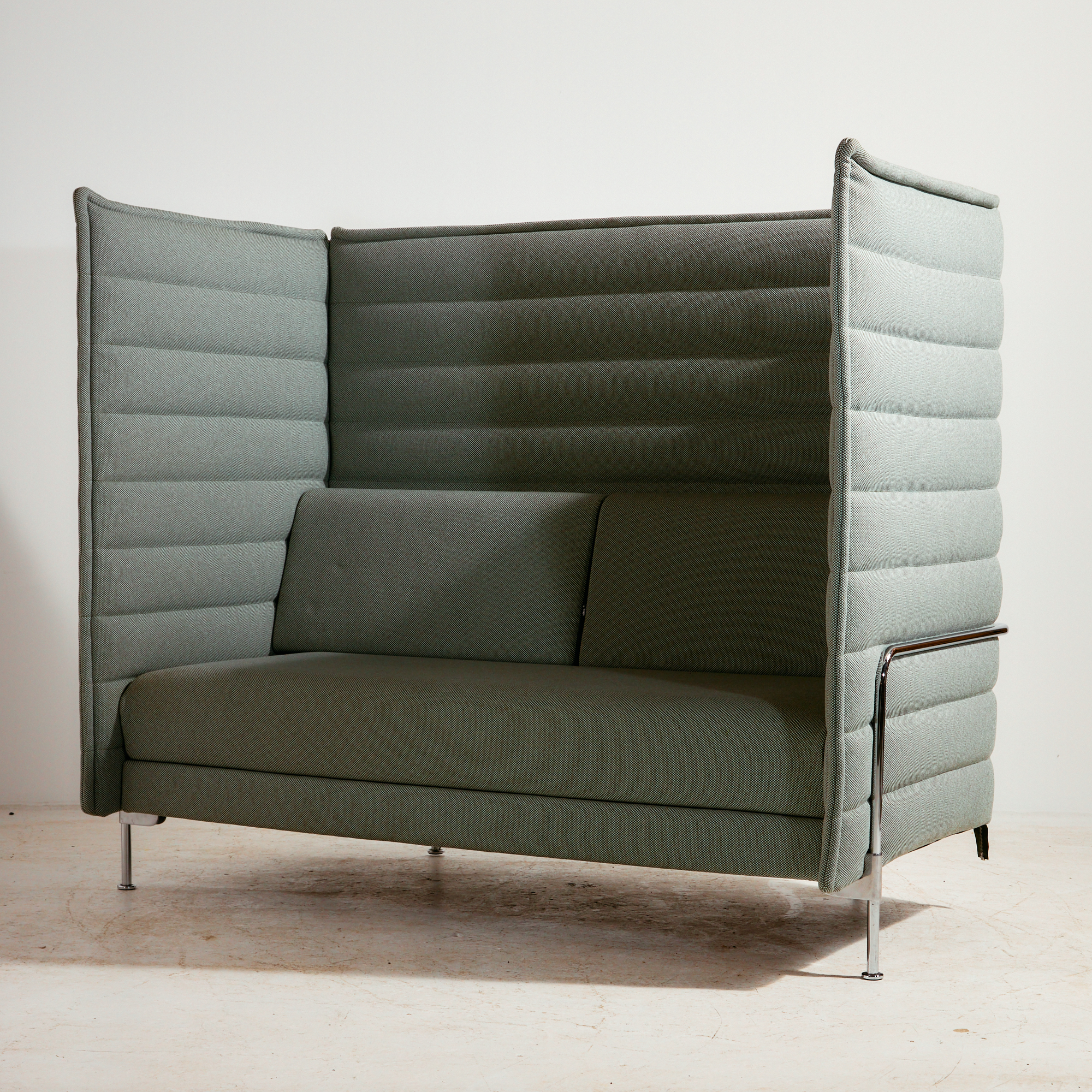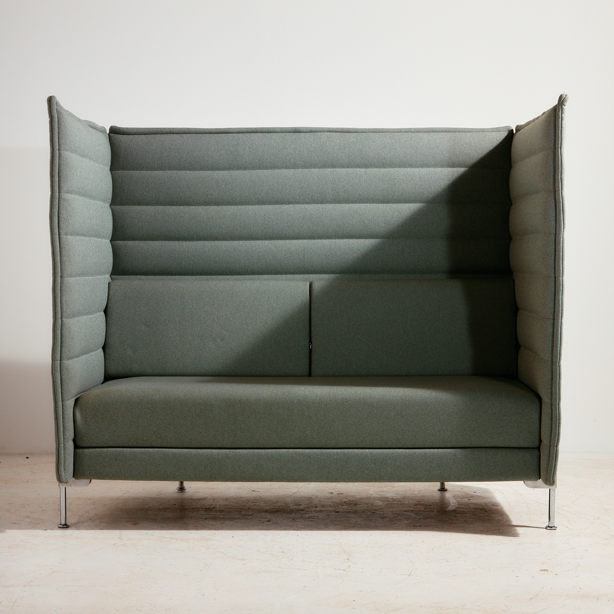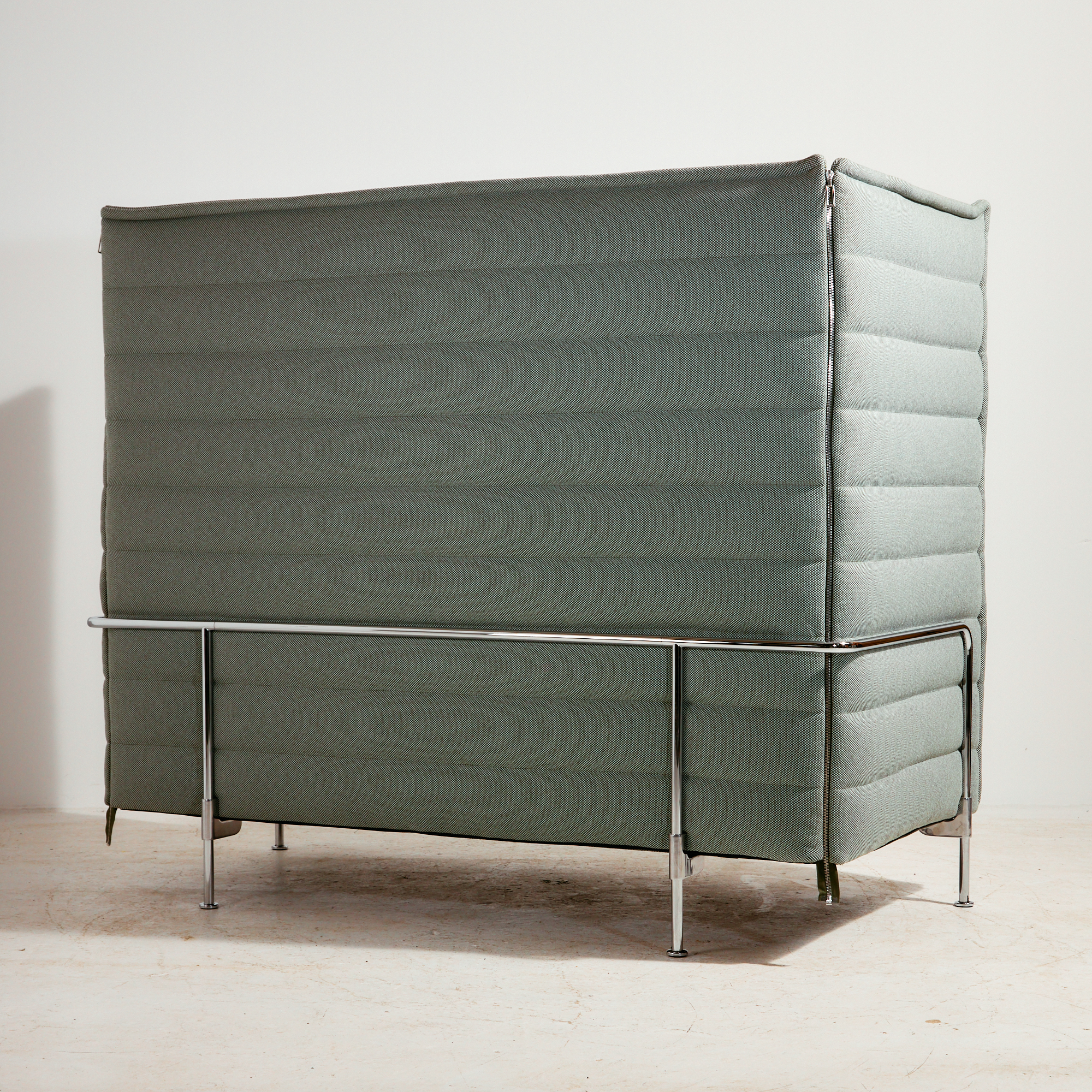 Ronan és Erwan Bouroullec által a Vitra számára tervezett ‘Alcove Highback’ kétszemélyes kanapé a 2000-es évekből. A kanapét elsősorban irodai használatra tervezték, hiszen formai kialakításának köszönhetően egy forgalmas környezetben is képes azonnal privát teret képezni. A kanapé kényelmes textil kárpitozással és króm csővázas acél szerkezettel ellátott. Krómozott szerkezetén helyenként apró felületi karcokkal. A kanapé egyaránt megállja a helyét irodai és otthoni környezetben is.