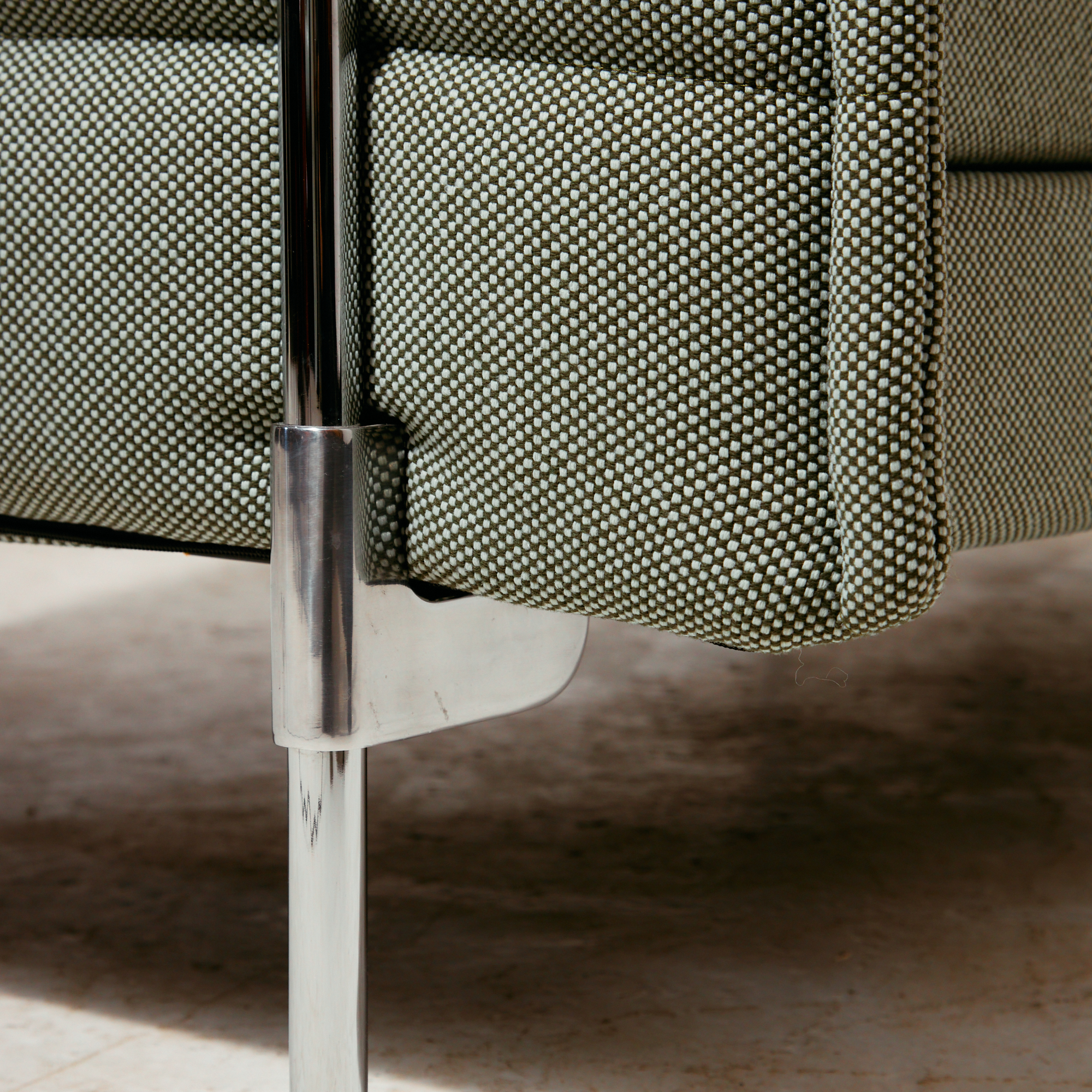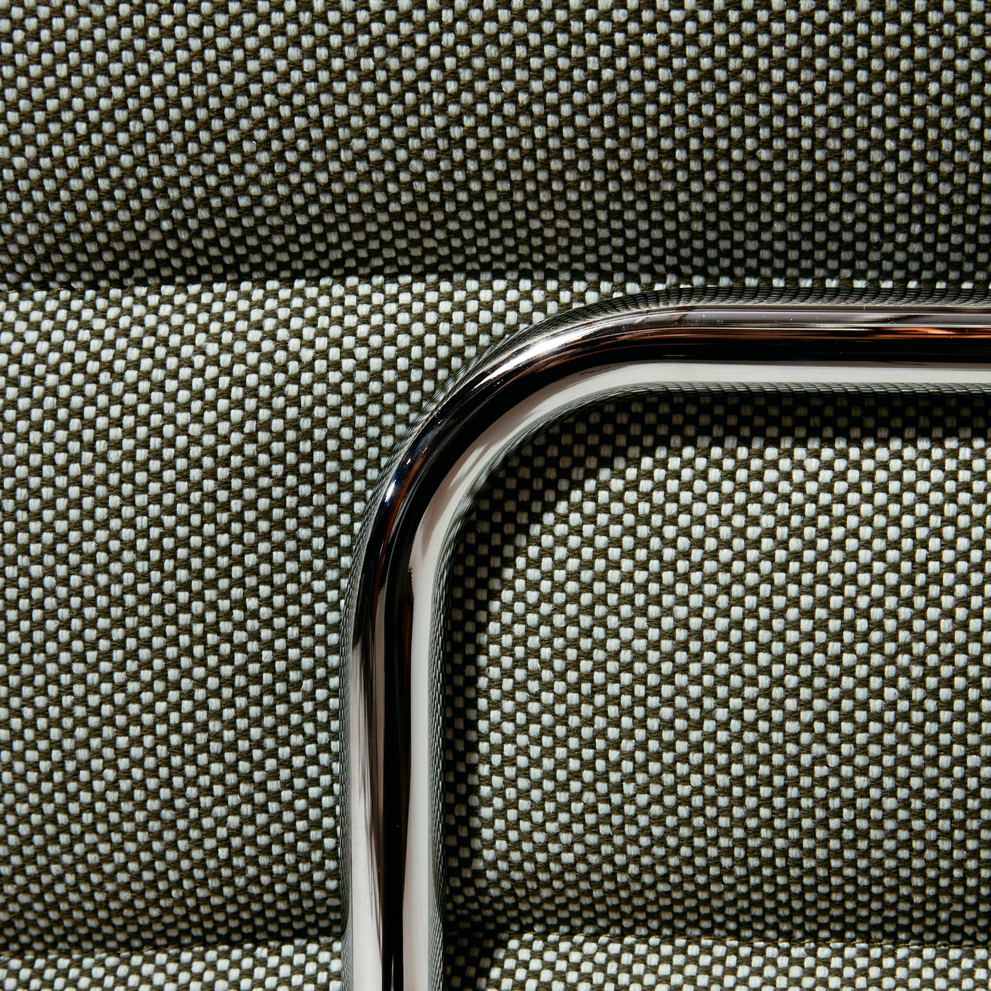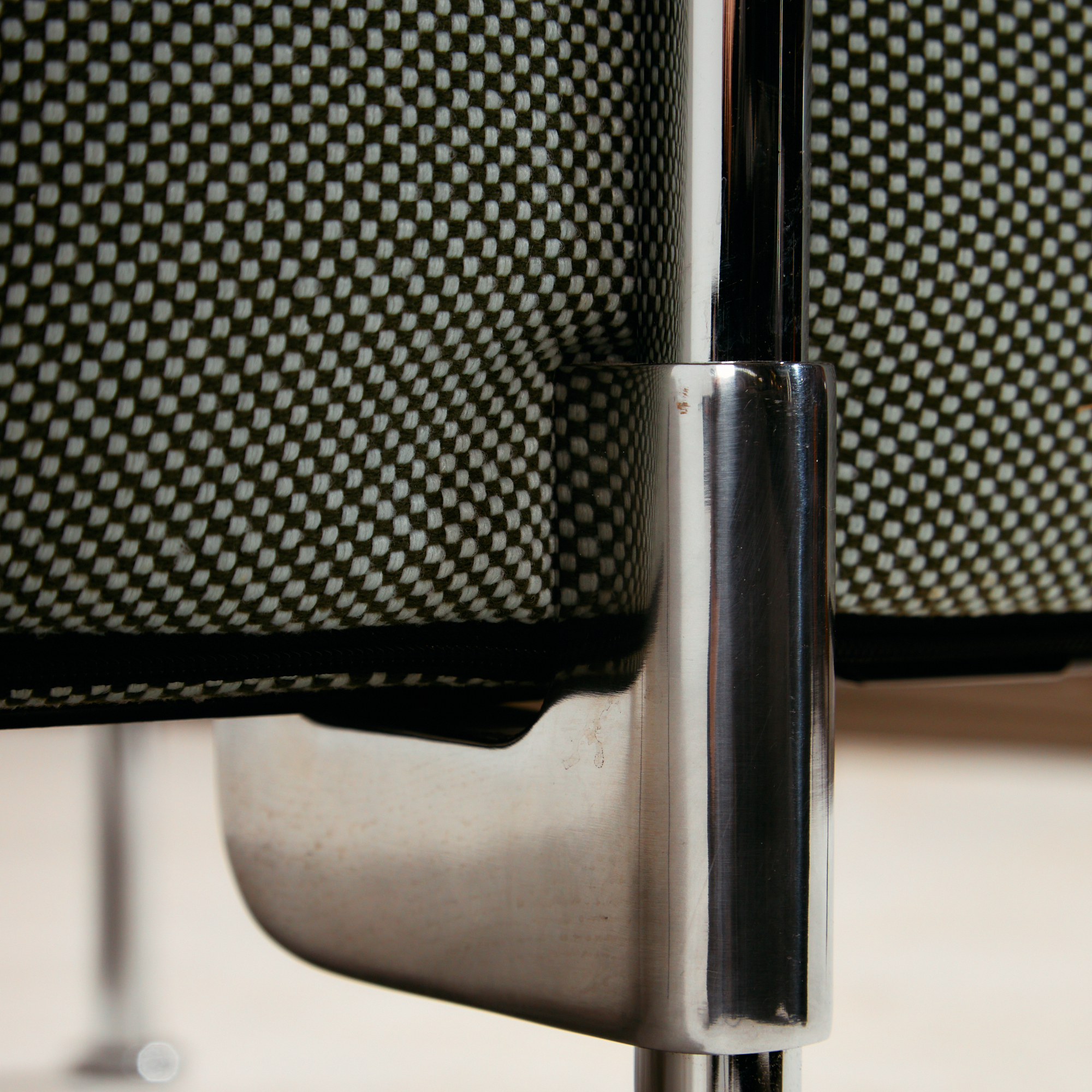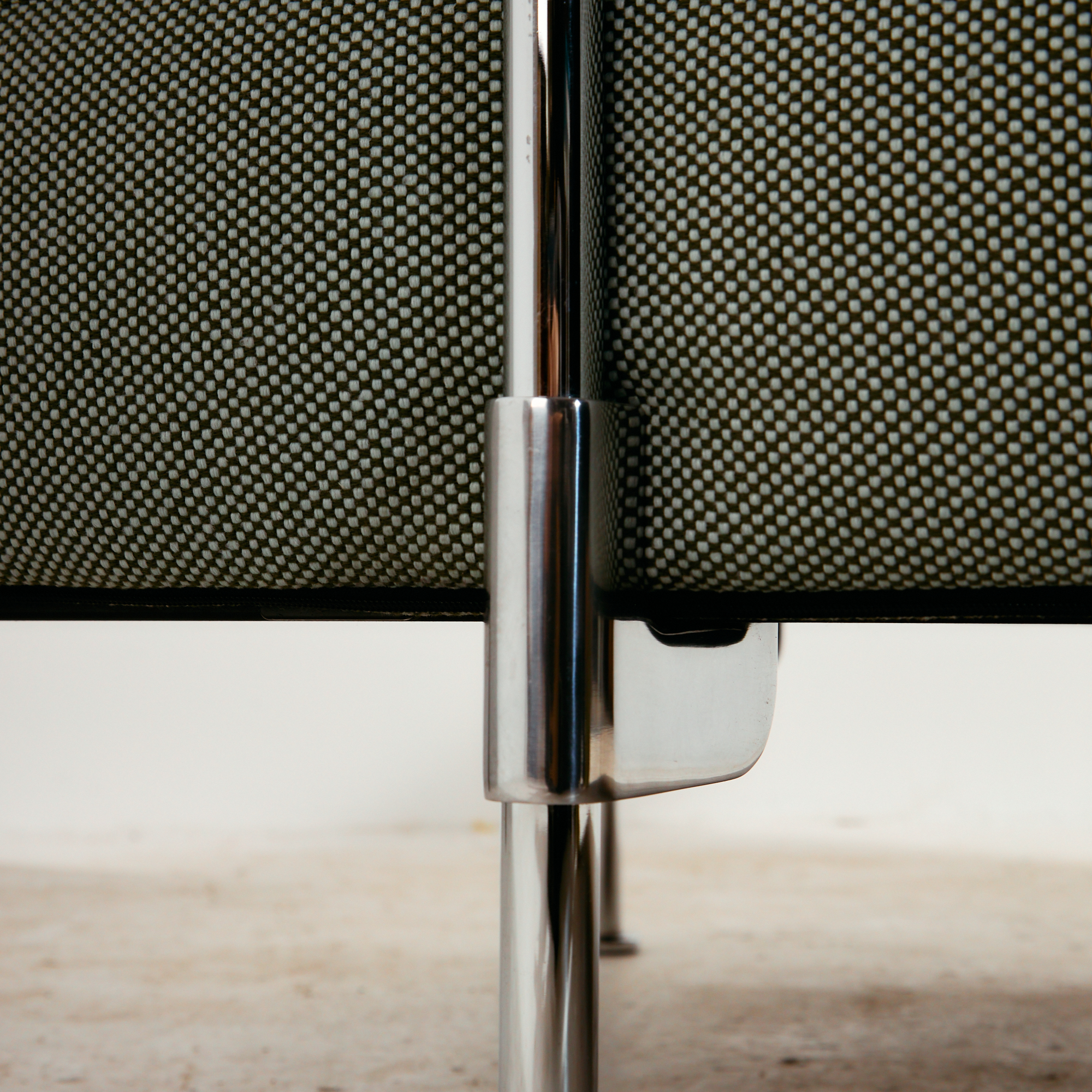 Ronan és Erwan Bouroullec által a Vitra számára tervezett ‘Alcove Highback’ kétszemélyes kanapé a 2000-es évekből. A kanapét elsősorban irodai használatra tervezték, hiszen formai kialakításának köszönhetően egy forgalmas környezetben is képes azonnal privát teret képezni. A kanapé kényelmes textil kárpitozással és króm csővázas acél szerkezettel ellátott. Krómozott szerkezetén helyenként apró felületi karcokkal. A kanapé egyaránt megállja a helyét irodai és otthoni környezetben is.