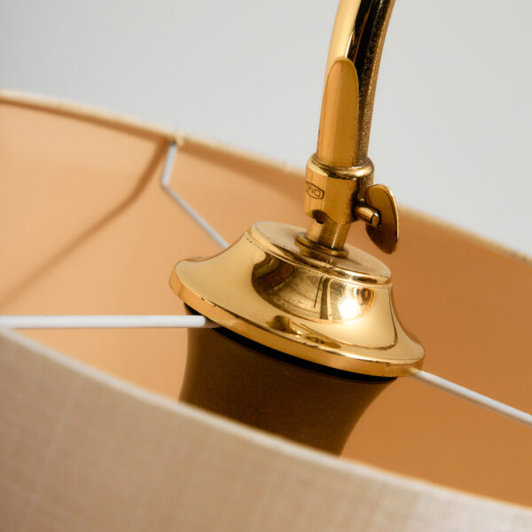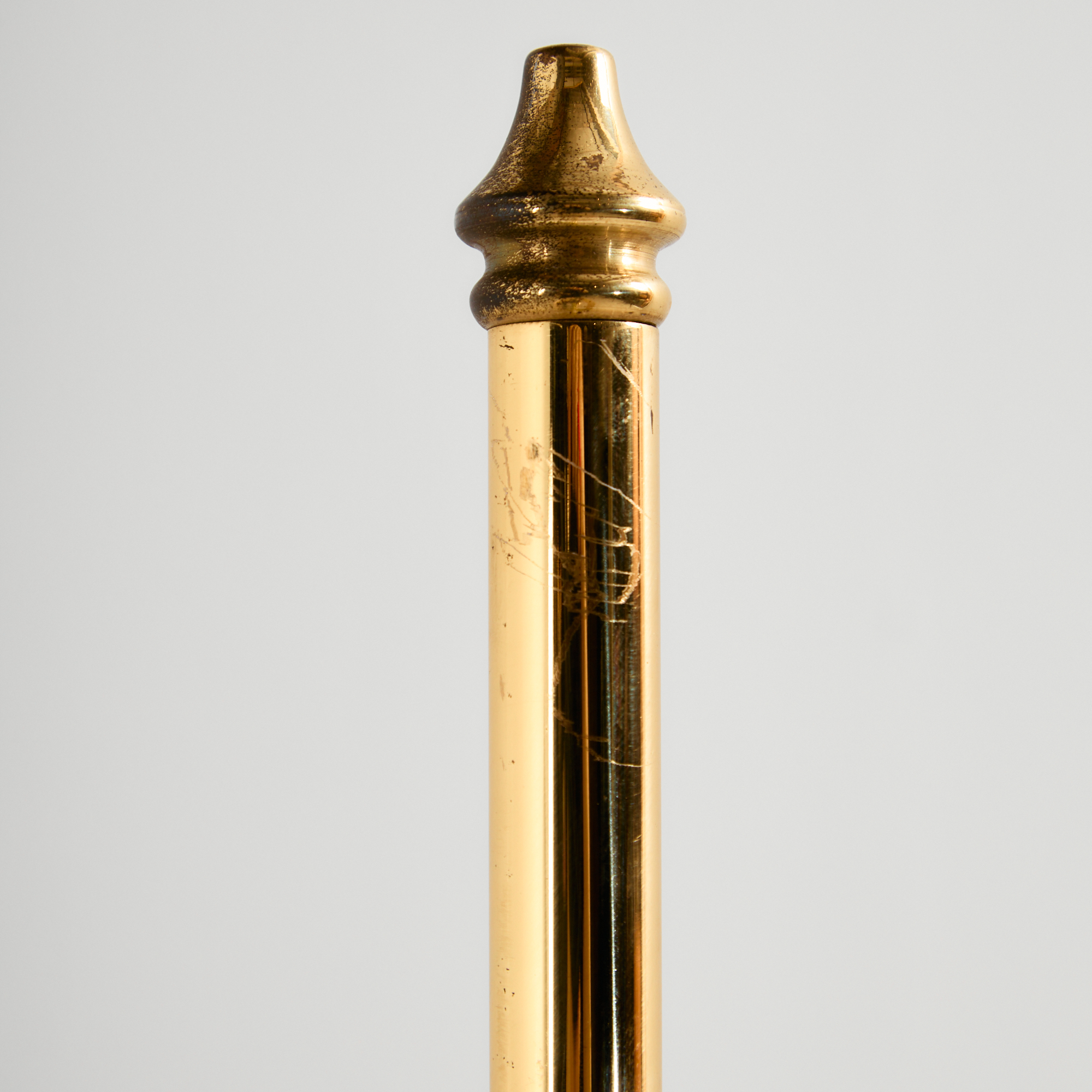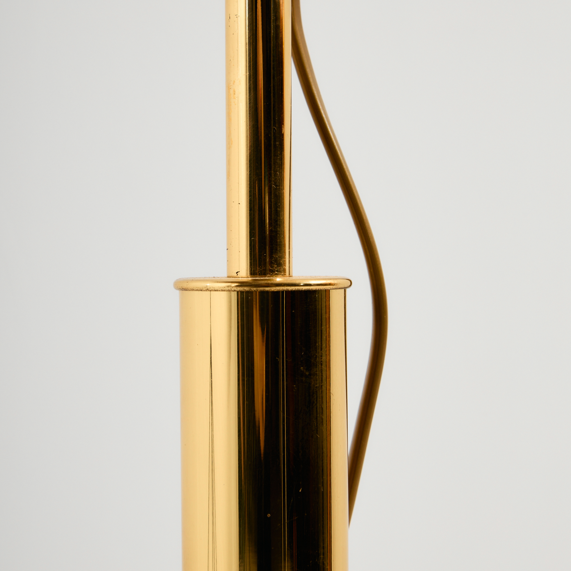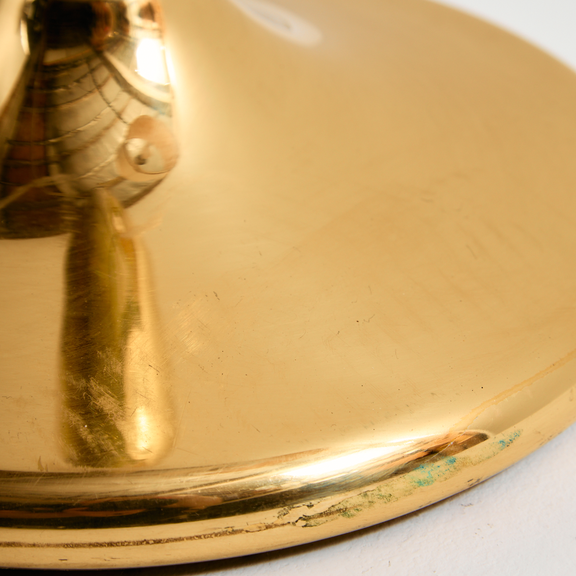 Egy igazán klasszikus és elegáns darab. Kerekded formákkal ellátott sárgaréz állólámpa az 1970-es évekből. A búra magassága és dőlésszöge állítható, így a környezet megvilágítására és hangulatvilágításnak is tökéletes. A lámpa felületén helyenként karcokkal, foltokkal és kopásokkal. Fém felülete helyenként oxidálódott.
