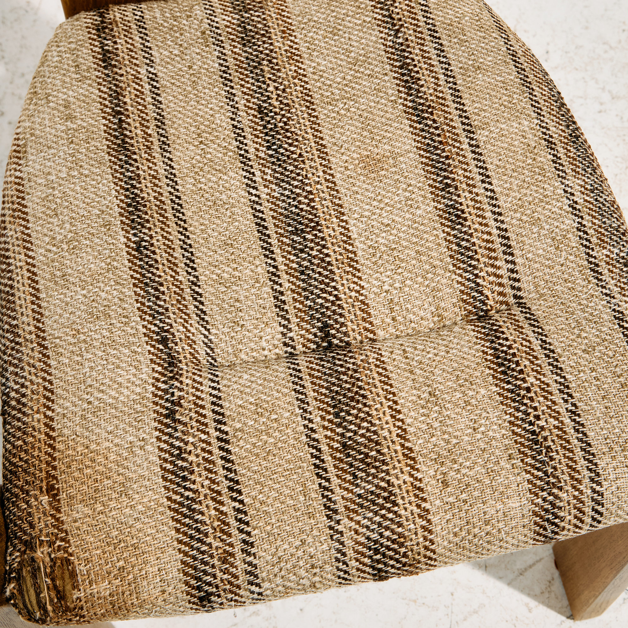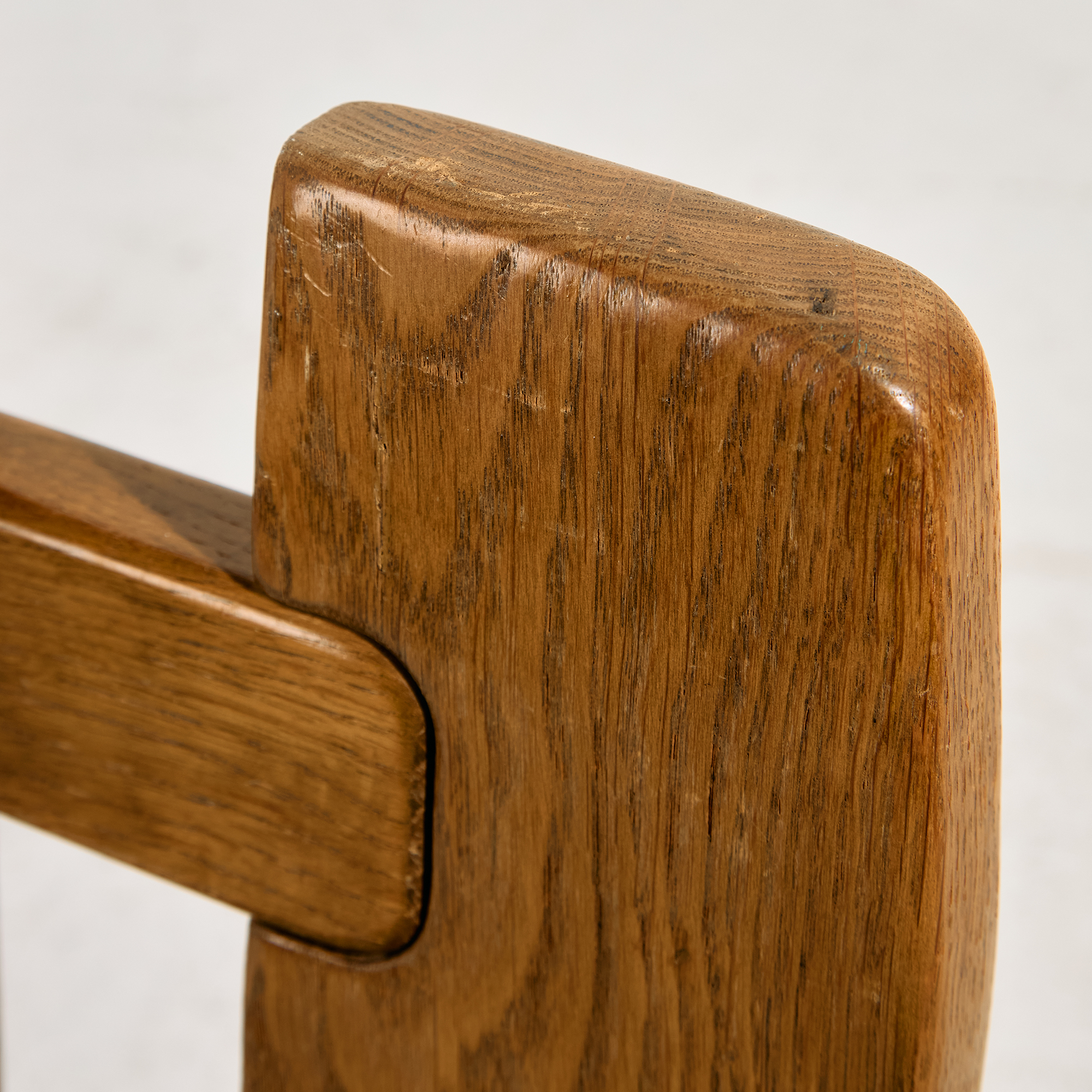Tömör tölgy étkezőszék szoborszerű háttámlával és kényelmes textil kárpitozással az 1980-as évekből. Az ülőbútor felületén helyenként karcokkal, foltokkal és kopásokkal.