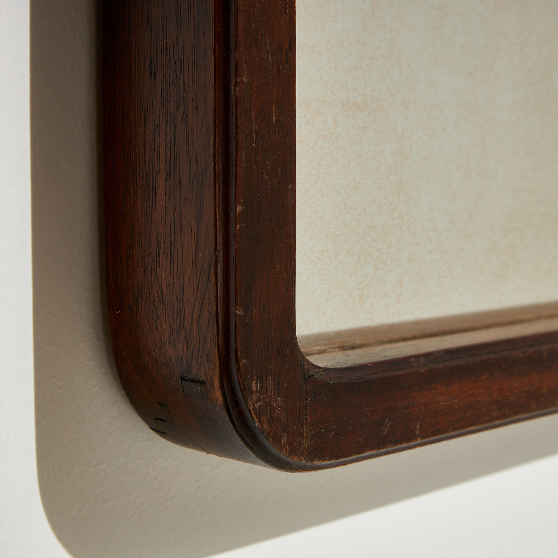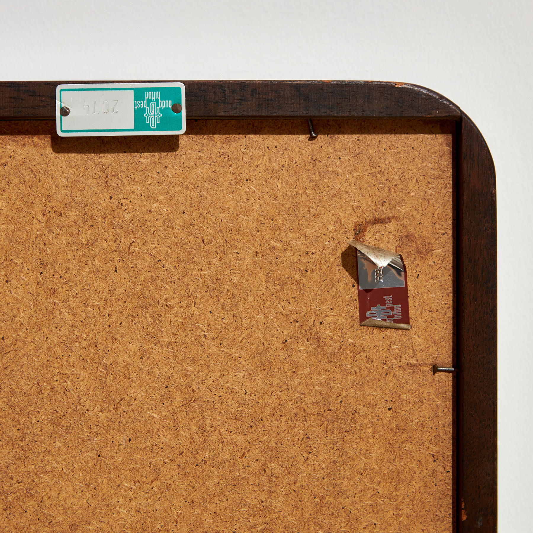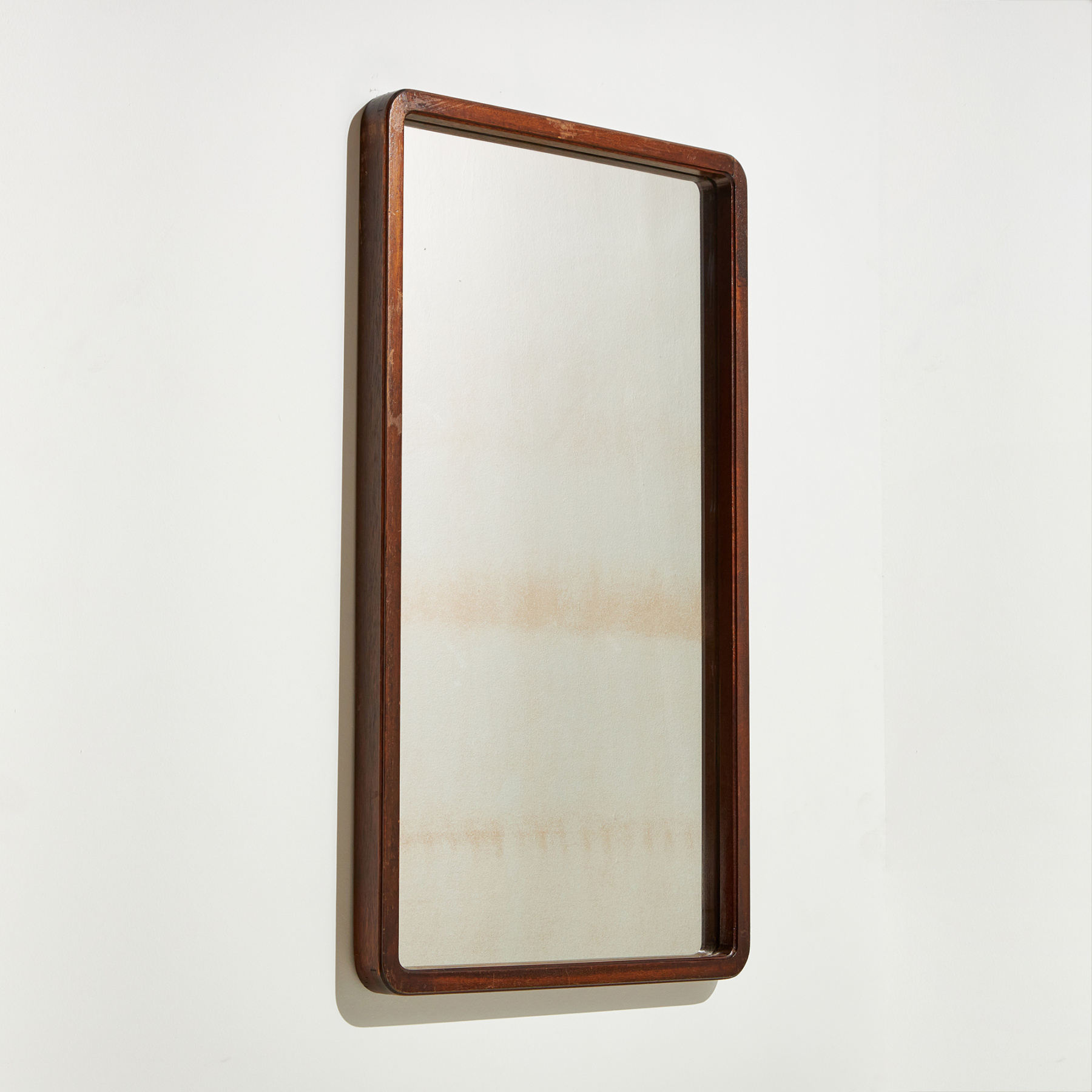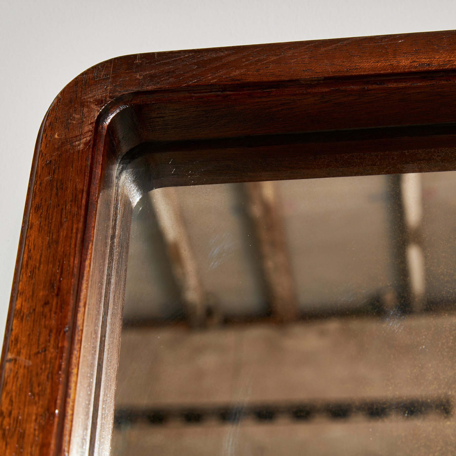 Pácolt tölgykeretes tükör az 1970-es évekből. Üveg és fa felületén helyenként karcokkal, foltokkal és kopásokkal.