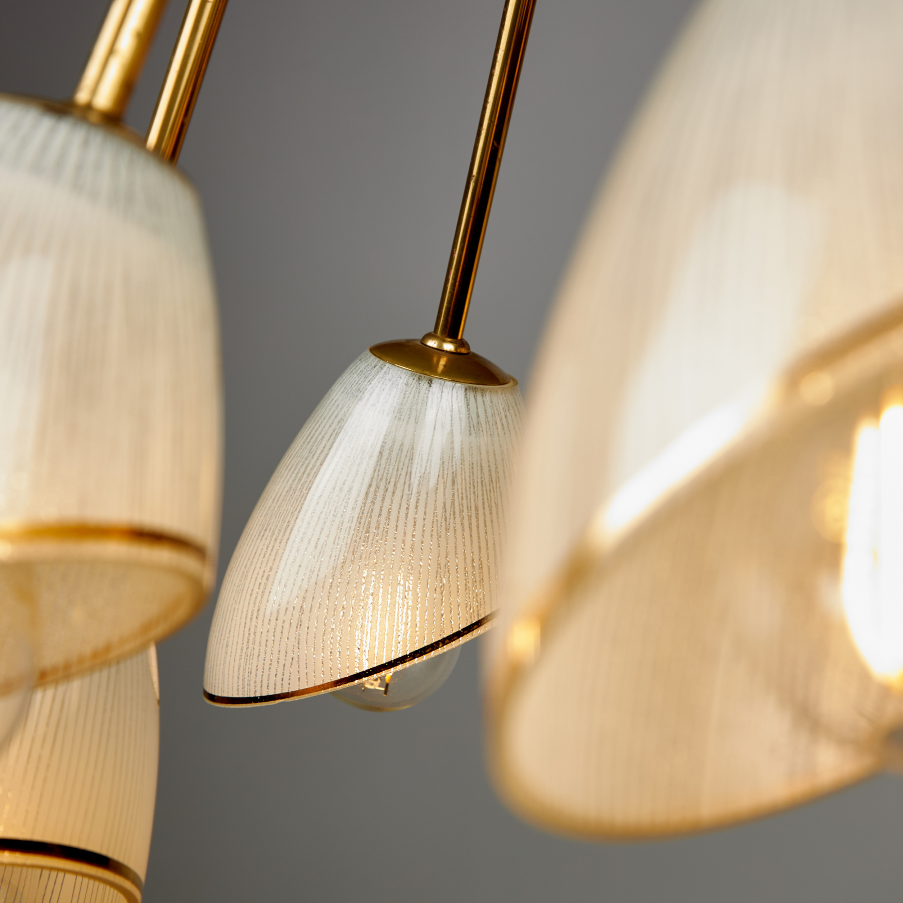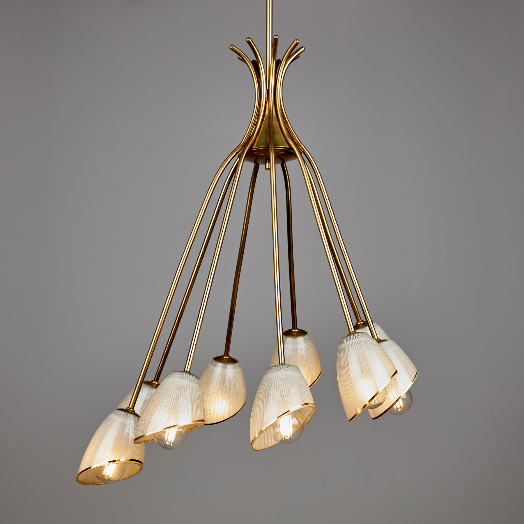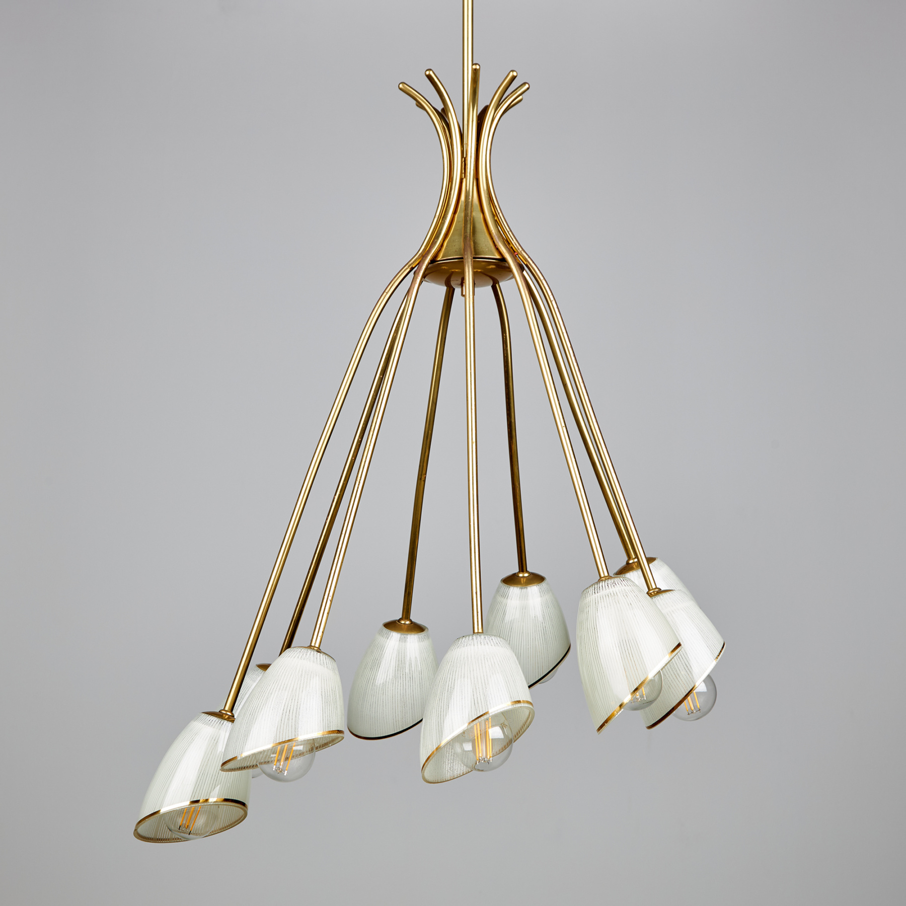 Impozáns, nagyobb méretű 9 karos sárgaréz csillár matt texturált üveg búrákkal az 1950-es évekből. A függeszték üveg és fém felületén helyenként karcokkal és kopásokkal.
