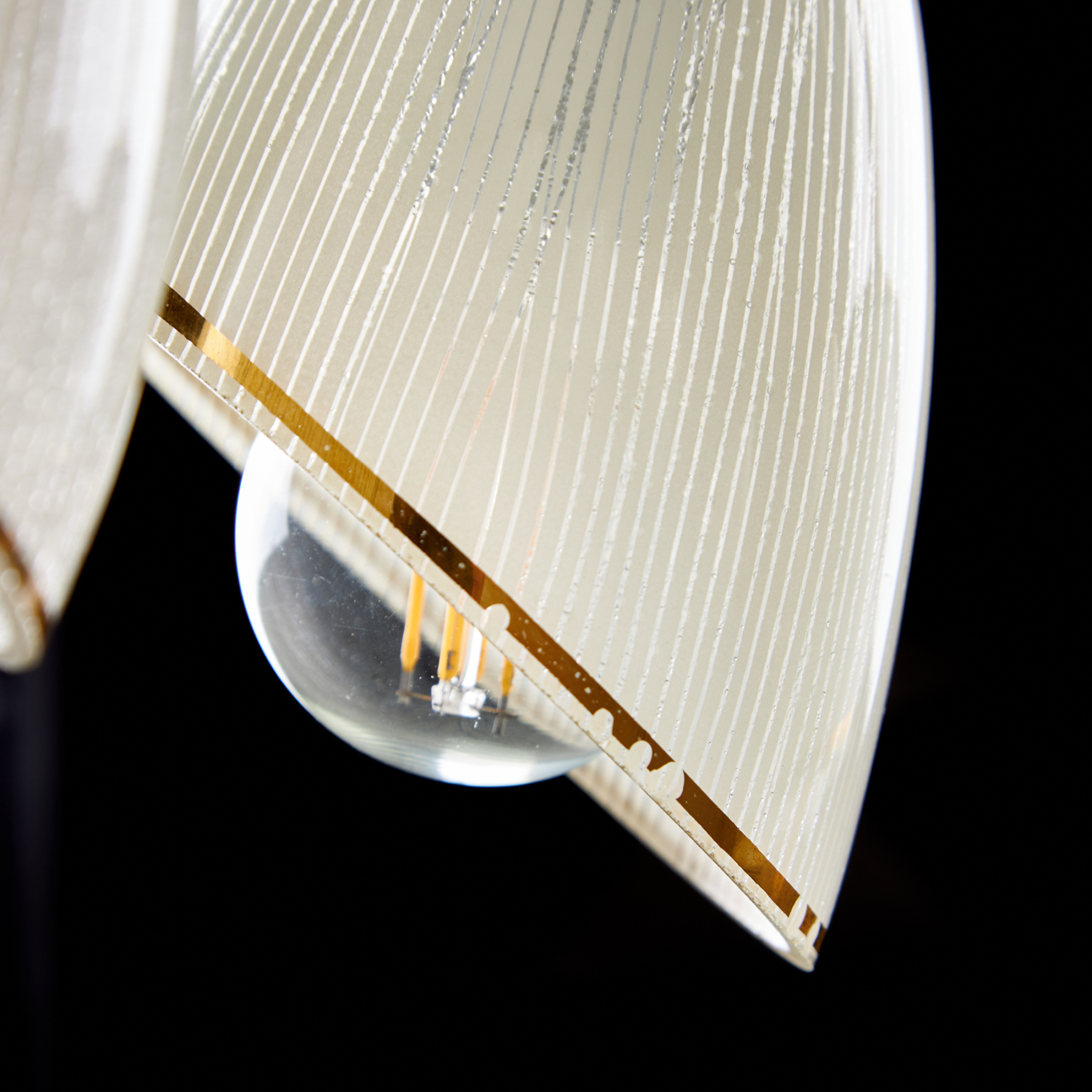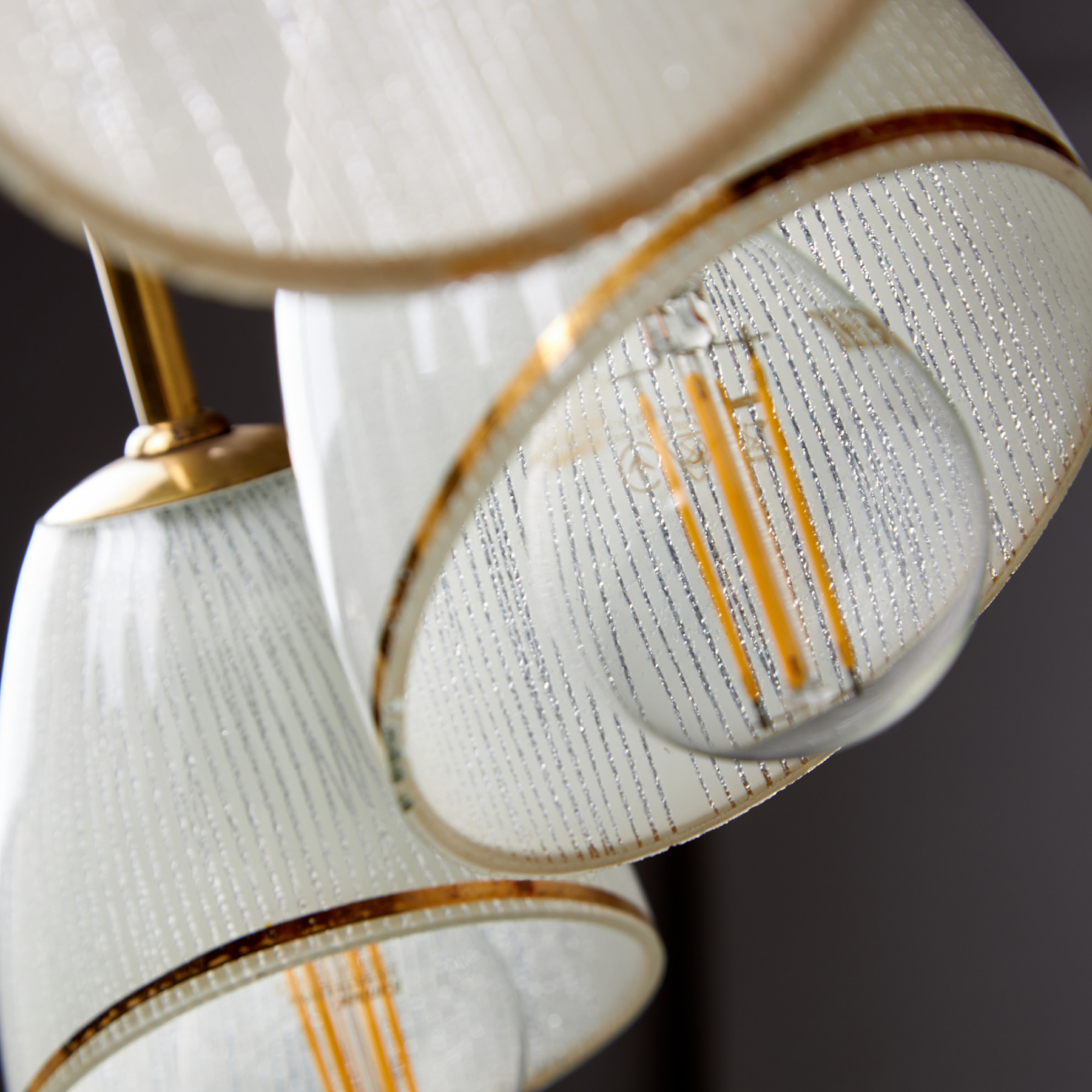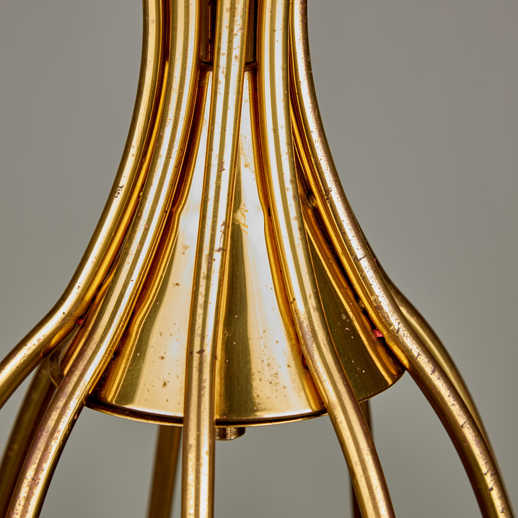 Impozáns, nagyobb méretű 9 karos sárgaréz csillár matt texturált üveg búrákkal az 1950-es évekből. A függeszték üveg és fém felületén helyenként karcokkal és kopásokkal.